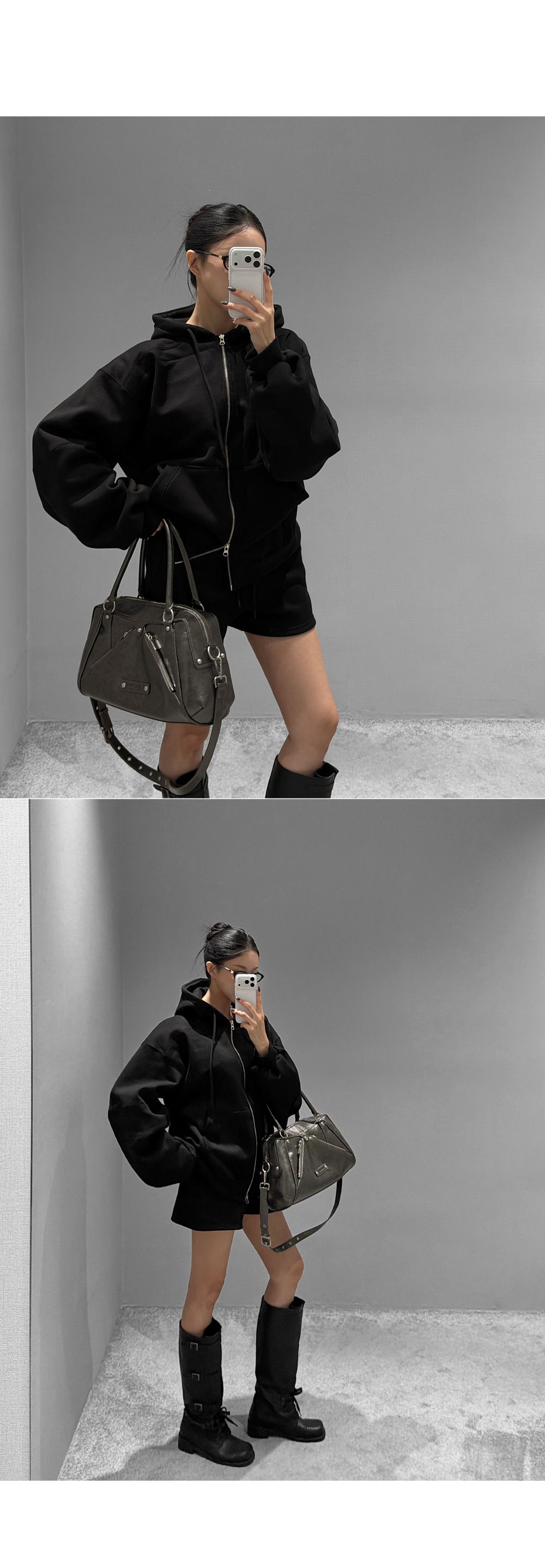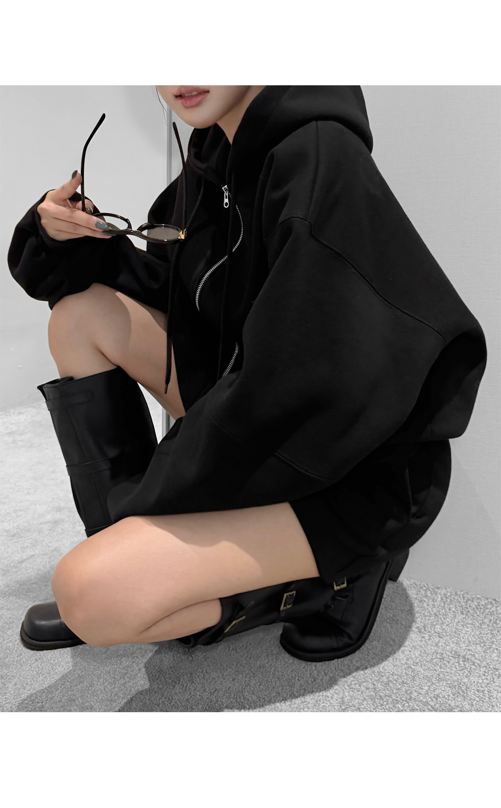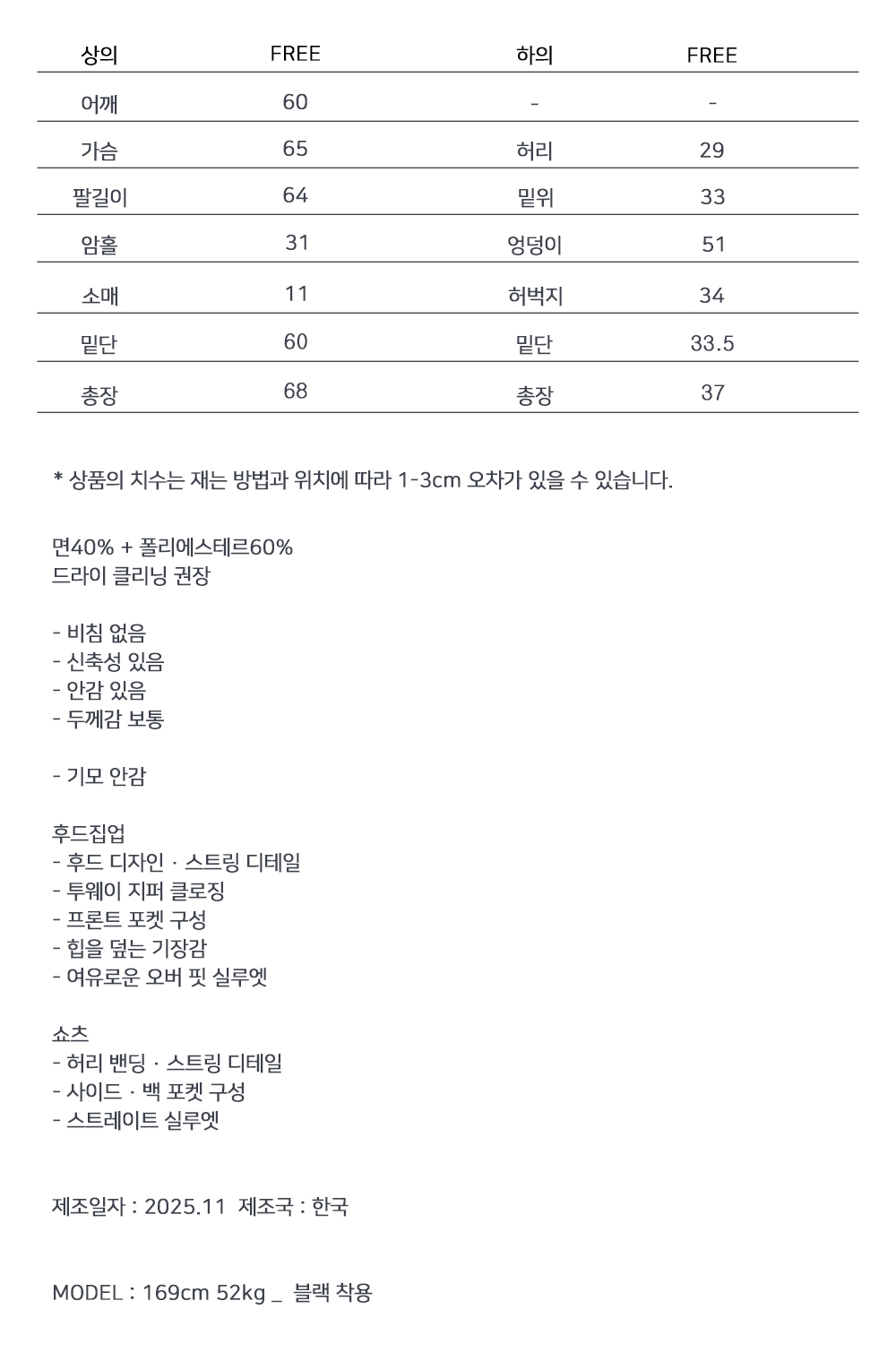 하나만으로 겨울 데일리 무드를 완성해주는 기모 후드집업+쇼츠 세트입니다. 포근한 기모 안감이 편안한 보온력을 더해주며, 오버 핏 후드집업과 미니 쇼츠의 조합으로 데일리부터 스트릿 무드까지 폭넓게 연출됩니다.