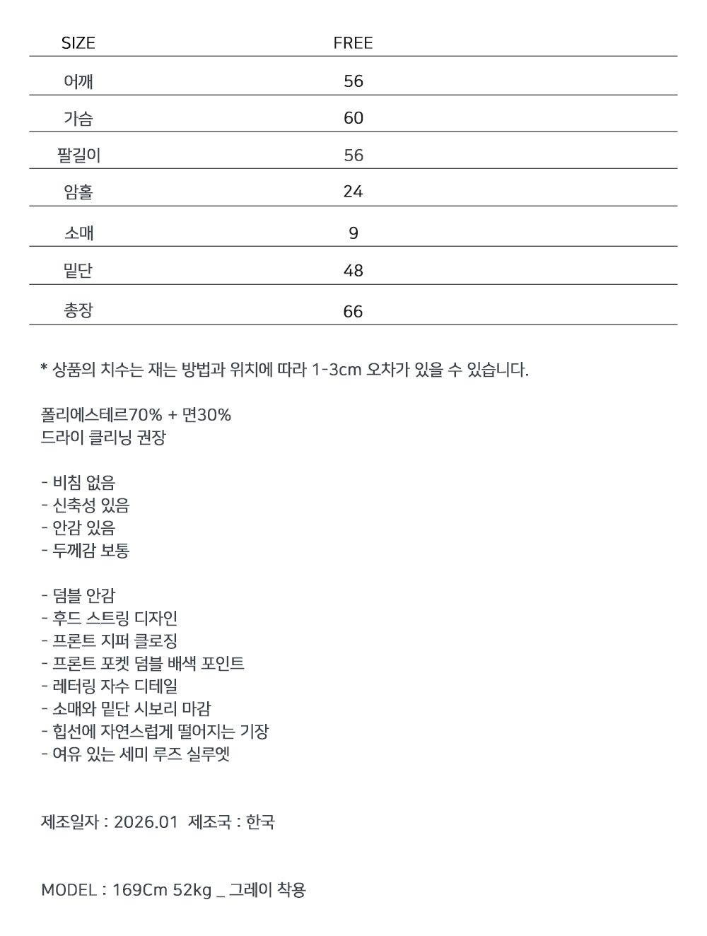 포근한 덤블 안감과 레터링 자수 포인트가 어우러진 후드 집업입니다. 캐주얼한 실루엣에 덤블 배색 디테일을 더해 단정하면서도 감도 있는 무드를 연출하며, 셋업 또는 단독으로도 활용도 높게 착용할 수 있습니다.