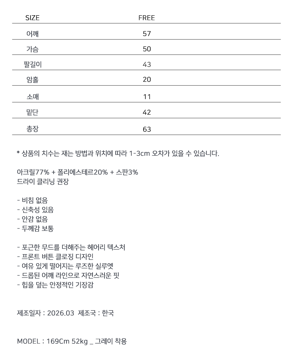 여유 있는 실루엣이 돋보이는 니트 가디건입니다. 자연스럽게 떨어지는 루즈한 핏과 힙을 덮는 기장으로 편안하면서도 세련된 무드를 연출합니다. 가볍게 걸치기 좋은 디자인으로 포인트 스타일링까지 활용도 좋은 아이템입니다.