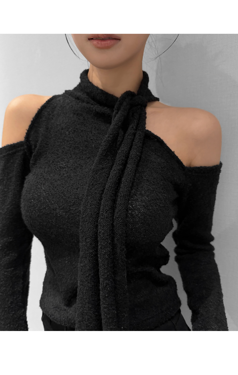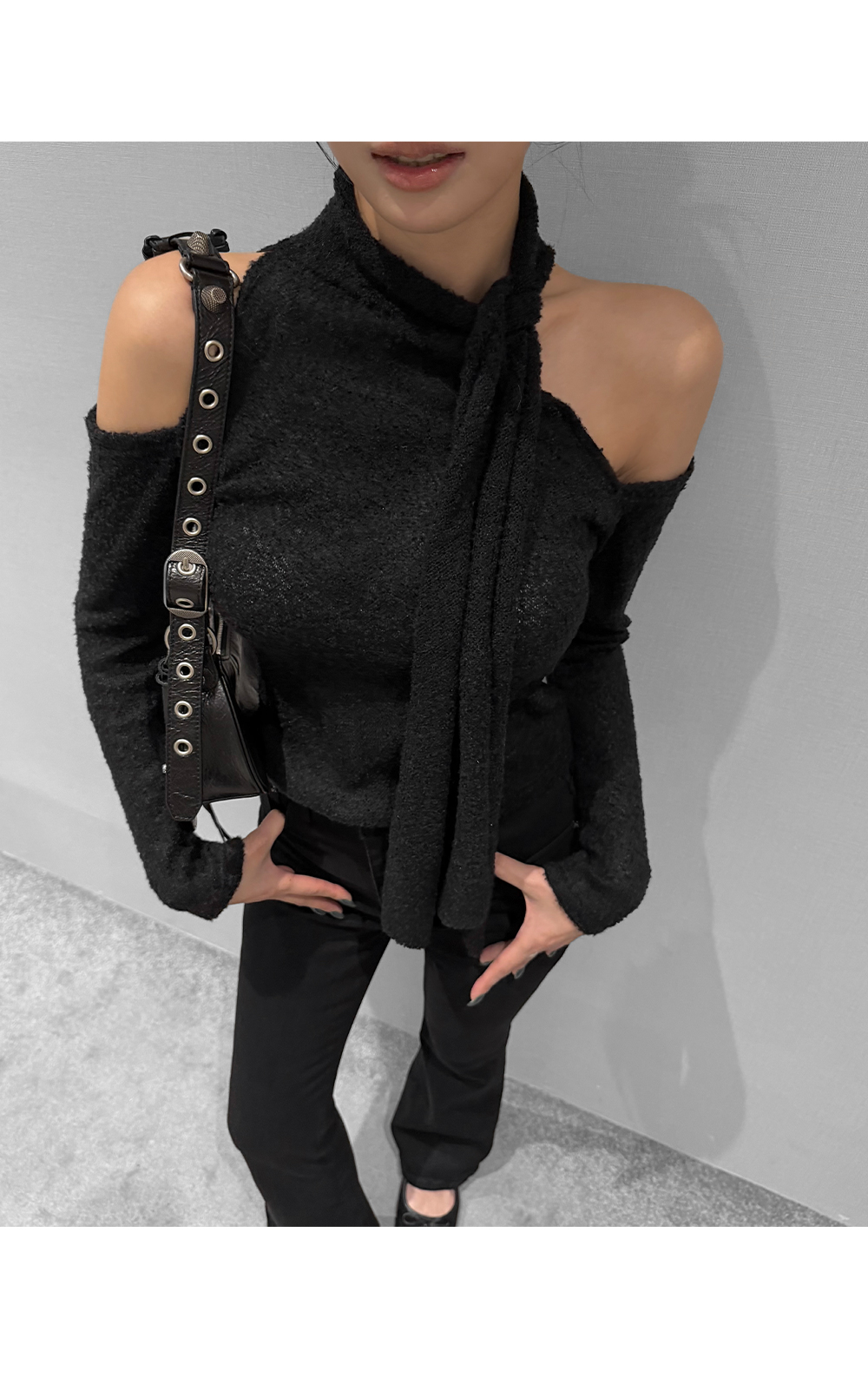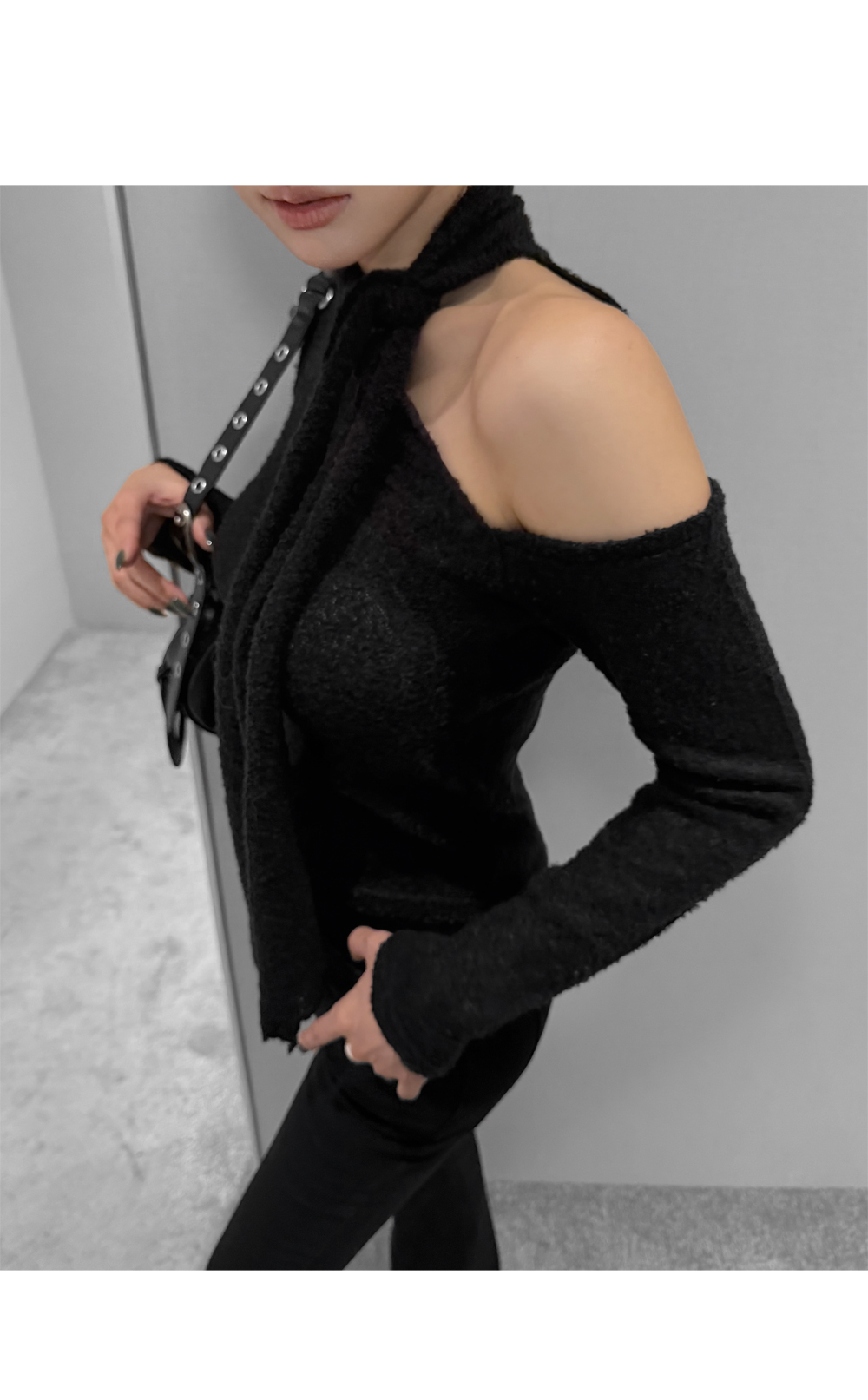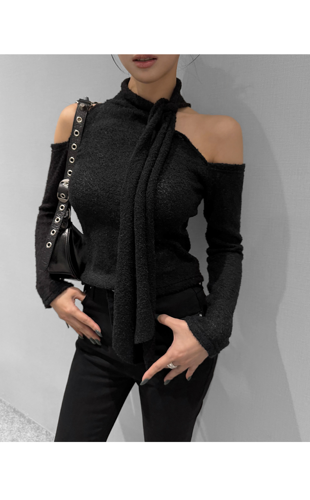 보송한 텍스처가 은근한 분위기를 더해주는 오프숄더 탑입니다. 한쪽 어깨가 자연스럽게 드러나는 언발 디자인이 포인트를 더하며, 흐르듯 떨어지는 롱 타이가 목선을 세련되게 정리해줍니다.