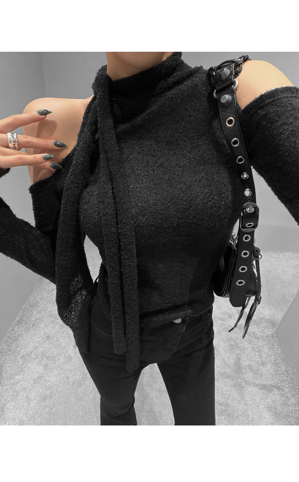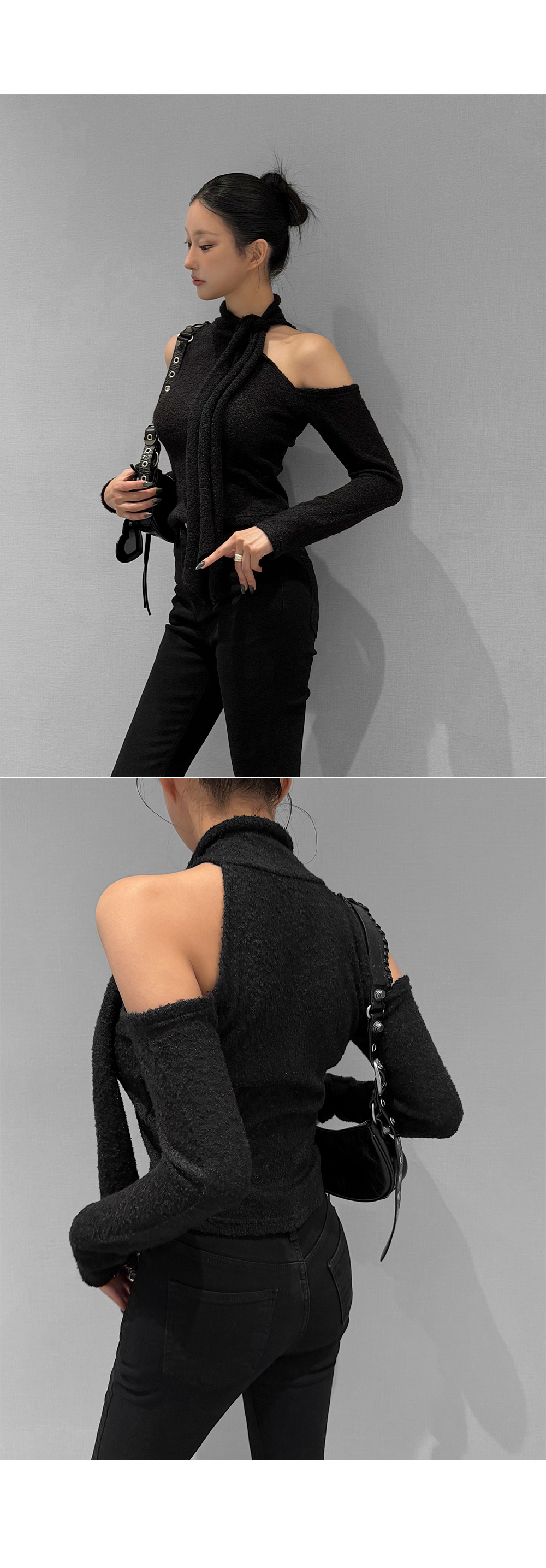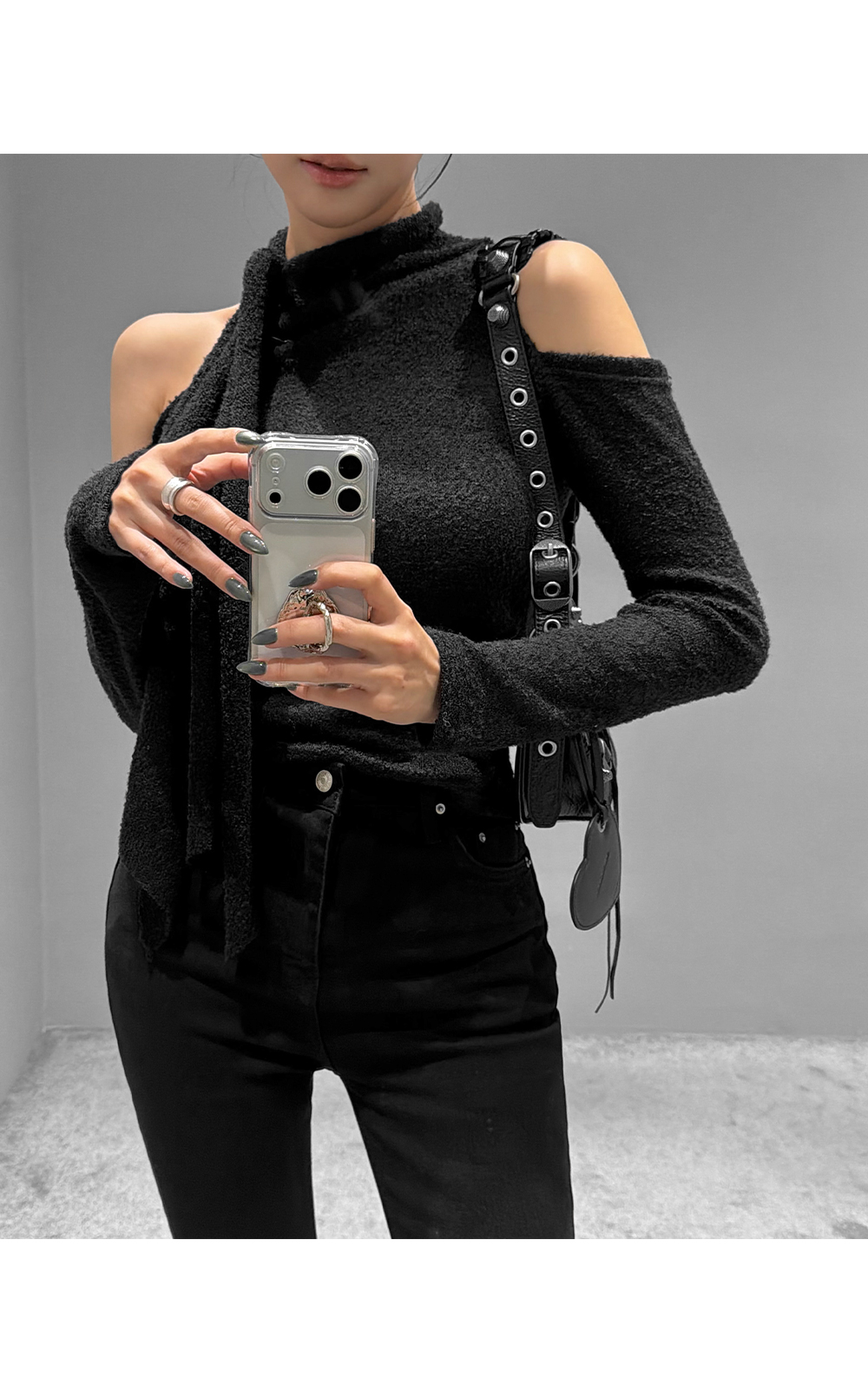 보송한 텍스처가 은근한 분위기를 더해주는 오프숄더 탑입니다. 한쪽 어깨가 자연스럽게 드러나는 언발 디자인이 포인트를 더하며, 흐르듯 떨어지는 롱 타이가 목선을 세련되게 정리해줍니다.