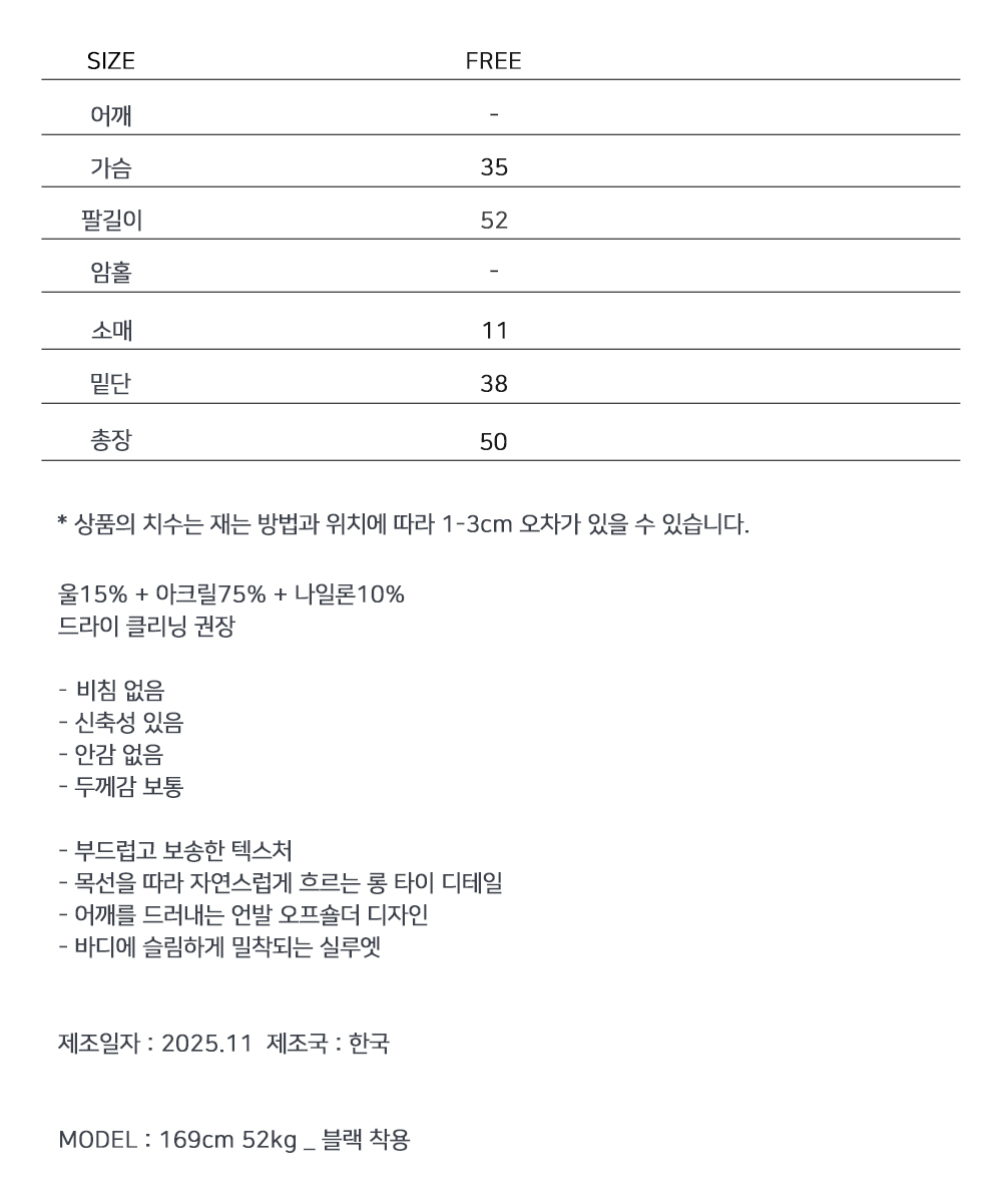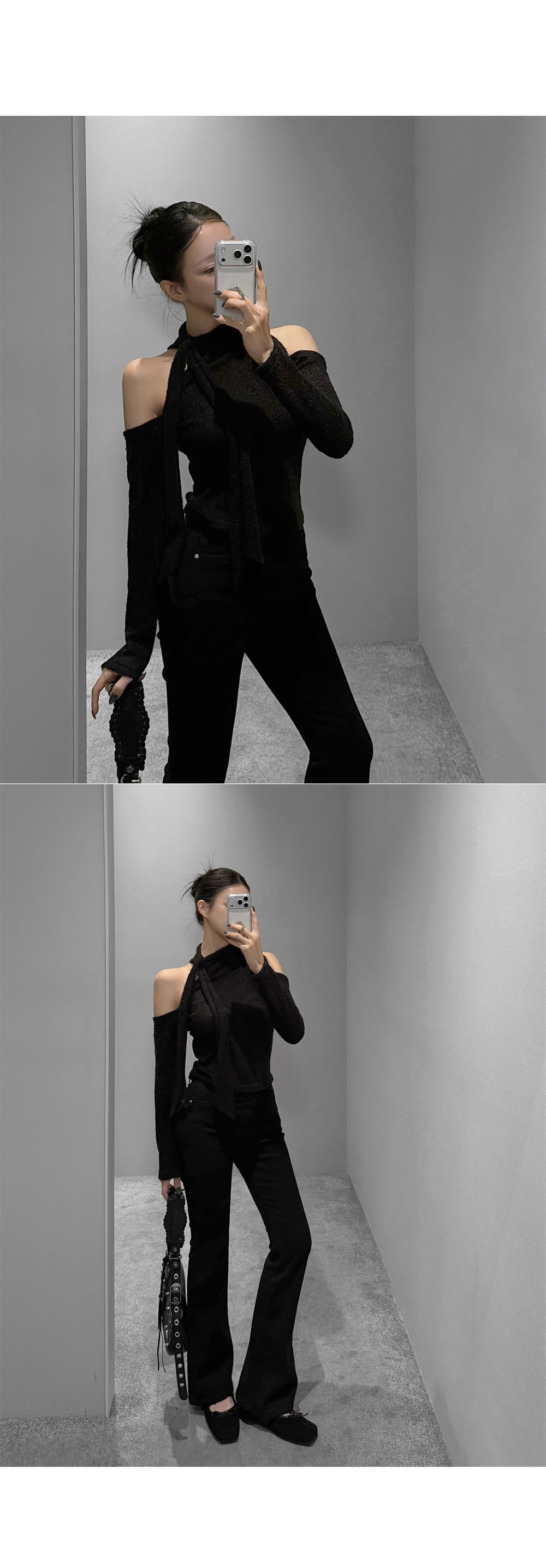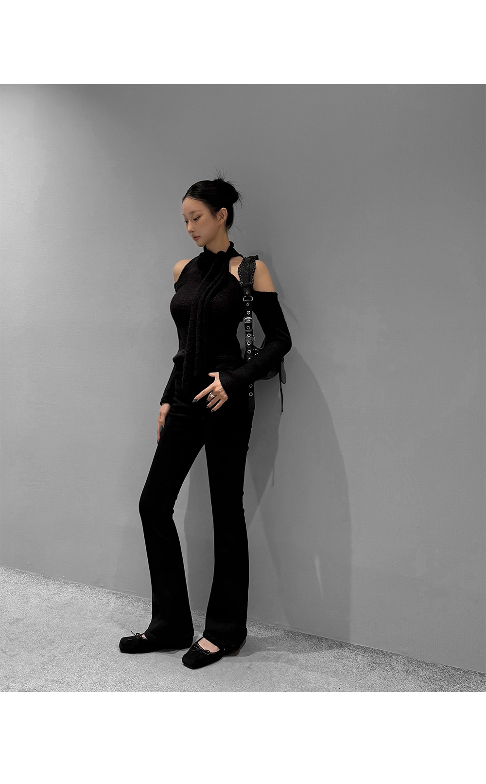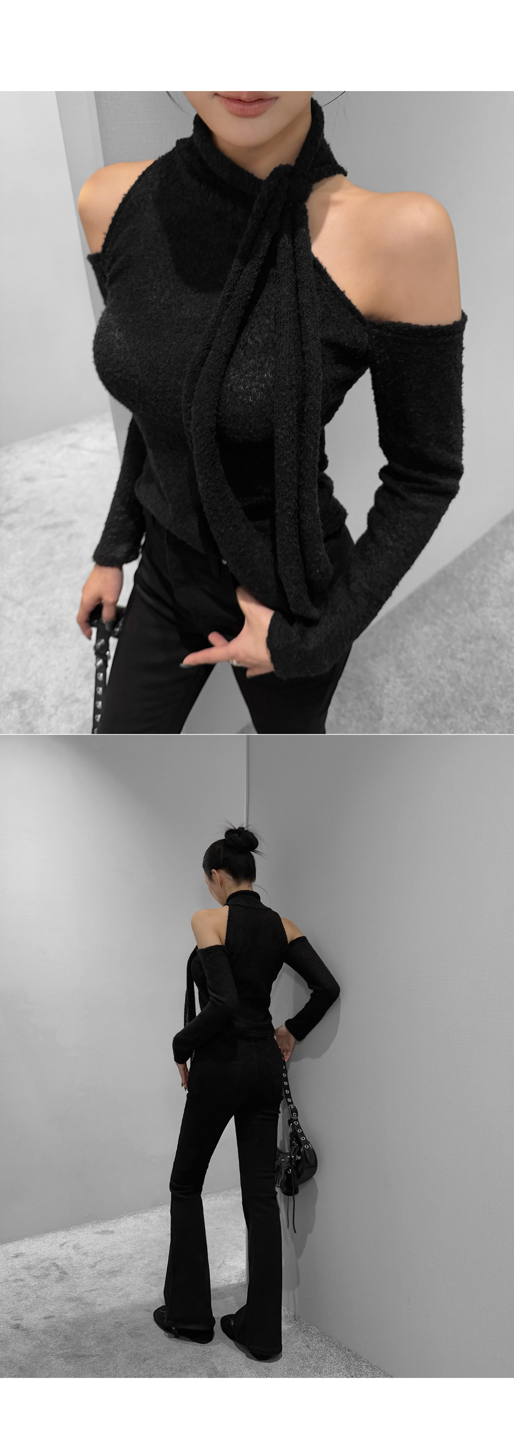 보송한 텍스처가 은근한 분위기를 더해주는 오프숄더 탑입니다. 한쪽 어깨가 자연스럽게 드러나는 언발 디자인이 포인트를 더하며, 흐르듯 떨어지는 롱 타이가 목선을 세련되게 정리해줍니다.