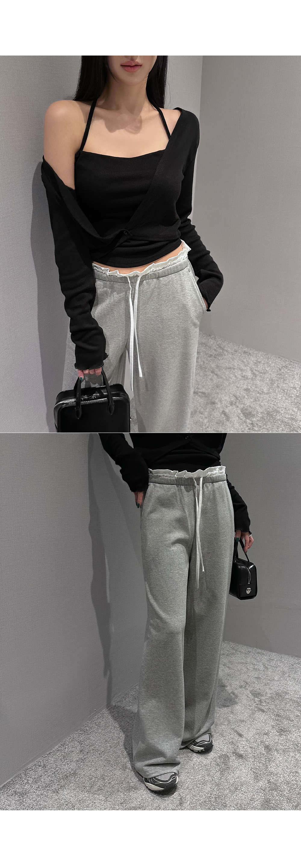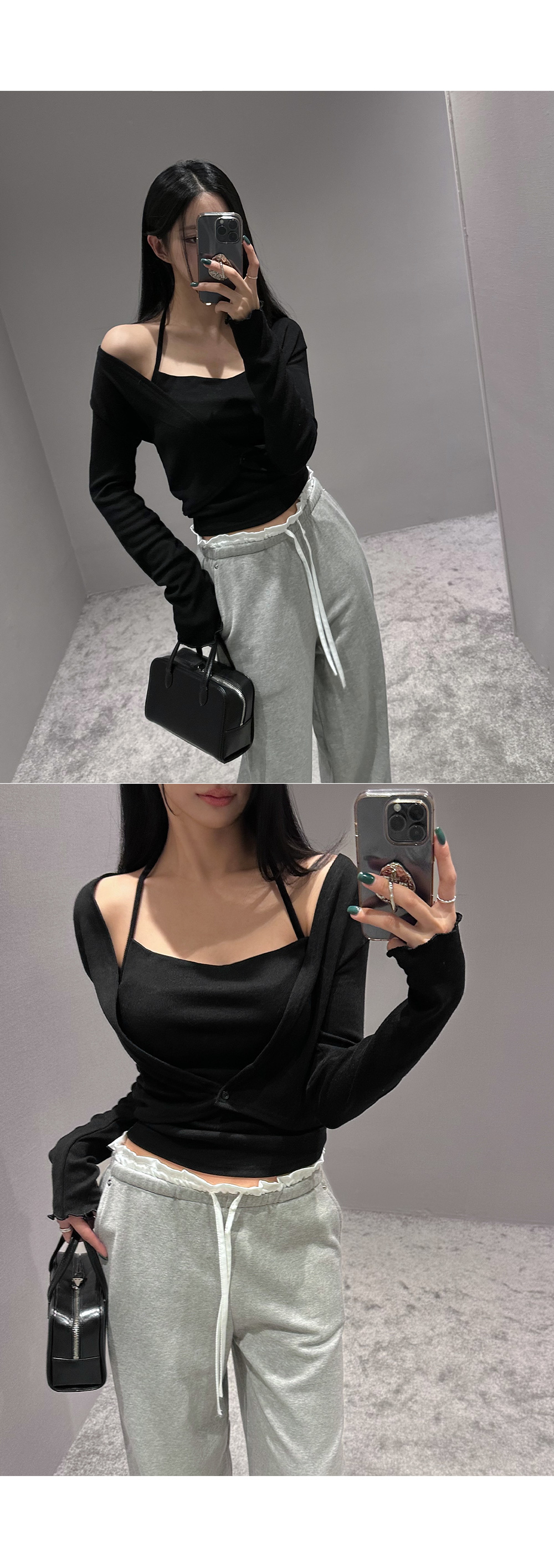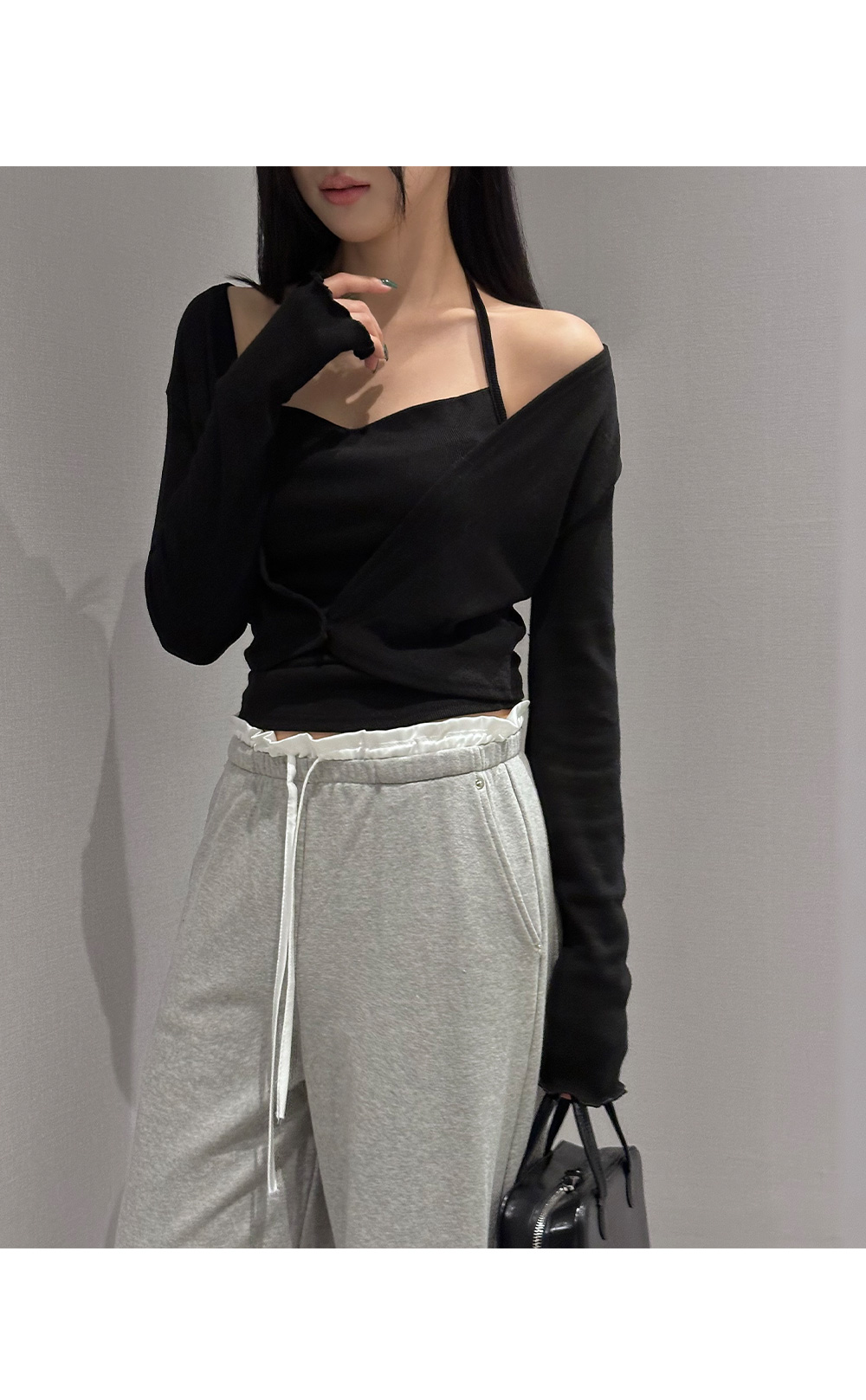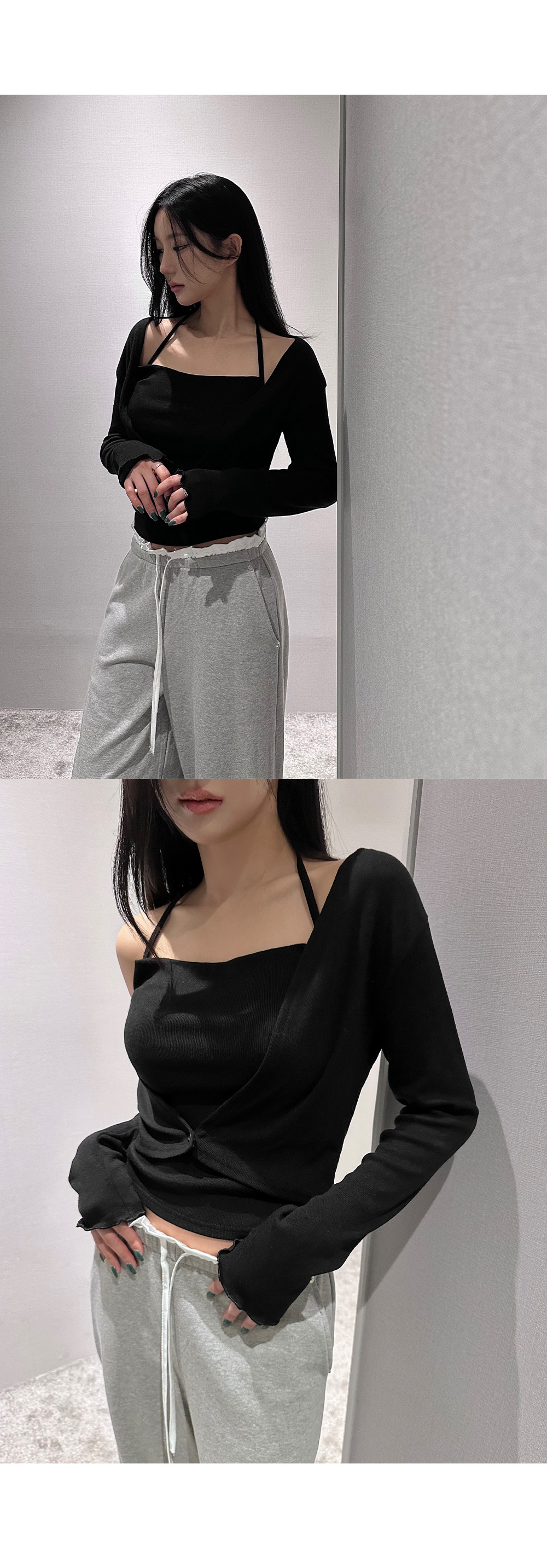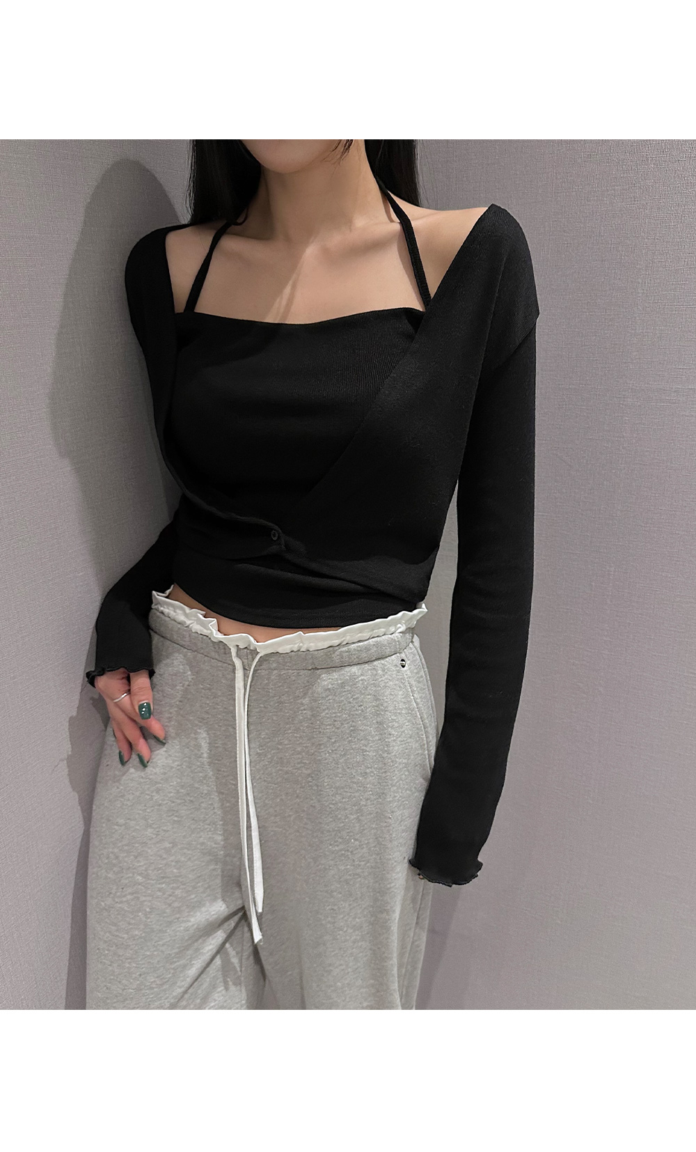 홀터넥 나시 가디건세트입니다. 드레이프 넥 디자인으로 페미닌한 무드를 더해줍니다.