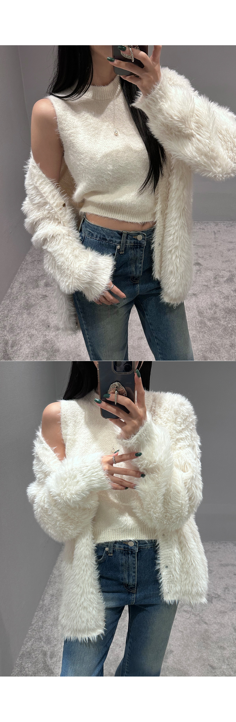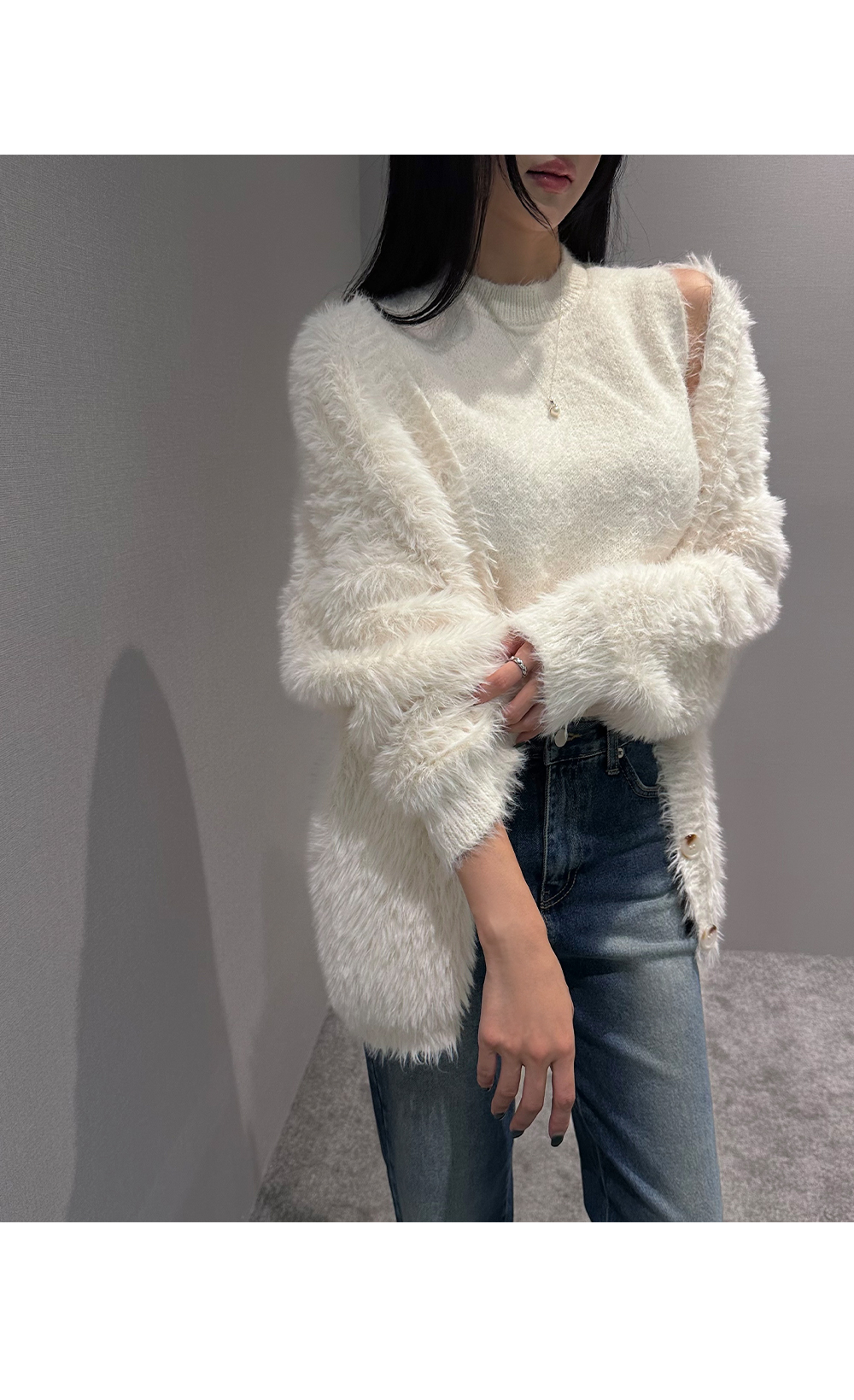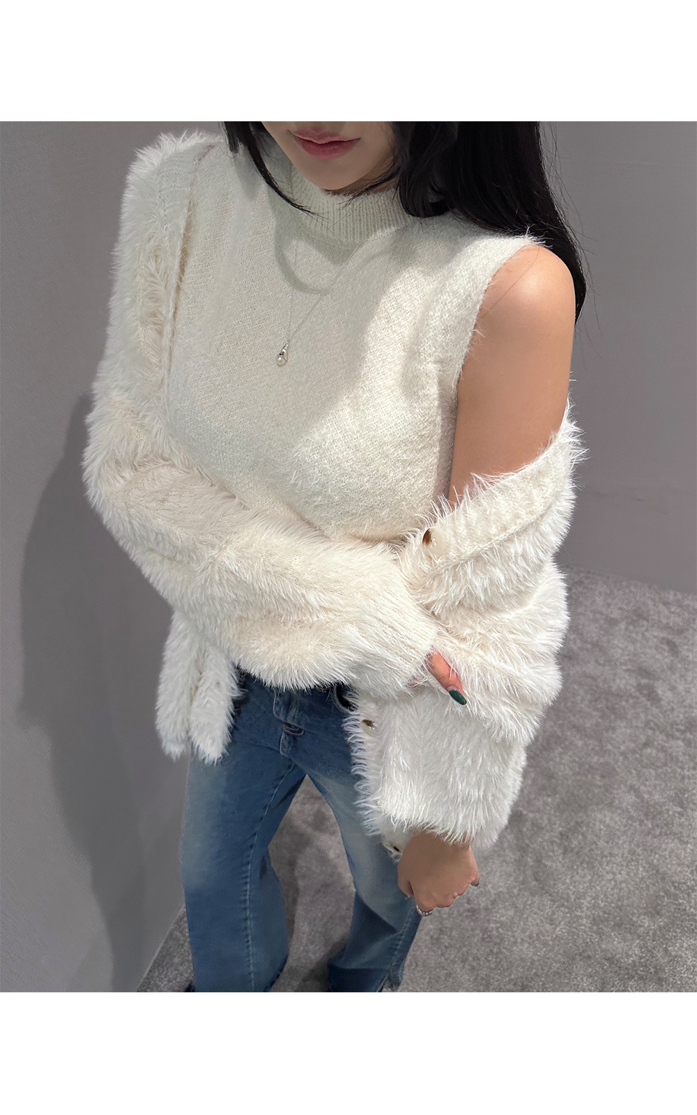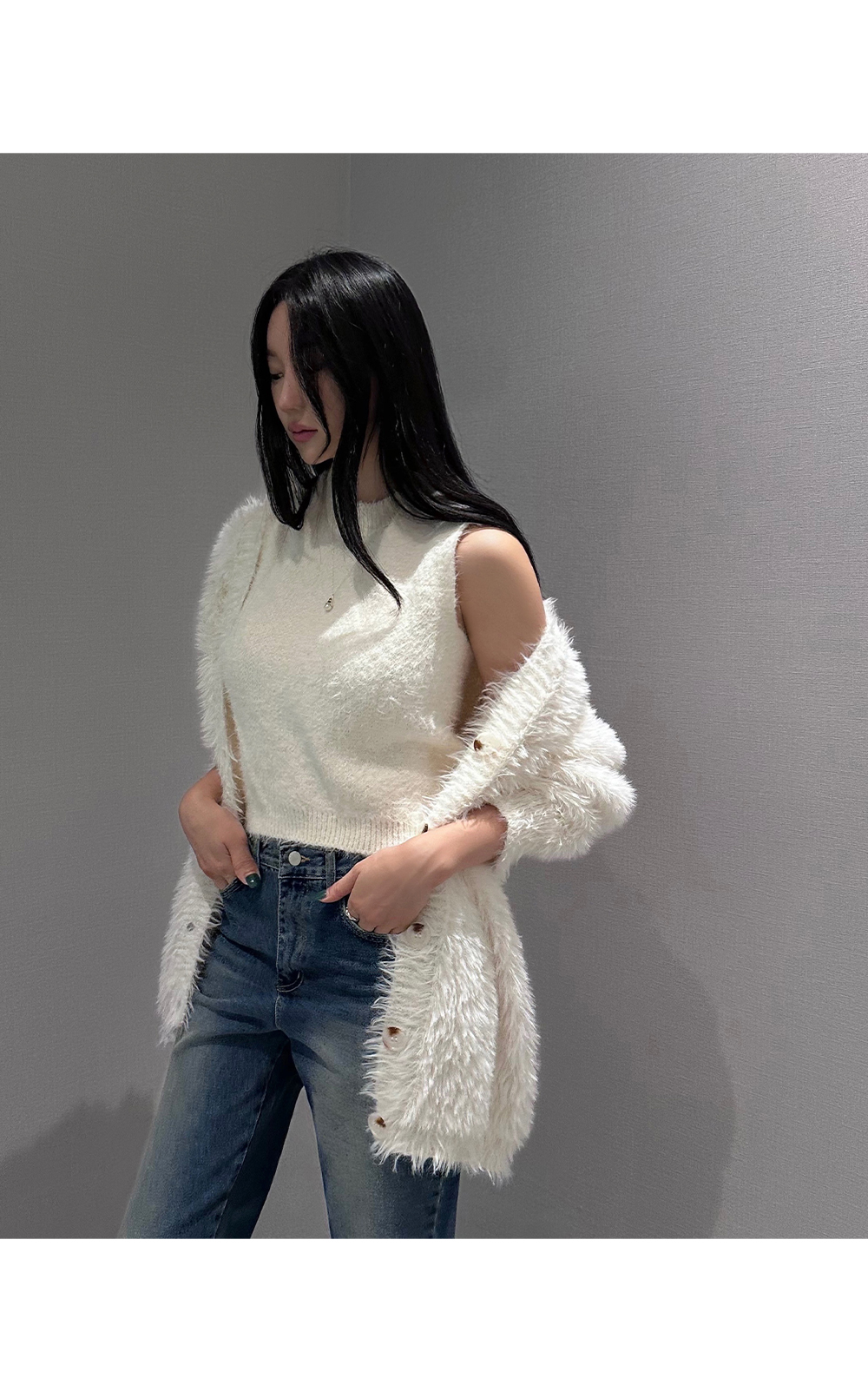 날개사 밍크 퍼 소재의 나시 가디건 세트입니다. 정말 부드러운 터치감으로 기분 좋은 착용감을 선사해 주며 크롭 기장의 나시와 루즈핏 가디건으로 여리여리한 분위기를 끌어올려 줍니다.