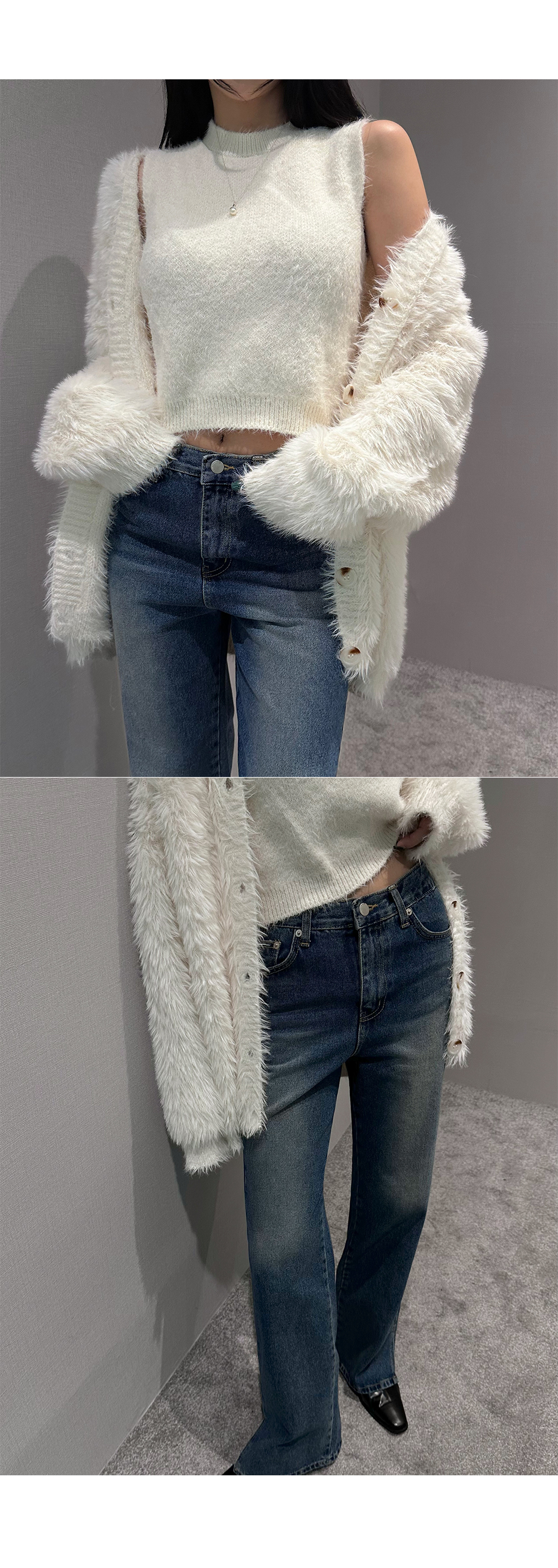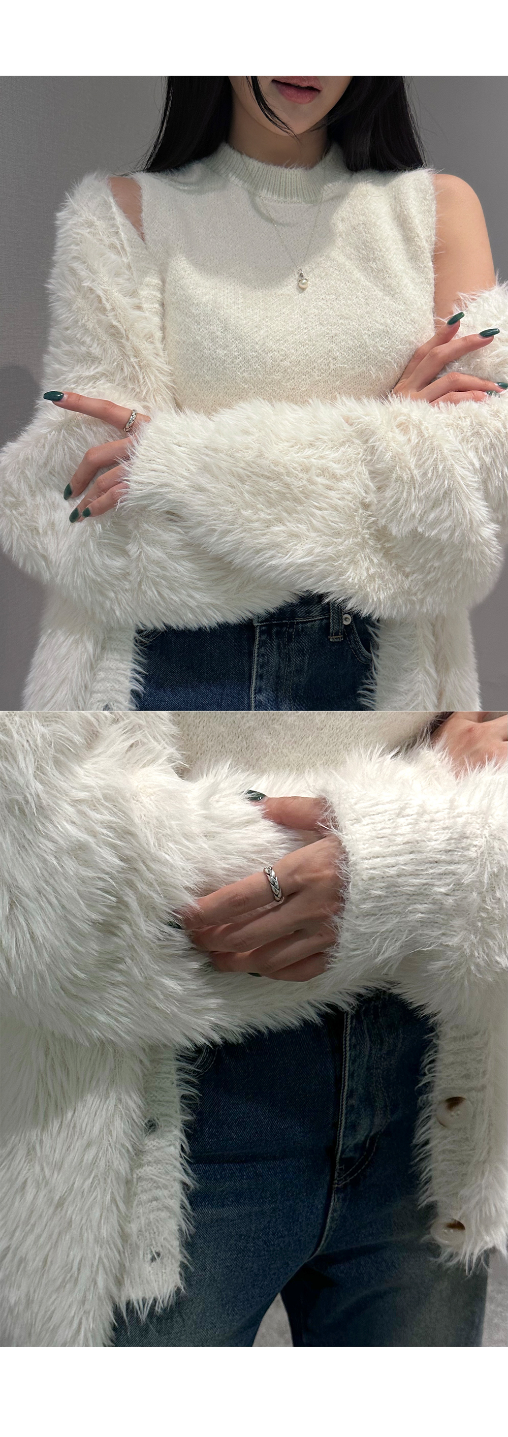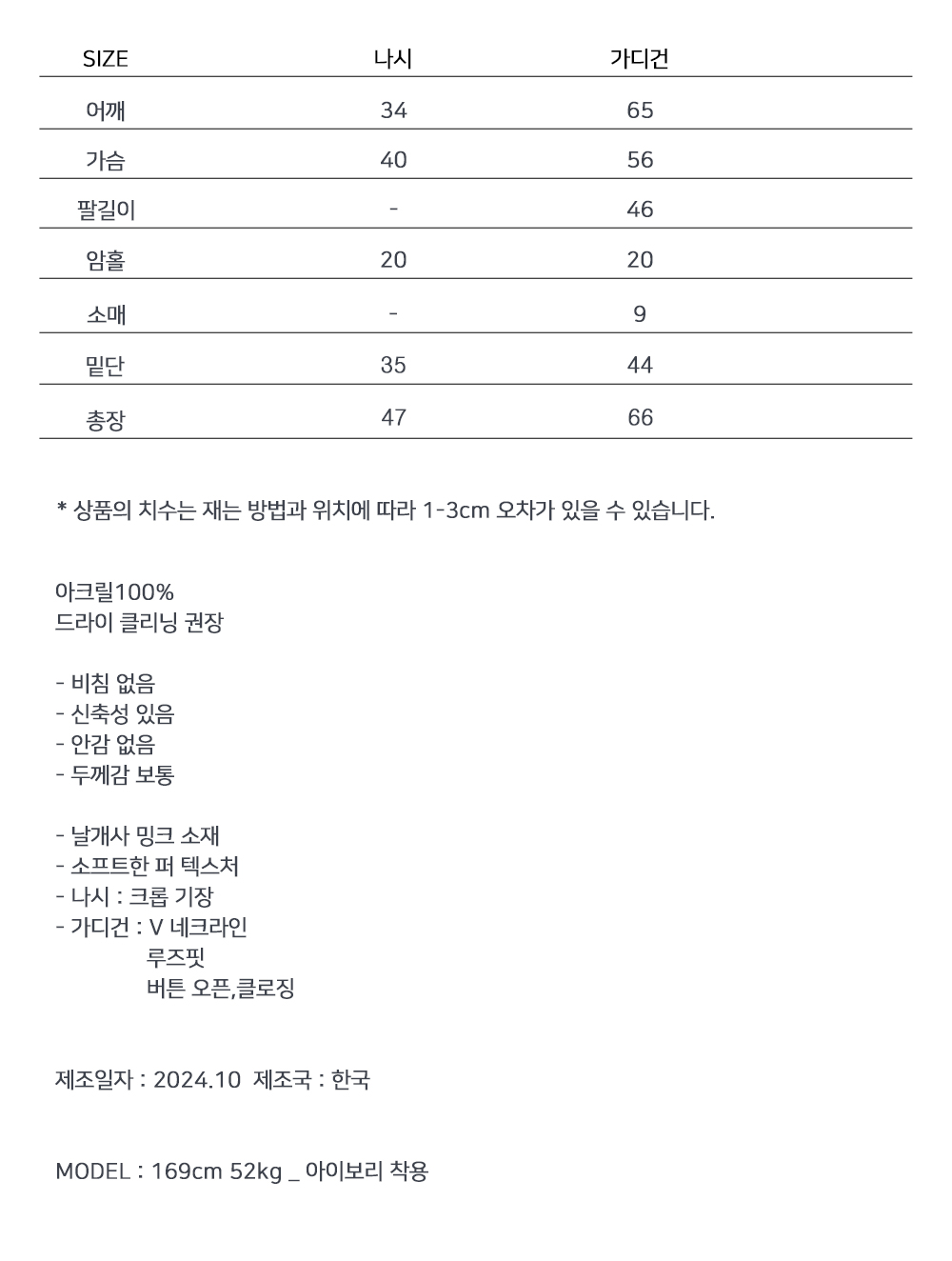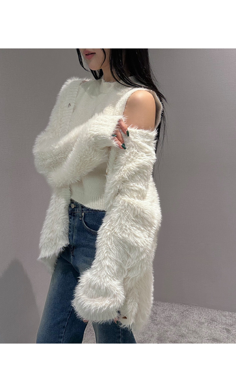 날개사 밍크 퍼 소재의 나시 가디건 세트입니다. 정말 부드러운 터치감으로 기분 좋은 착용감을 선사해 주며 크롭 기장의 나시와 루즈핏 가디건으로 여리여리한 분위기를 끌어올려 줍니다.
