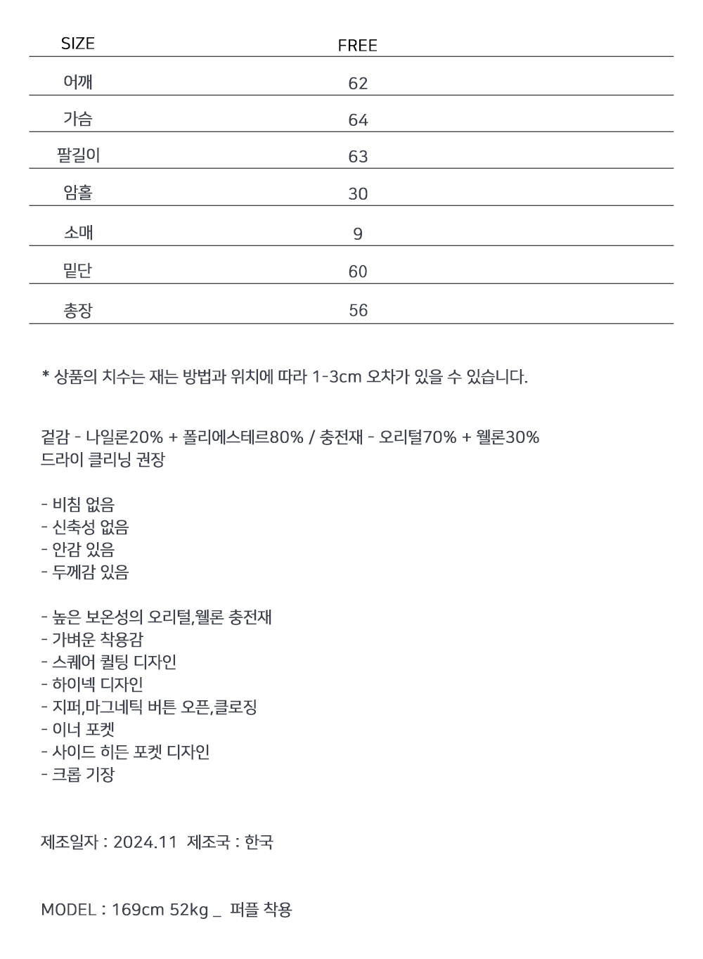 가벼운 착용감의 패딩 점퍼입니다. 덕다운,웰론 블렌딩 충전재로 가볍지만 보온성을 높였으며 마그네틱 버튼으로 이지한 클로징을 도와줍니다.