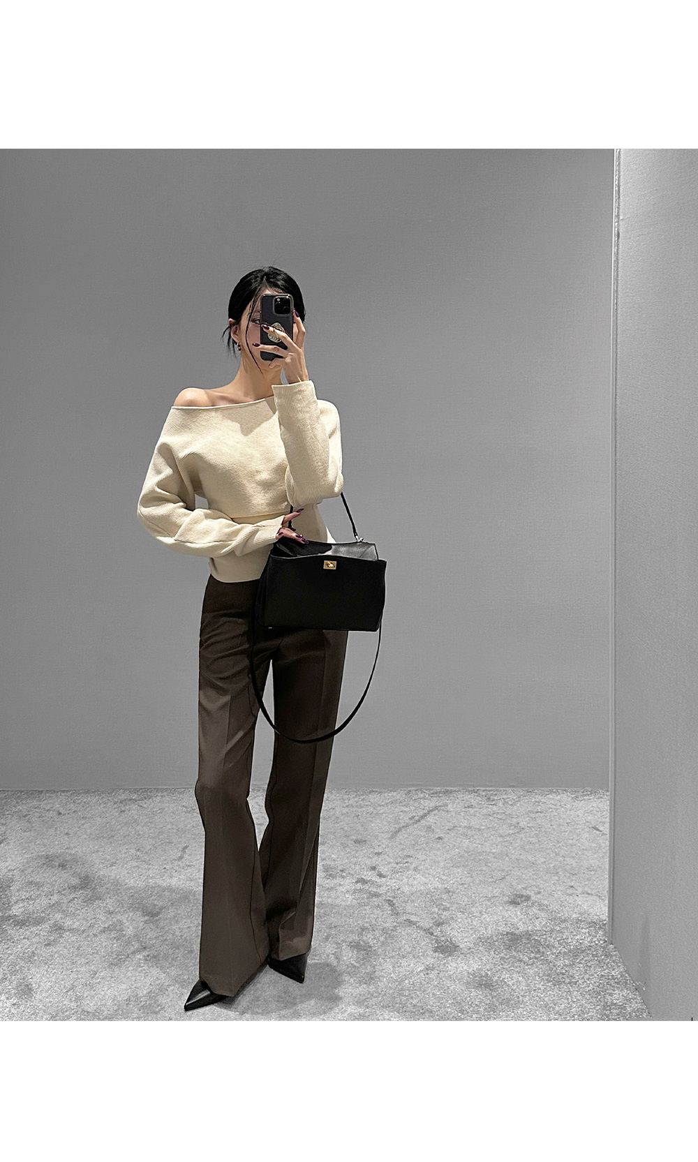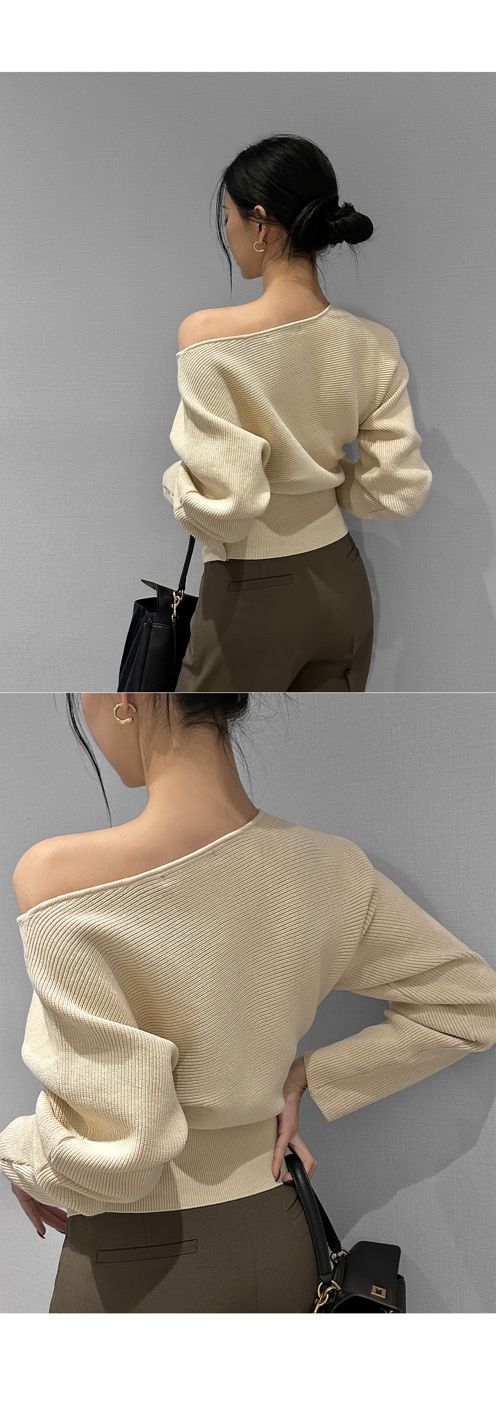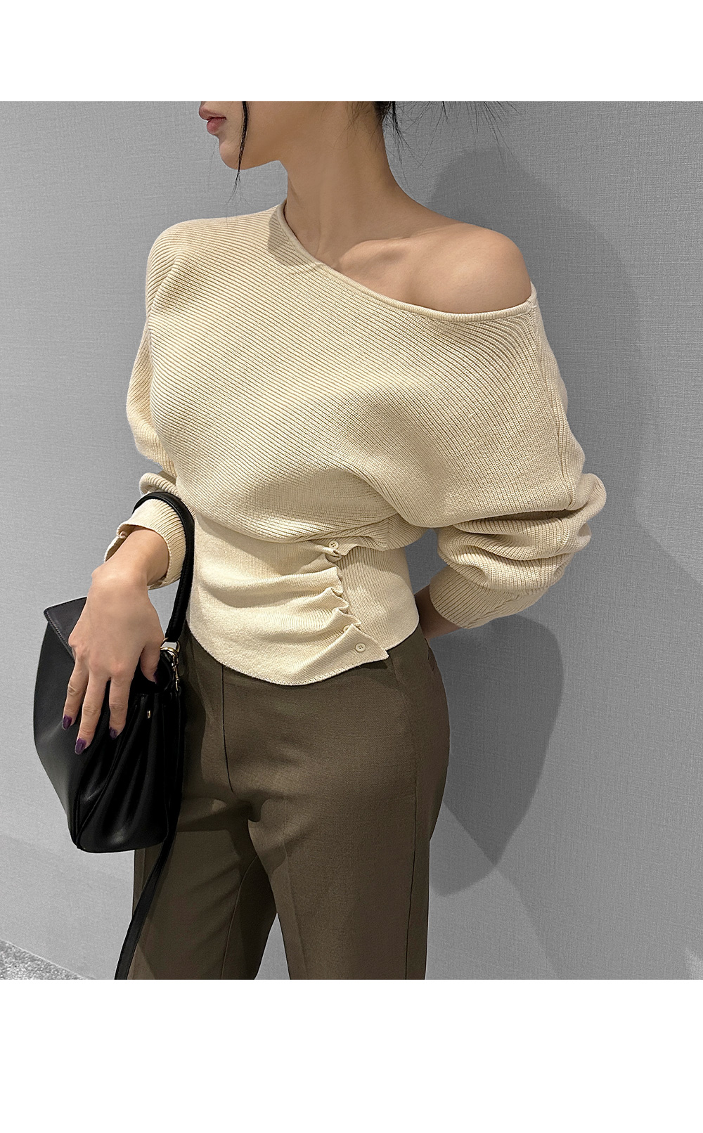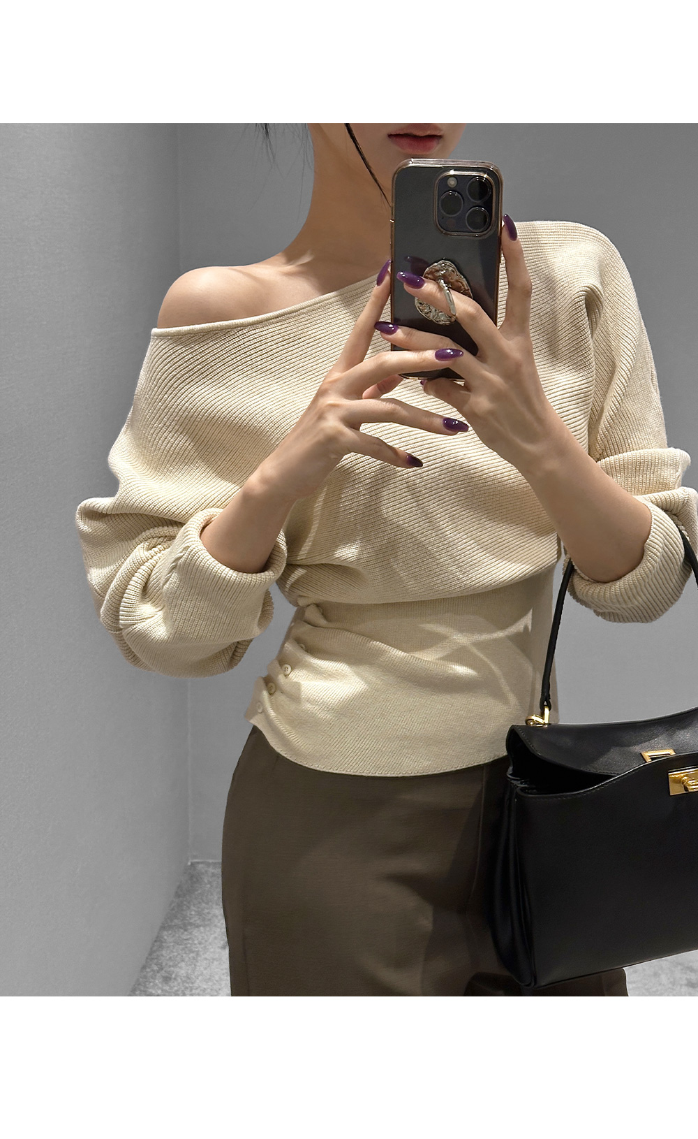 페미닌한 무드의 오프숄더 니트입니다. 원오프숄더로 연출되며 밑단 핀턱 디자인 + 버튼 디테일로 고급스러움을 더해줍니다.