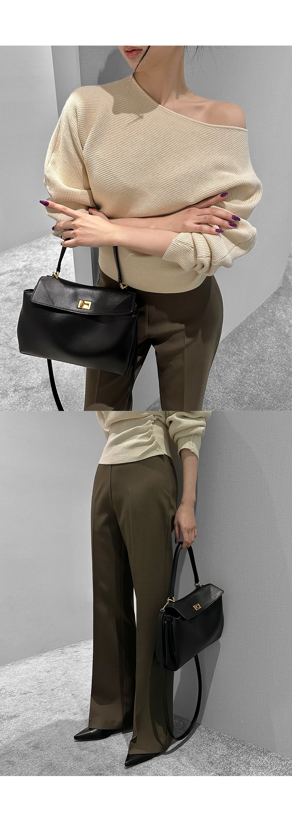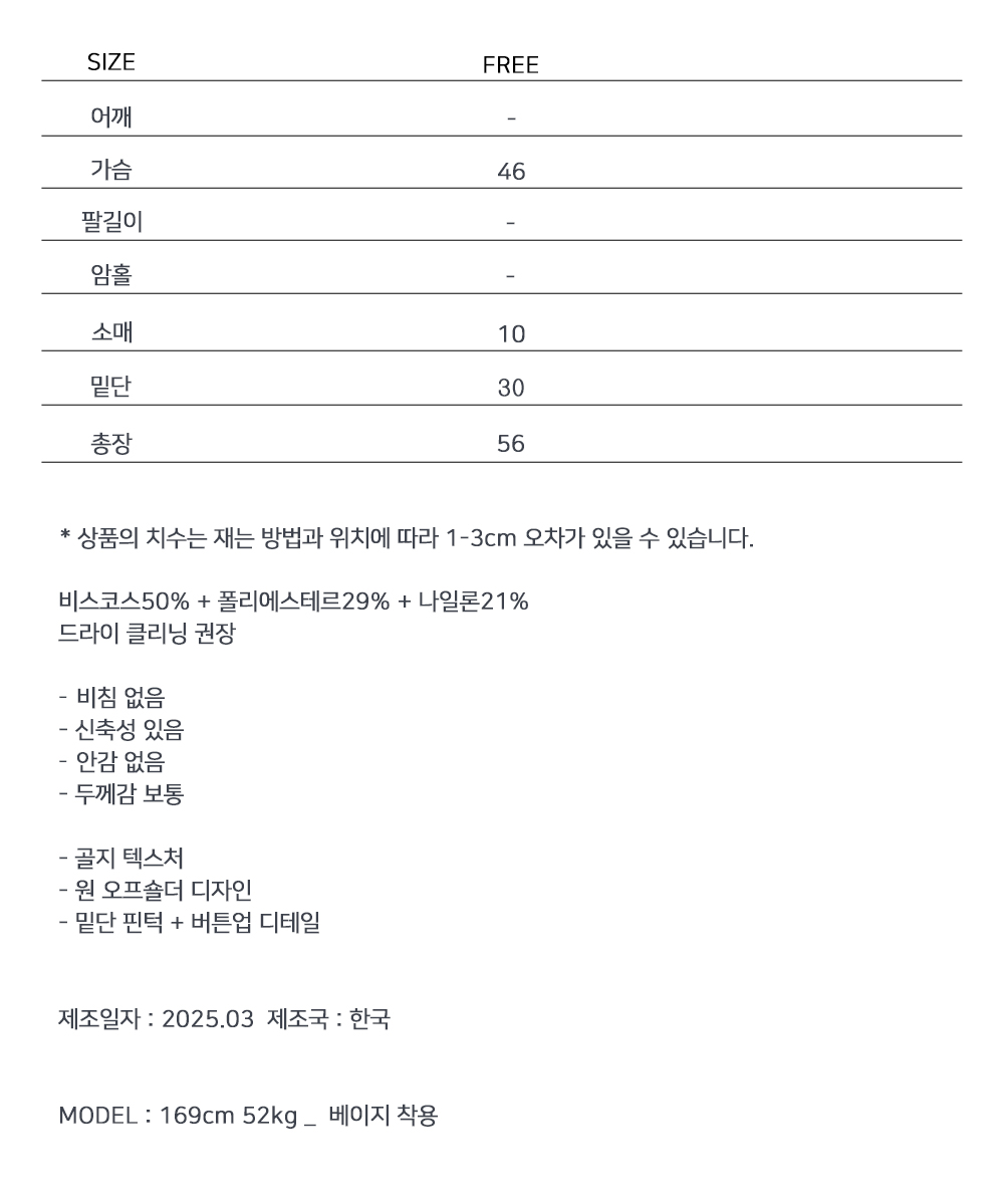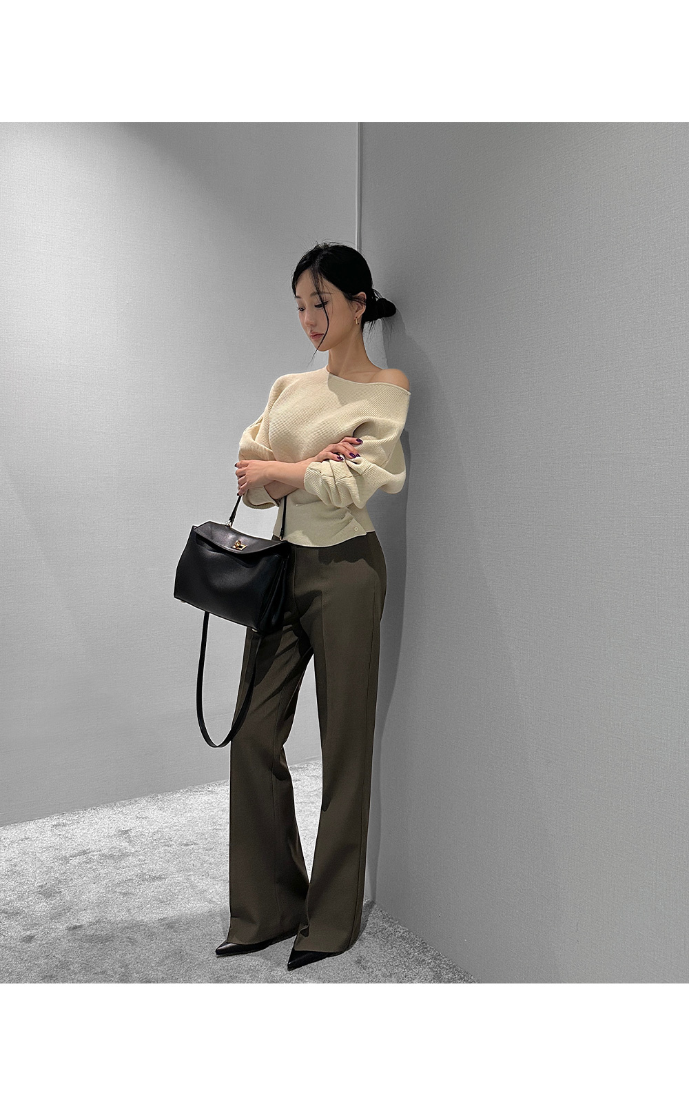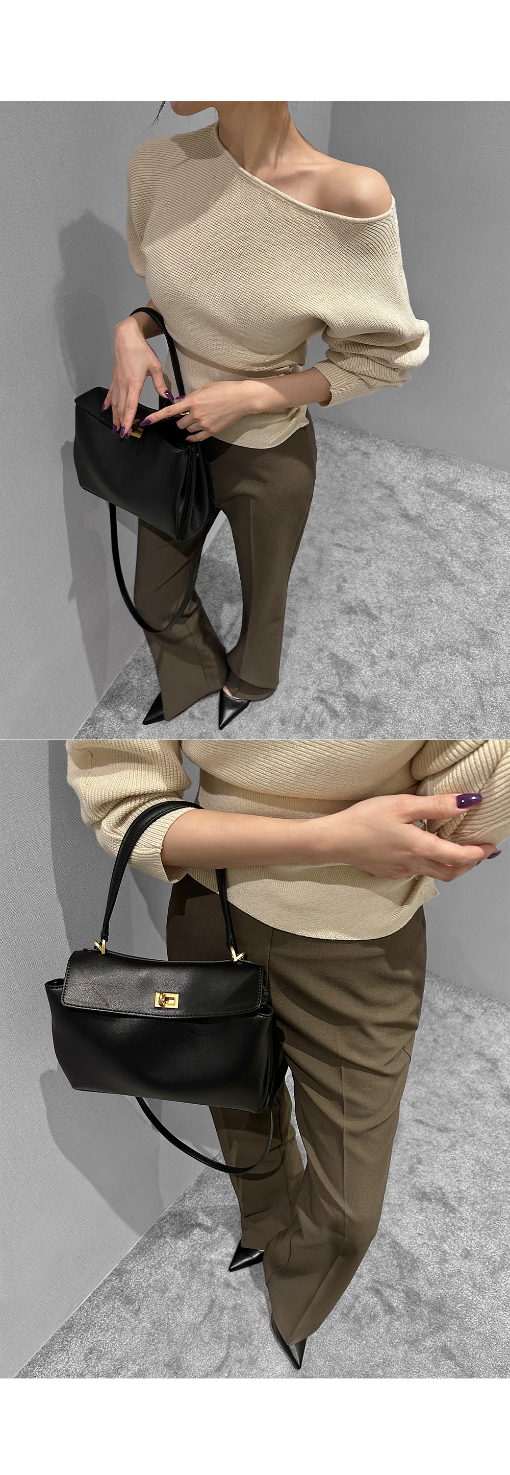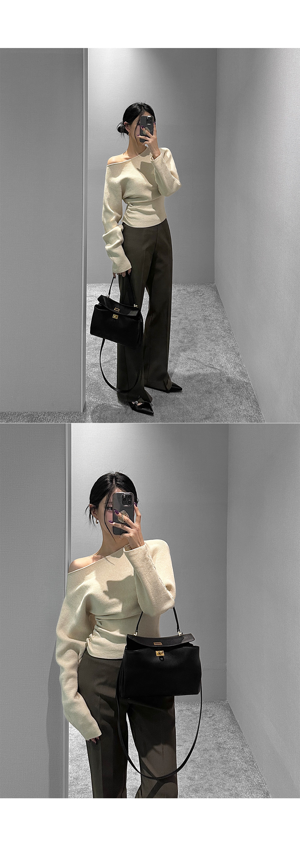 페미닌한 무드의 오프숄더 니트입니다. 원오프숄더로 연출되며 밑단 핀턱 디자인 + 버튼 디테일로 고급스러움을 더해줍니다.