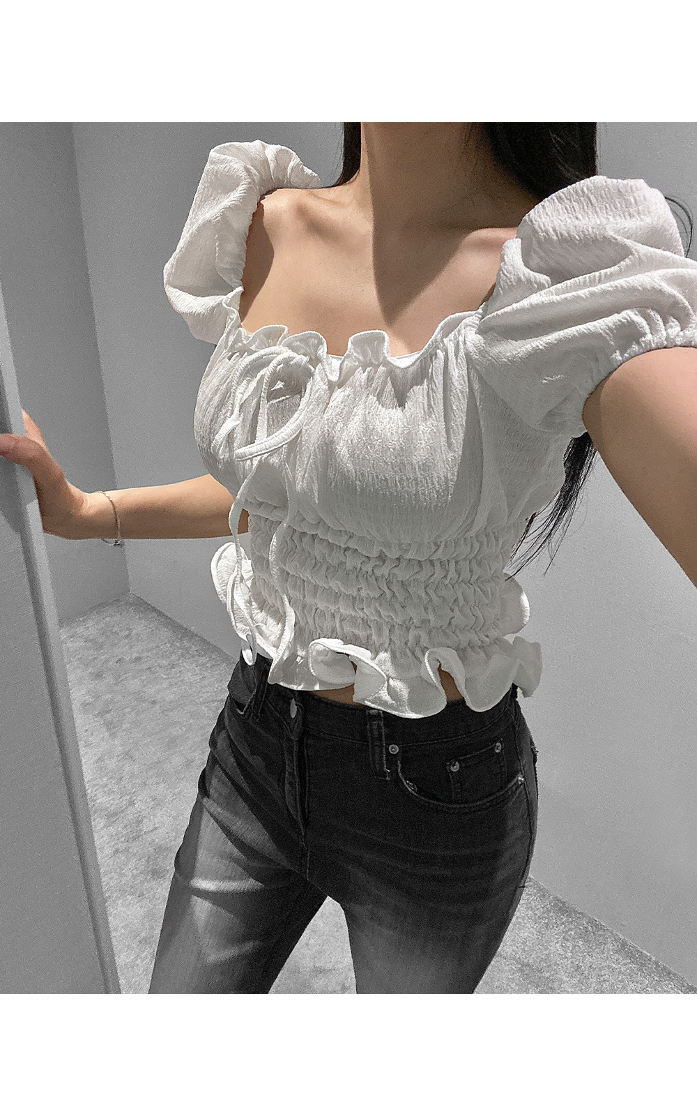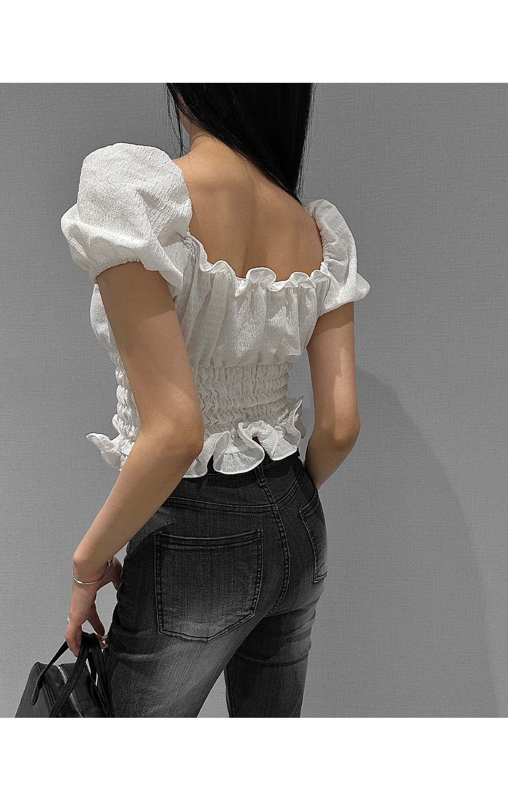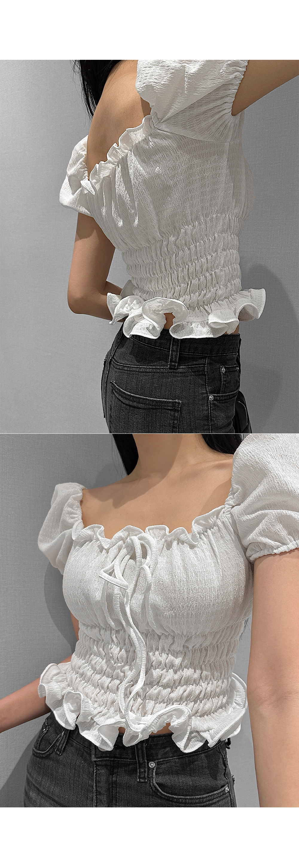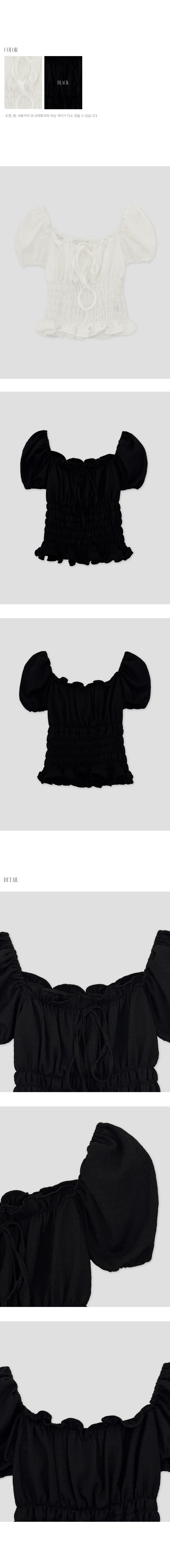 볼륨감 있는 퍼프 소매와 러플 디테일로 사랑스러운 무드를 더한 스모크 블라우스입니다. 바디라인을 따라 핏되는 셔링 디자인으로 슬림하면서도 페미닌한 실루엣을 연출해 줍니다.