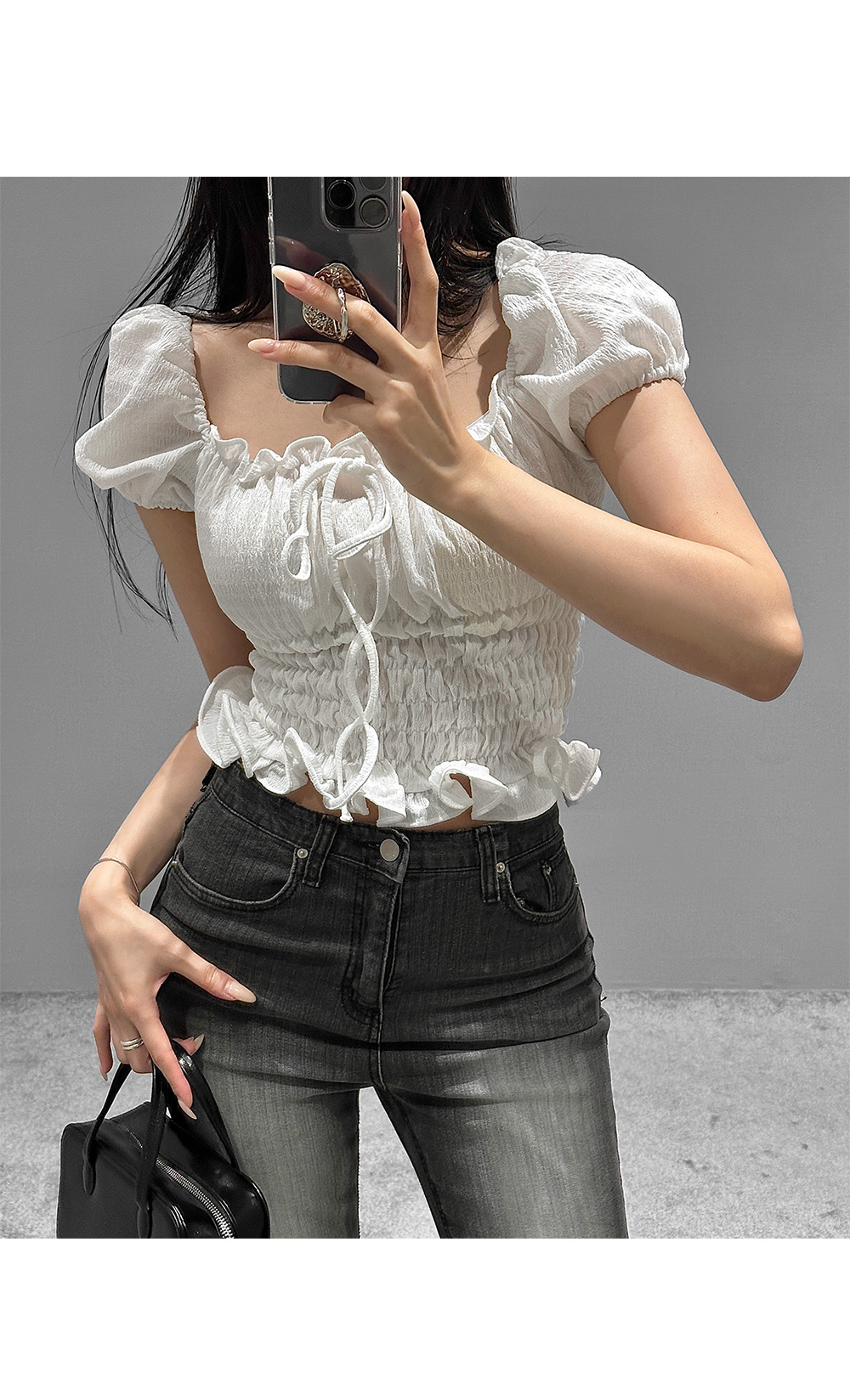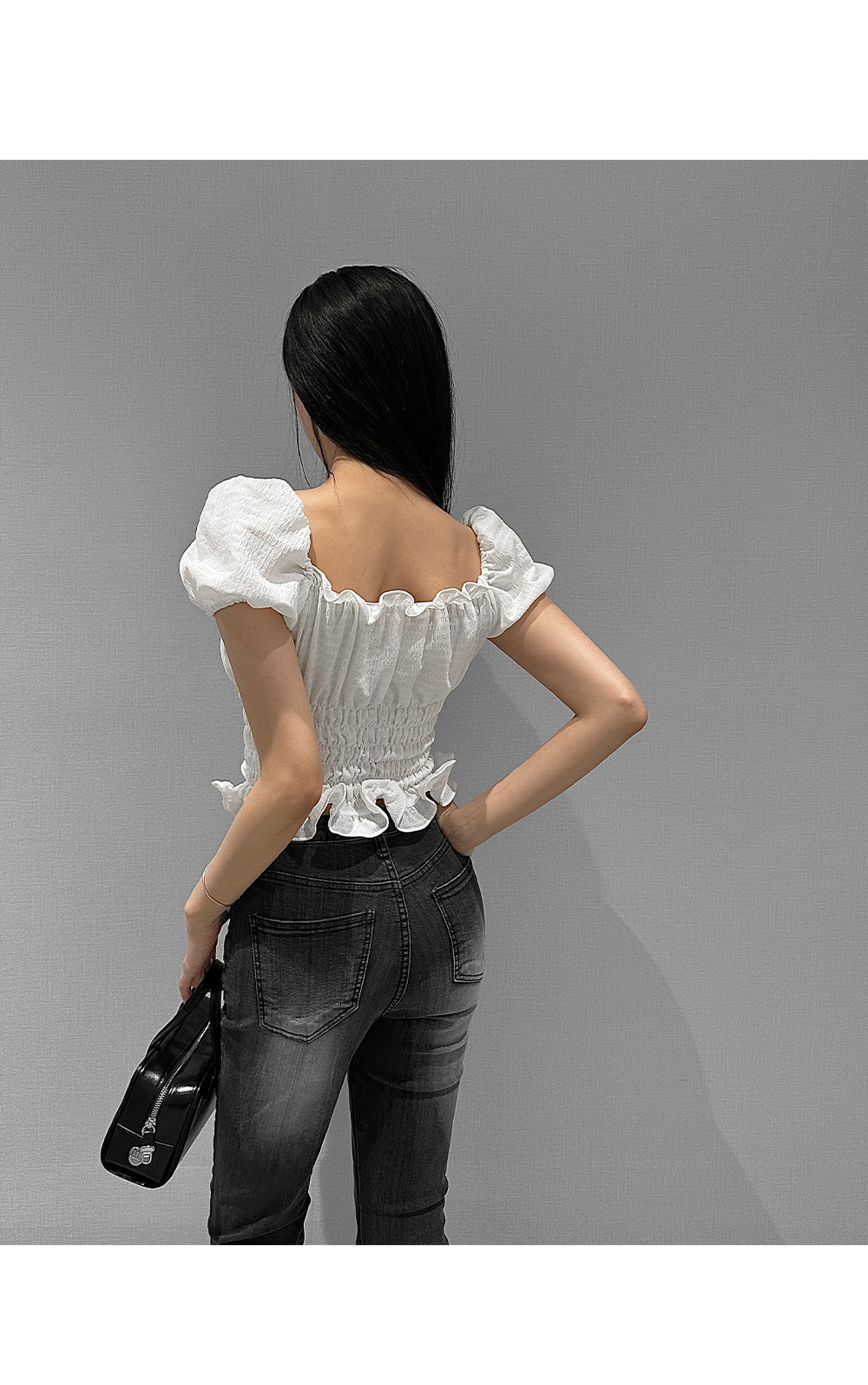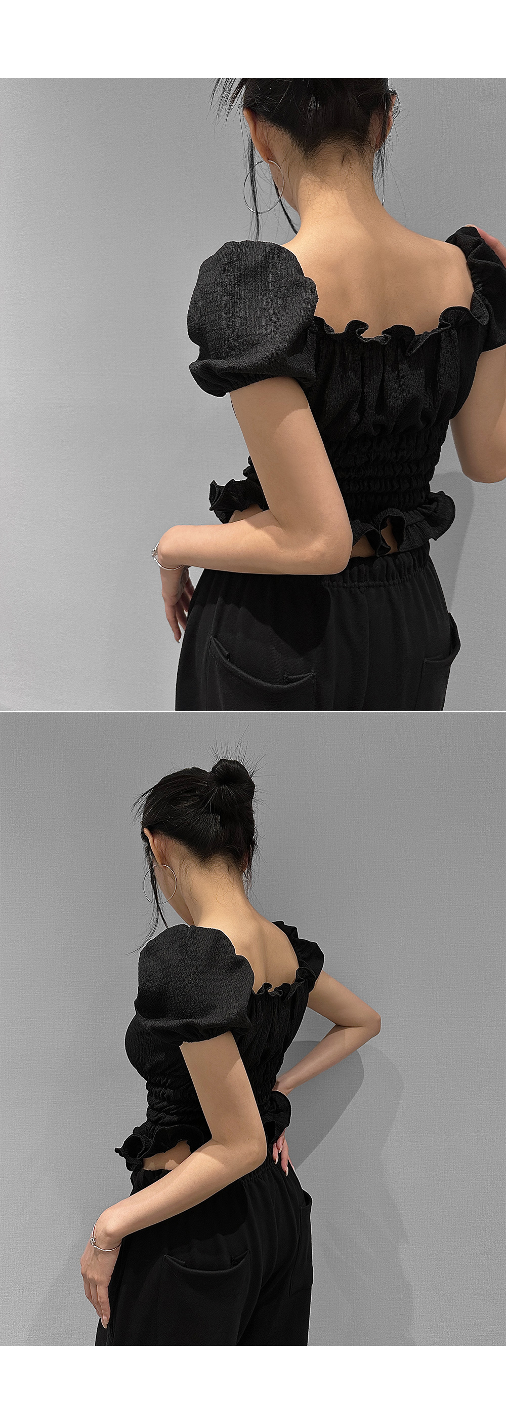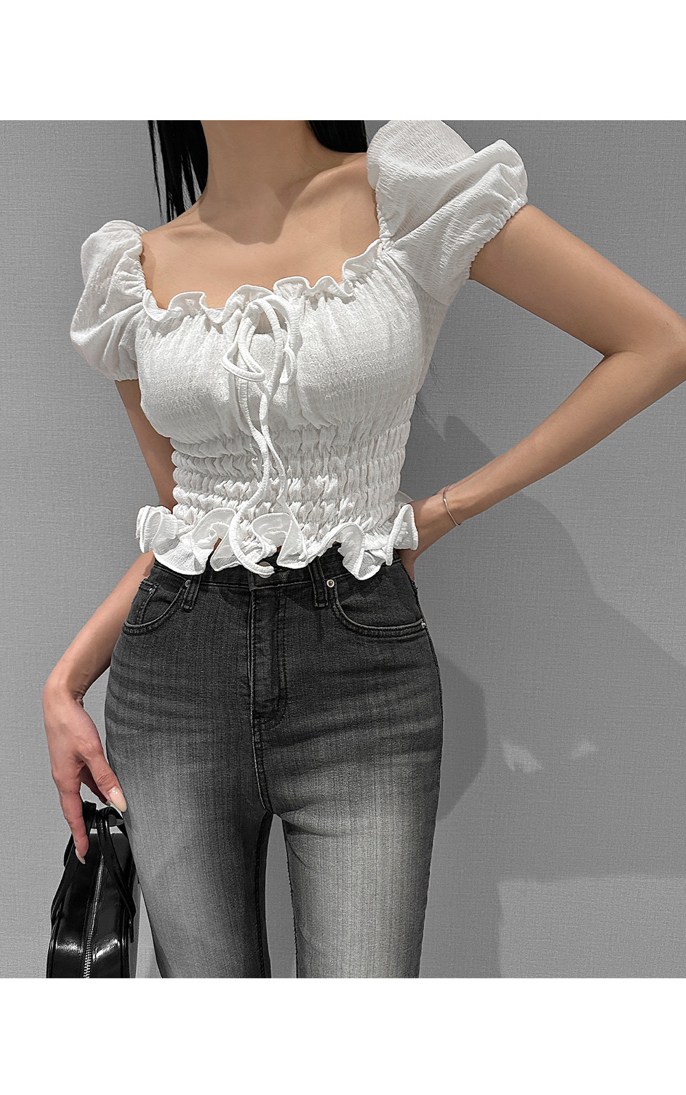 볼륨감 있는 퍼프 소매와 러플 디테일로 사랑스러운 무드를 더한 스모크 블라우스입니다. 바디라인을 따라 핏되는 셔링 디자인으로 슬림하면서도 페미닌한 실루엣을 연출해 줍니다.