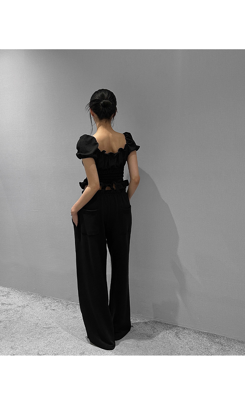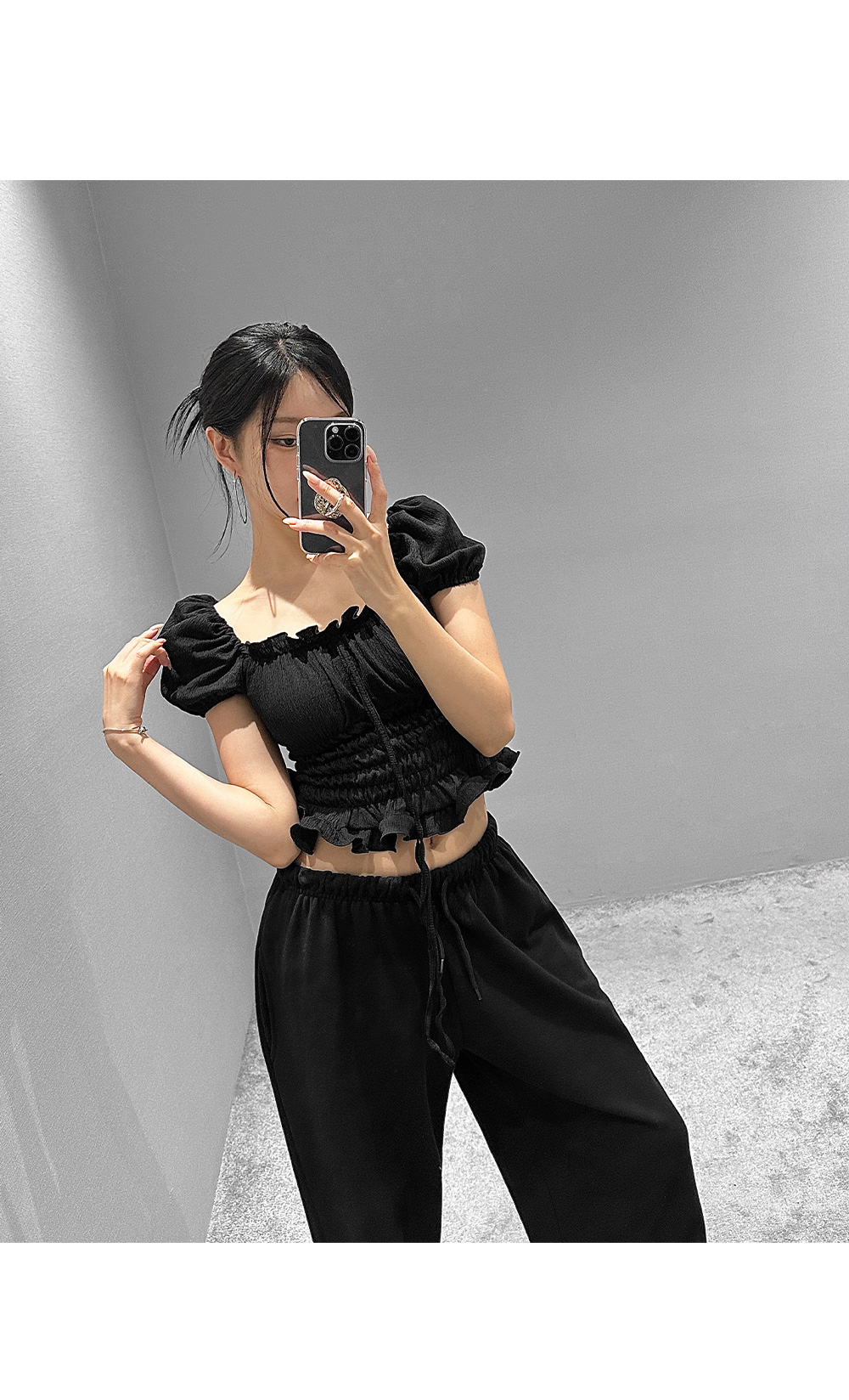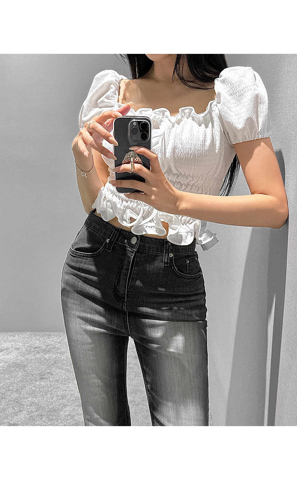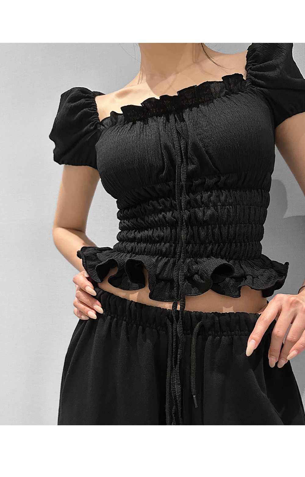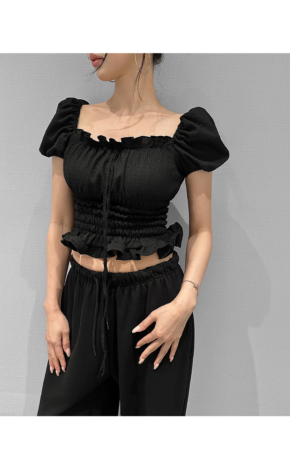 볼륨감 있는 퍼프 소매와 러플 디테일로 사랑스러운 무드를 더한 스모크 블라우스입니다. 바디라인을 따라 핏되는 셔링 디자인으로 슬림하면서도 페미닌한 실루엣을 연출해 줍니다.