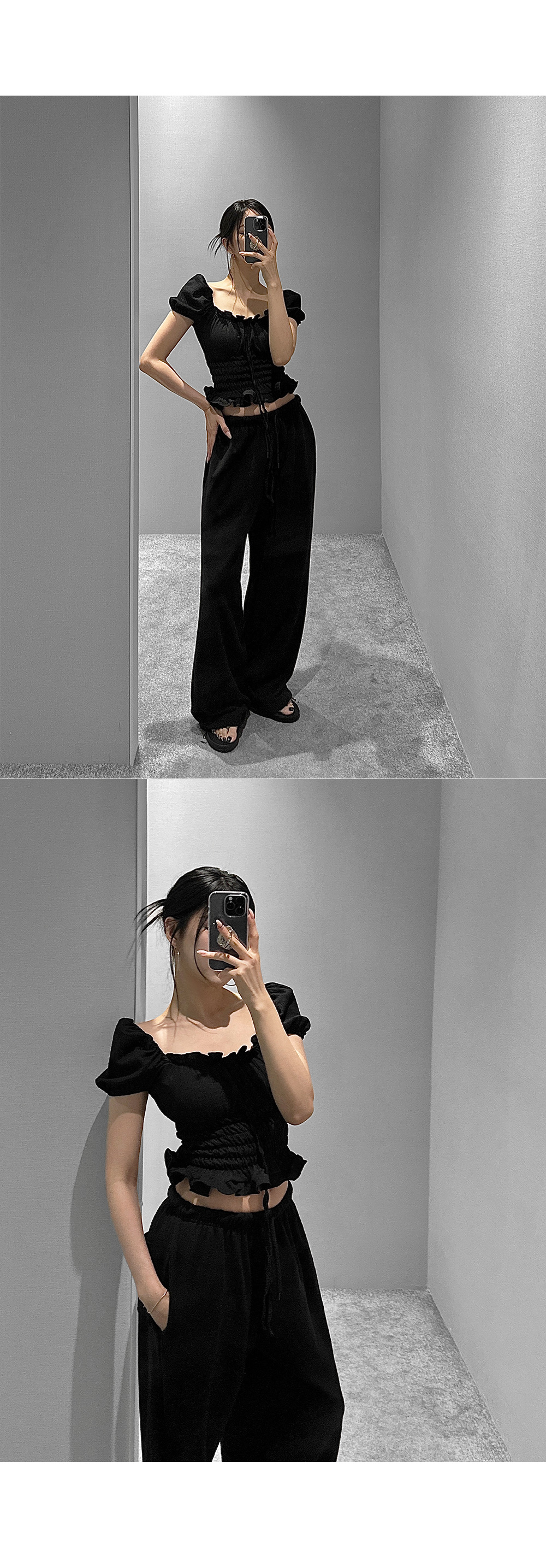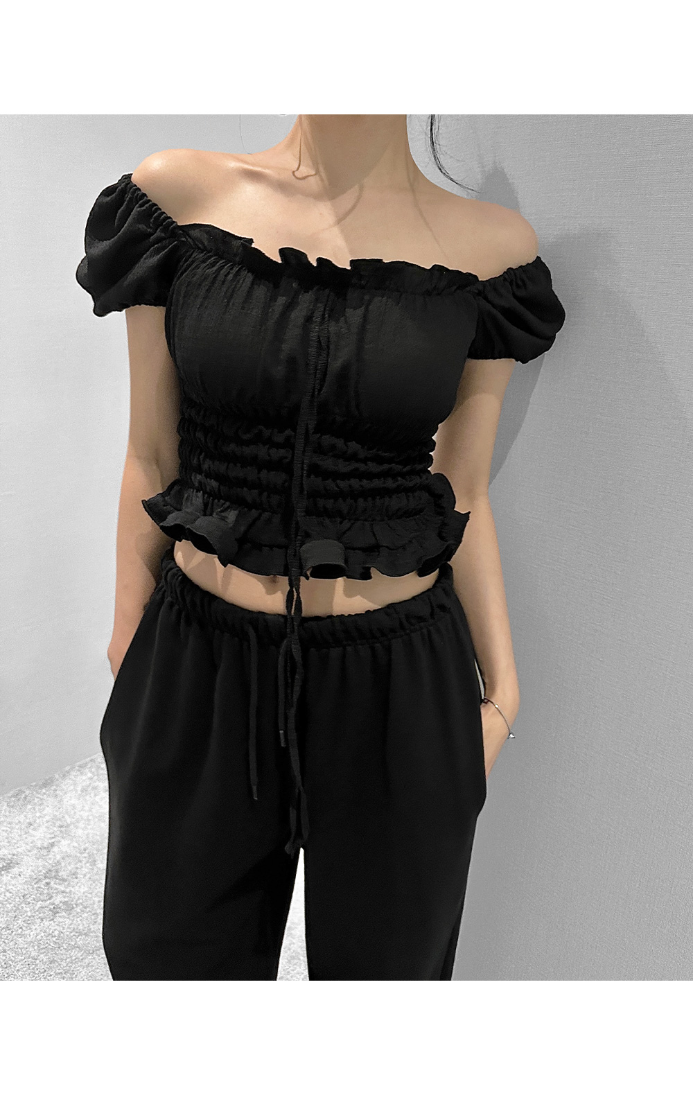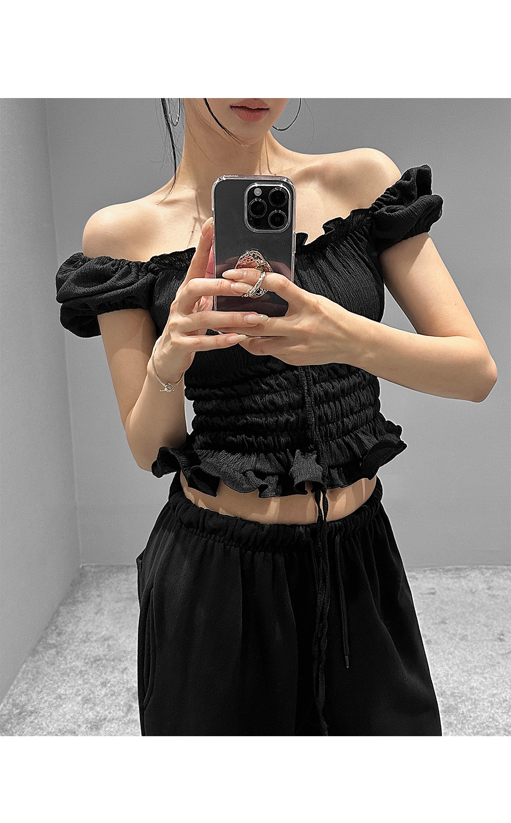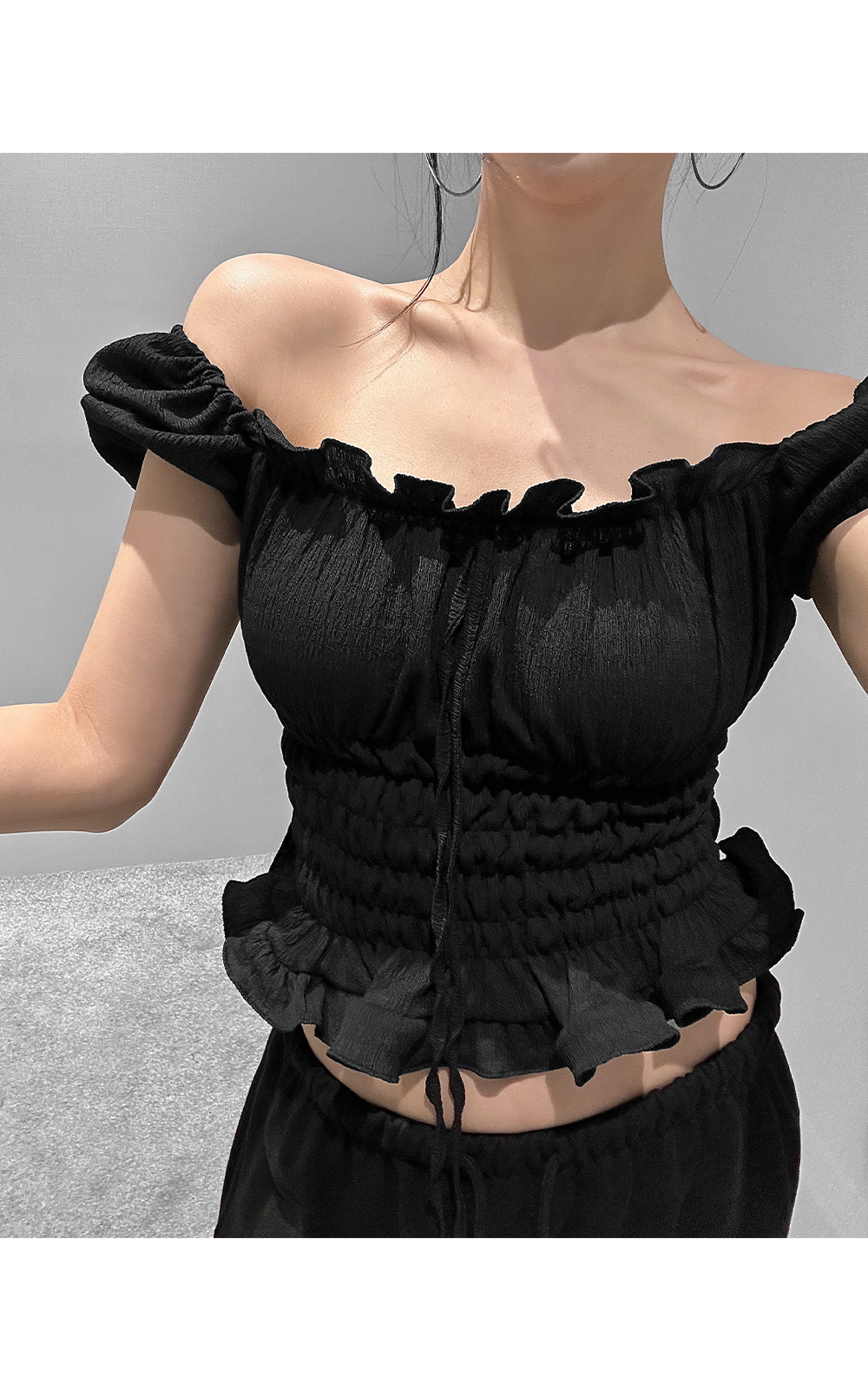 볼륨감 있는 퍼프 소매와 러플 디테일로 사랑스러운 무드를 더한 스모크 블라우스입니다. 바디라인을 따라 핏되는 셔링 디자인으로 슬림하면서도 페미닌한 실루엣을 연출해 줍니다.
