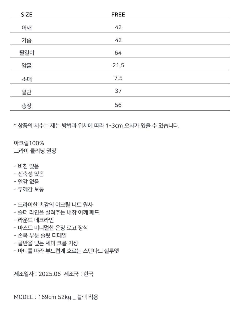 바디에 닿는 순간 쾌적함이 느껴지는 여름용 니트입니다. 어깨 패드가 더해져 안정감 있는 실루엣을 연출합니다. 단정하면서도 은근한 디테일이 살아 있어 데일리룩은 물론, 장마철에도 산뜻하게 즐기기 좋은 아이템입니다.
