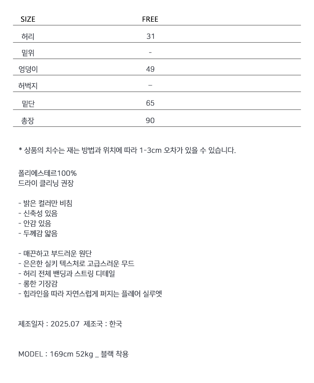 은은한 광택감으로 세련된 무드를 연출하는 실키 스커트입니다. 허리 전체 밴딩과 스트링으로 편안한 착용감을 더했으며, 자연스럽게 떨어지는 플레어 라인이 페미닌한 실루엣을 완성해 데일리룩부터 모던한 무드의 스타일링까지 활용도 높습니다.