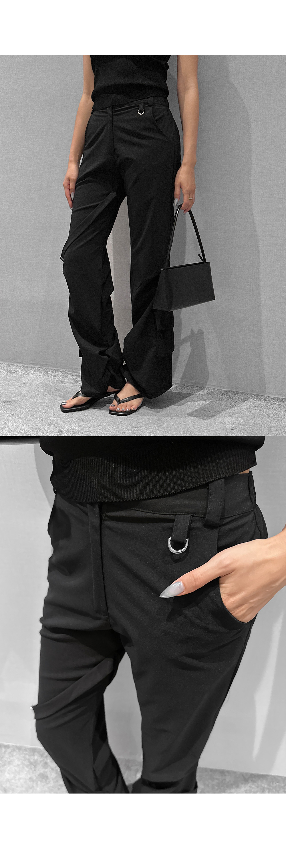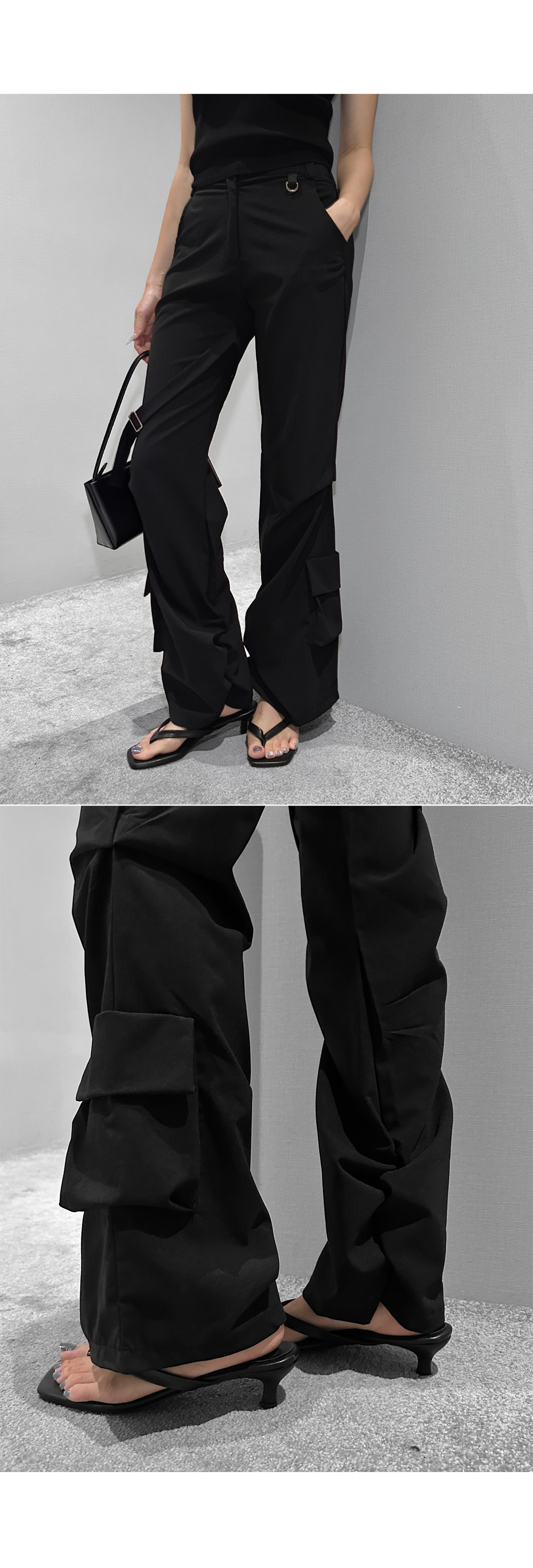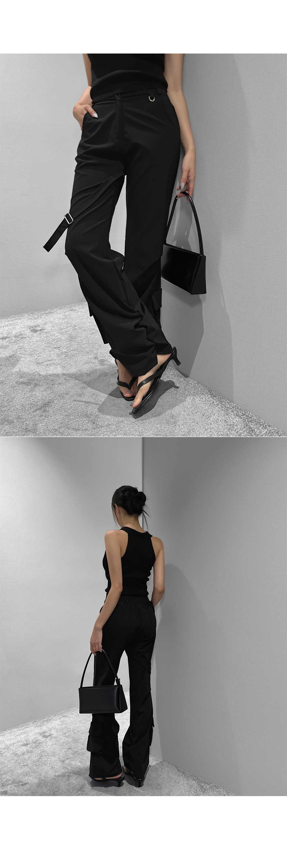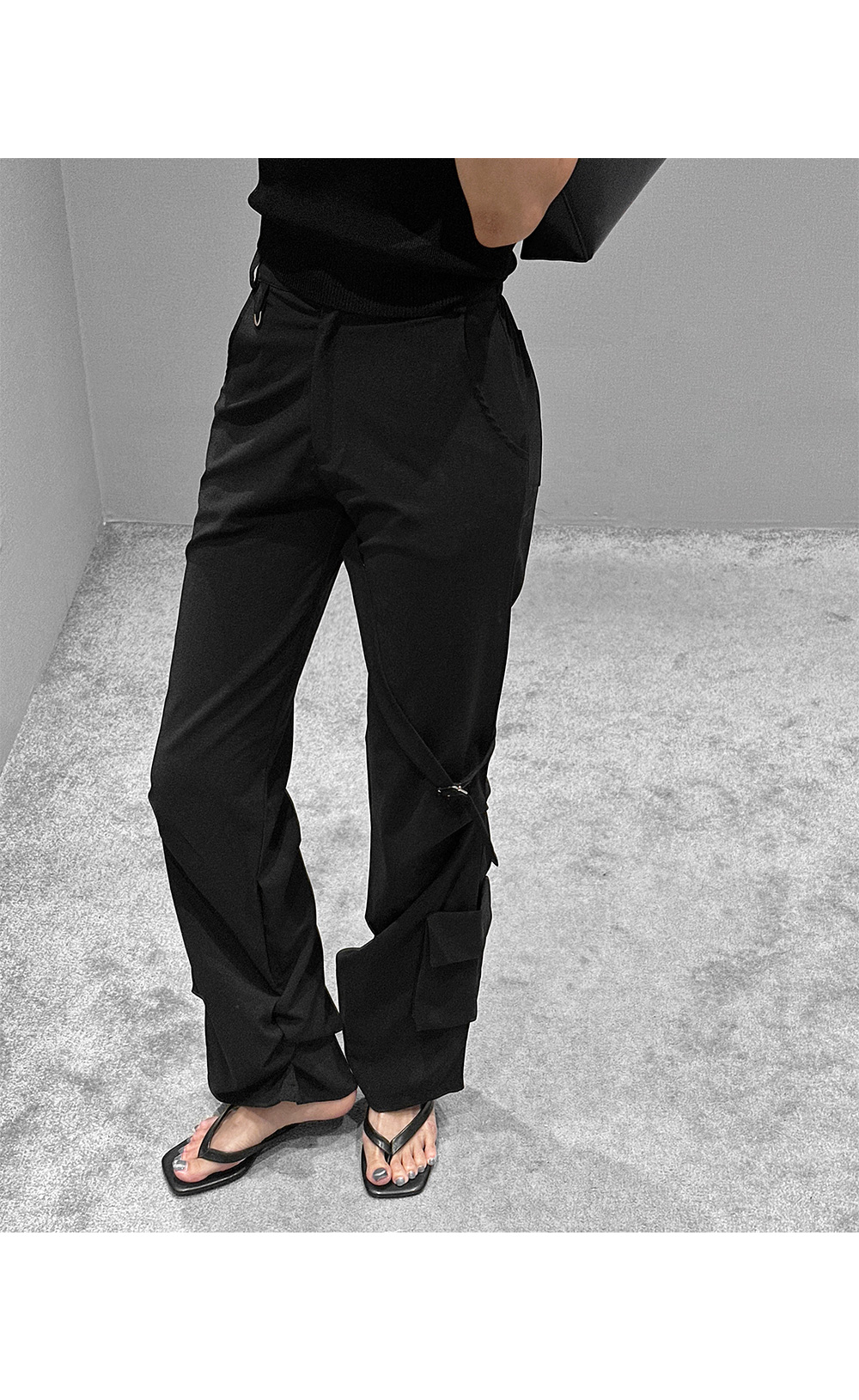 드라이한 텍스처가 돋보이는 뒷밴딩 팬츠입니다. 밑단 사이드 셔링과 허벅지 스트랩 디테일이 유니크한 포인트를 더해 개성 있는 실루엣을 완성합니다. 데일리룩부터 스트리트 무드까지 다양한 스타일링에 활용하기 좋은 아이템입니다.