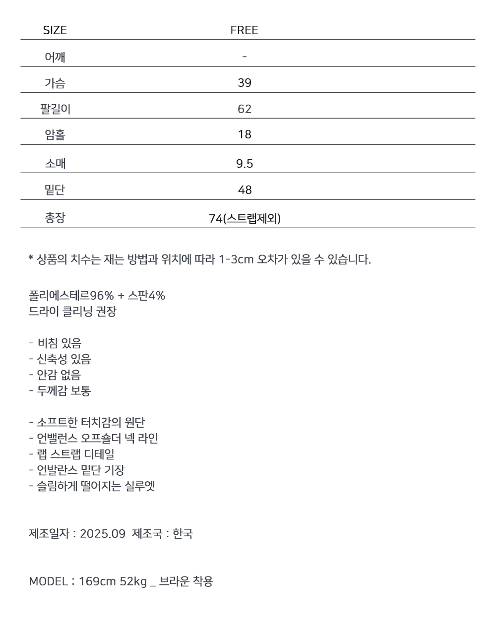 언밸런스한 넥 라인과 기장감, 그리고 허리 랩 디테일이 조화를 이루는 긴팔 티셔츠입니다. 자연스럽게 한쪽 어깨가 드러나는 오프숄더 실루엣이 포인트가 되며 언발란스한 밑단 기장이 레그 라인을 슬림하게 강조해주어 단독으로도 존재감 있는 스타일링을 완성합니다.