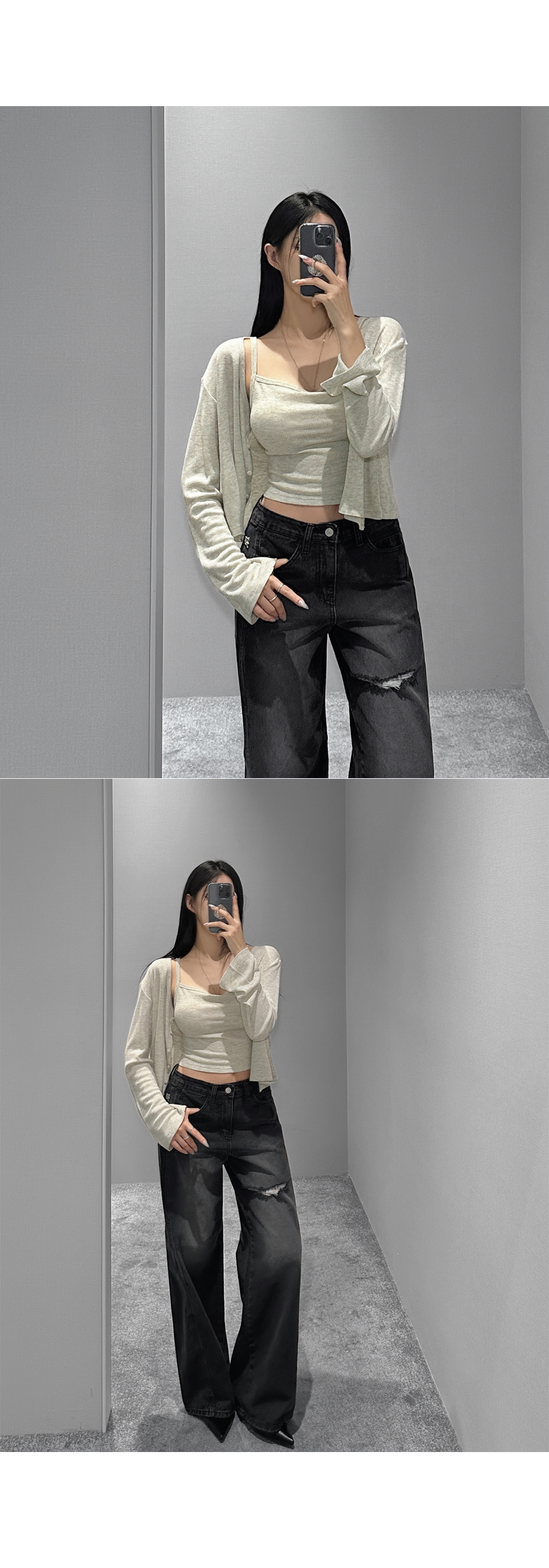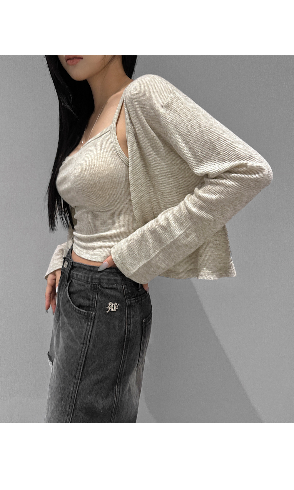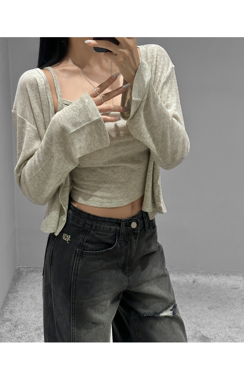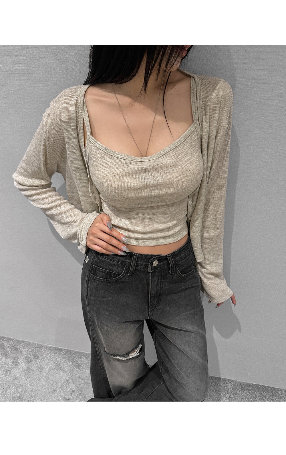 와플 짜임 특유의 내추럴한 텍스처가 돋보이는 나시+가디건 세트입니다. 슬림핏 스퀘어넥 나시와 버튼 클로징의 루즈핏 가디건이 조화를 이루어 단품 또는 세트로 다양한 스타일링이 가능합니다.