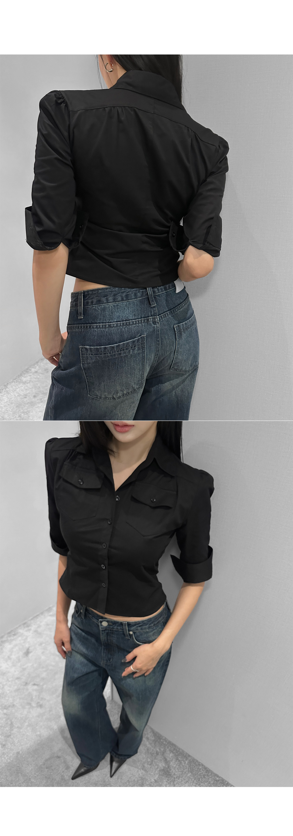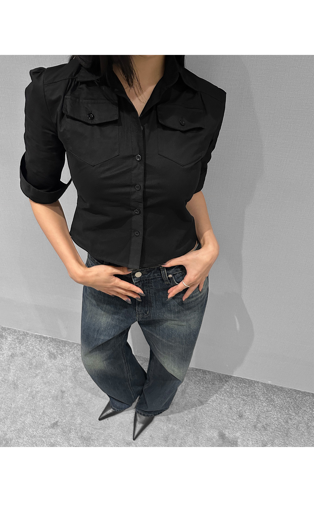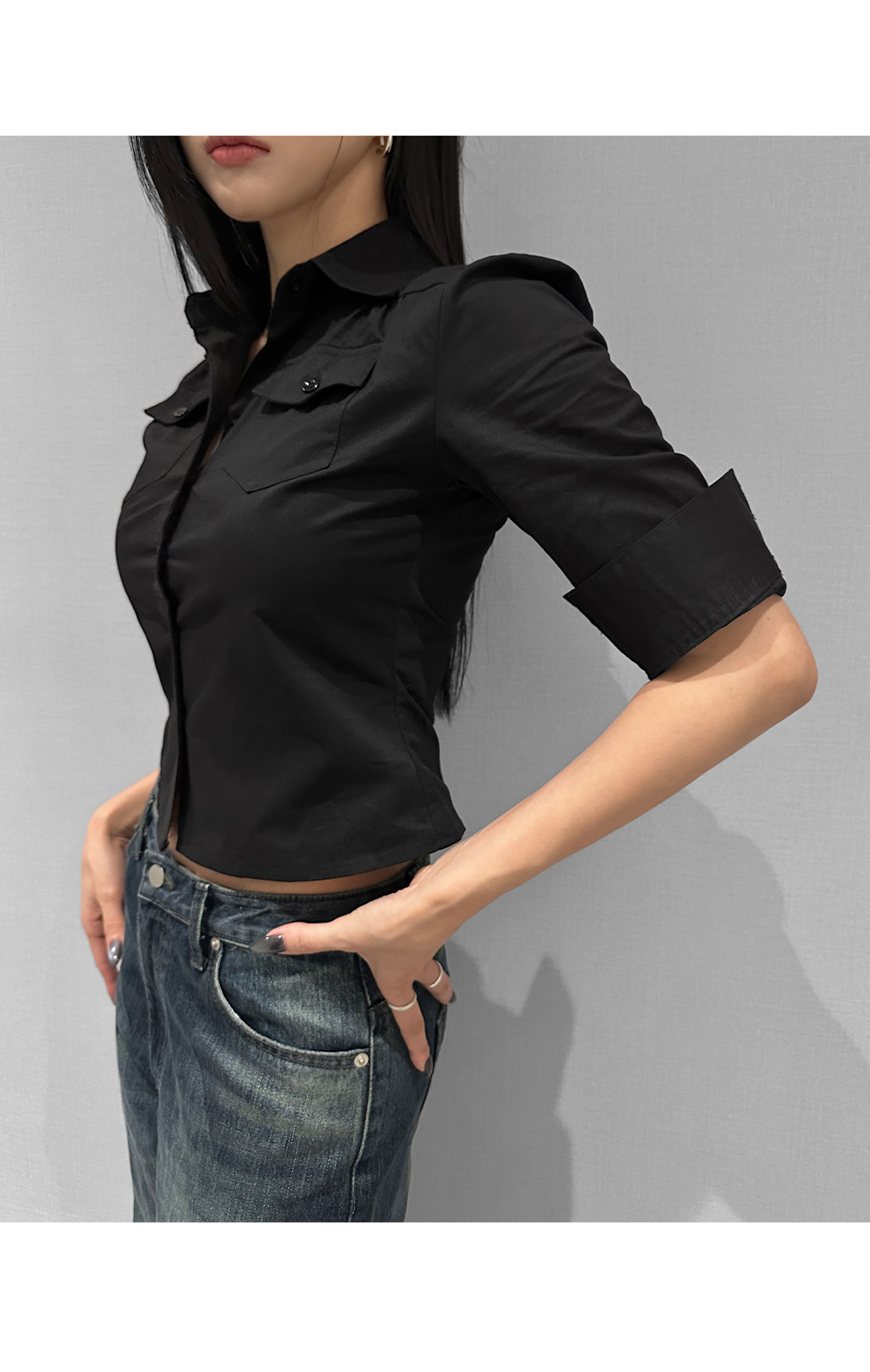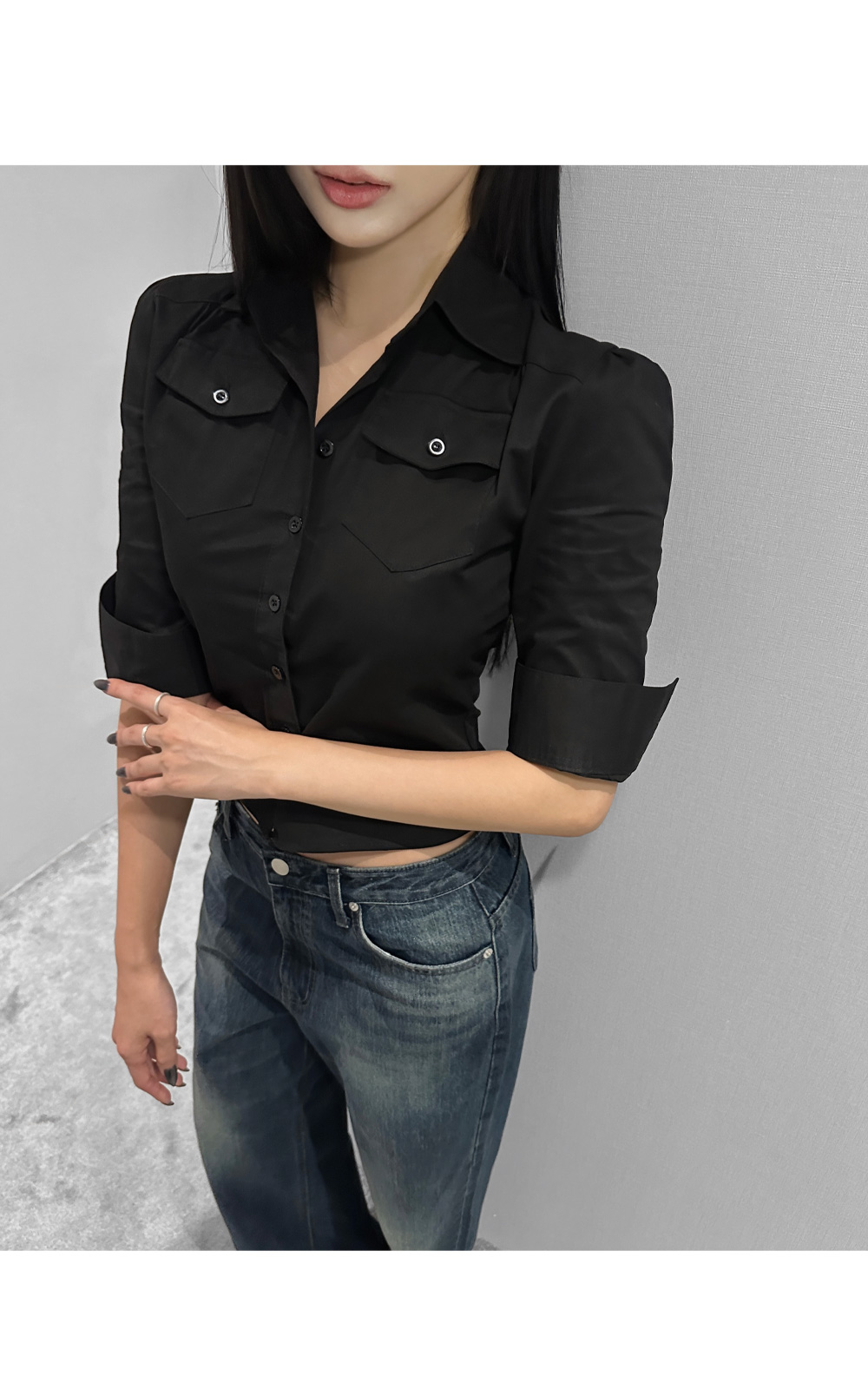 페미닌한 무드가 돋보이는 슬림핏 셔츠입니다. 바디라인을 따라 날씬하게 떨어지는 핏으로 세련된 실루엣을 연출하며, 바스트 플랩 디테일과 7부 기장 소매로 단정하면서도 감각적인 포인트를 더해줍니다.