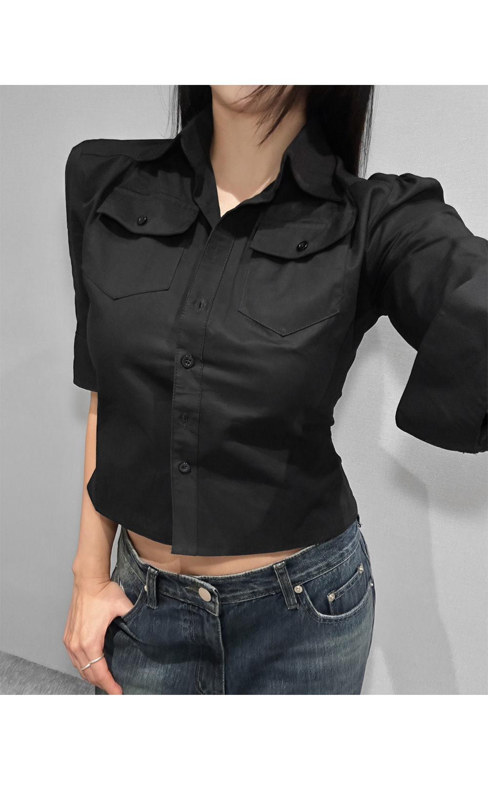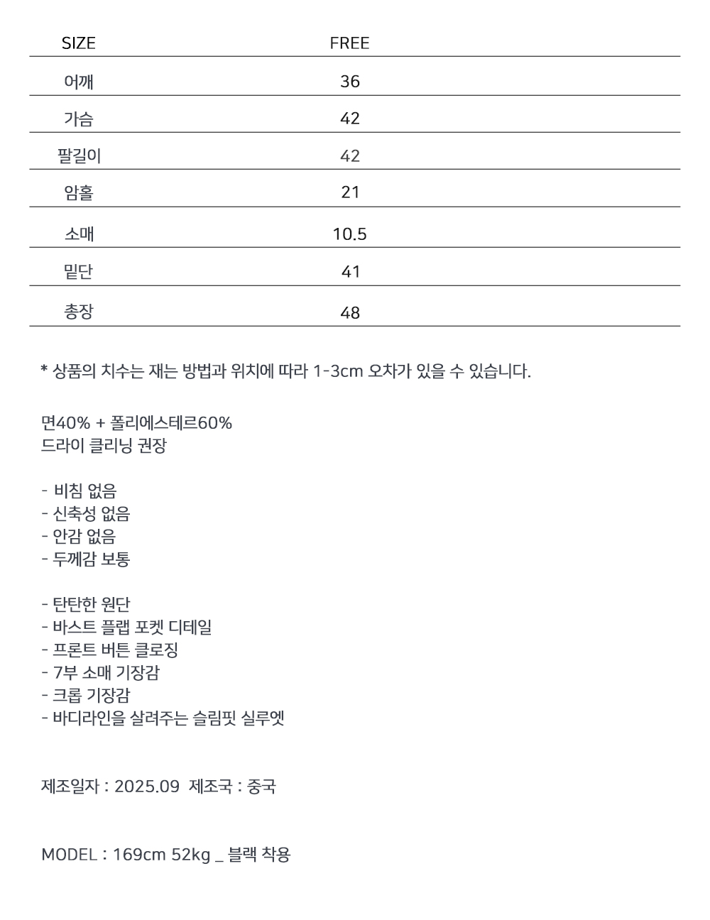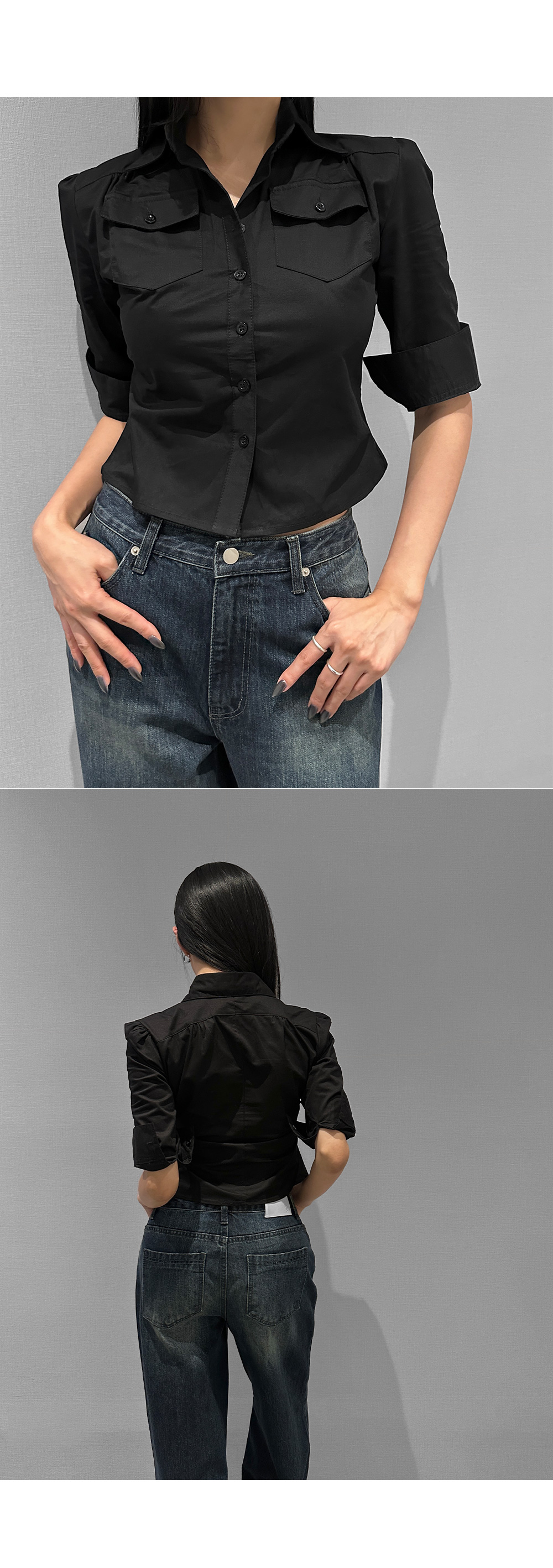 페미닌한 무드가 돋보이는 슬림핏 셔츠입니다. 바디라인을 따라 날씬하게 떨어지는 핏으로 세련된 실루엣을 연출하며, 바스트 플랩 디테일과 7부 기장 소매로 단정하면서도 감각적인 포인트를 더해줍니다.