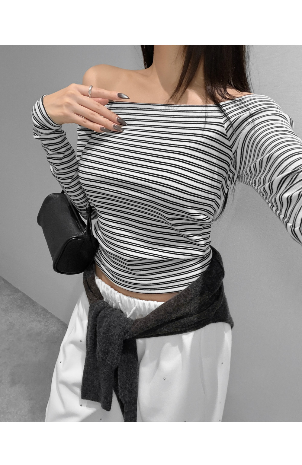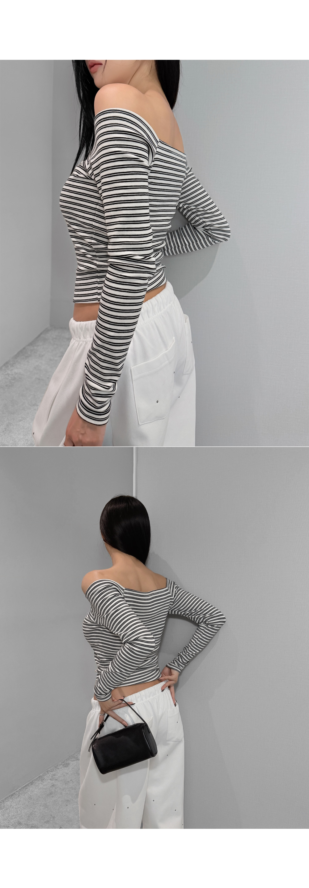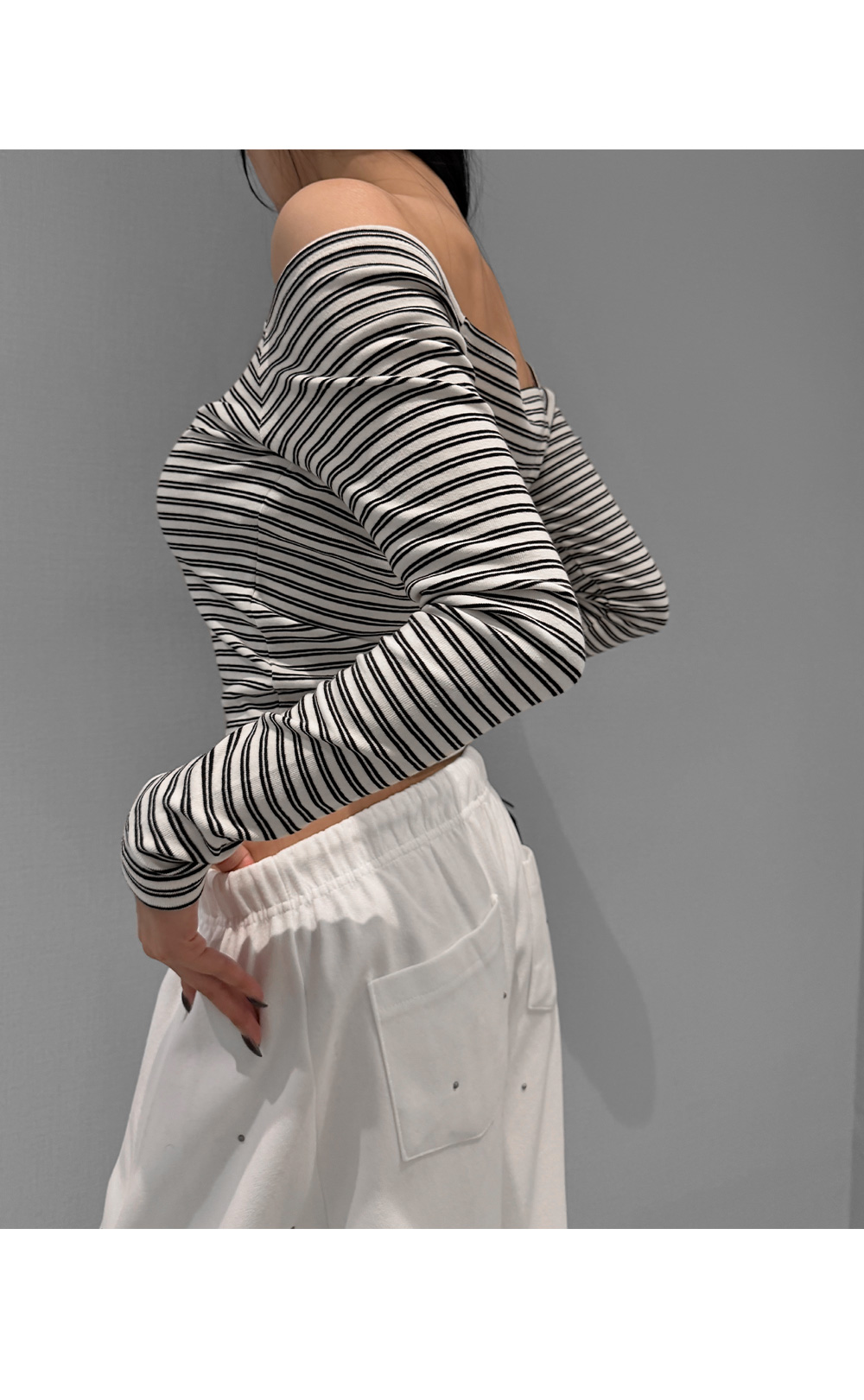 슬림하게 떨어지는 실루엣으로 페미닌한 무드를 강조한 스트라이프 오프숄더 티셔츠입니다. 쇄골 라인을 자연스럽게 드러내는 넓은 스퀘어 숄더 디자인으로 여리한 분위기를 연출하며, 신축성이 우수한 코튼 스판 원단으로 편안한 착용감을 더했습니다.