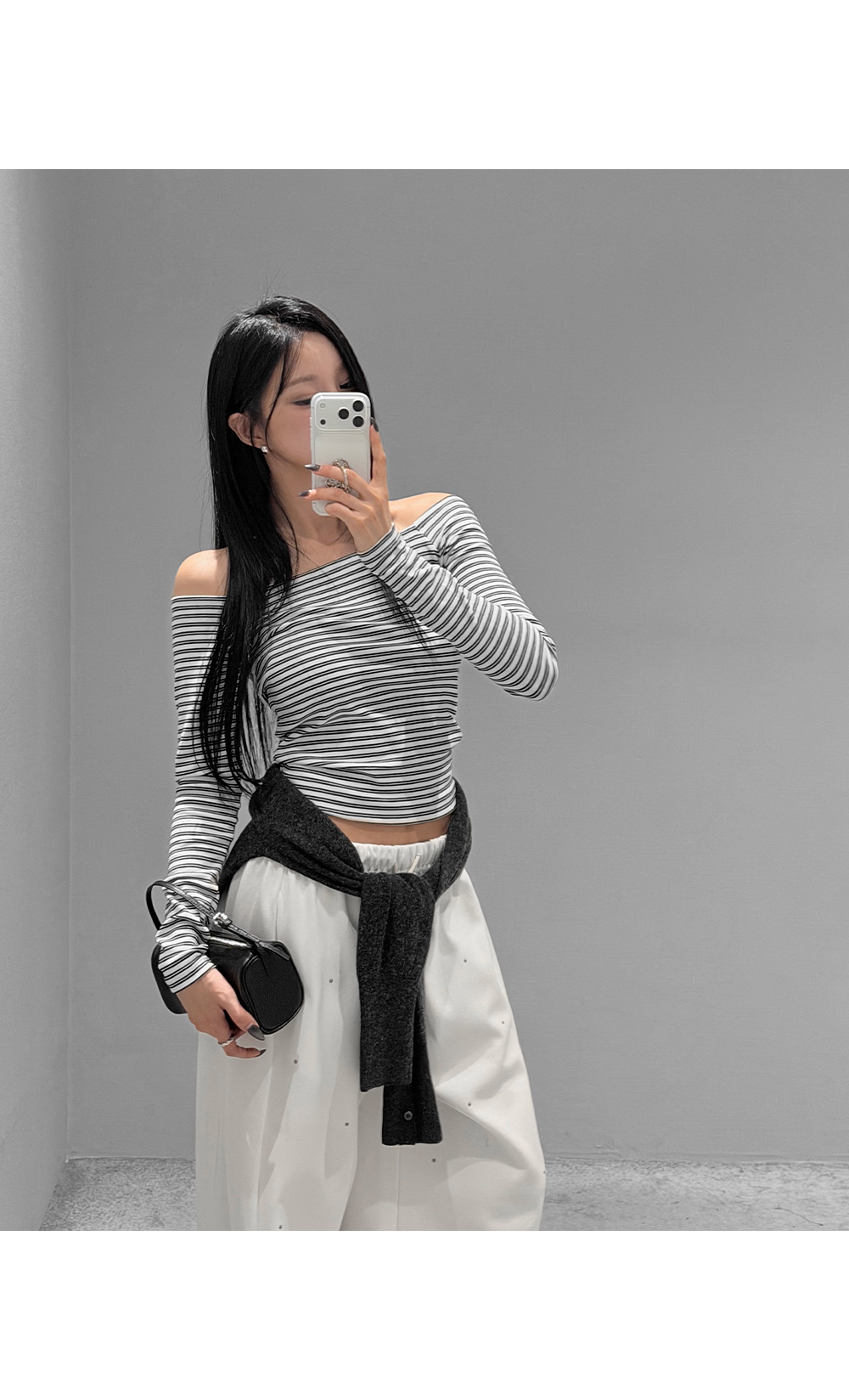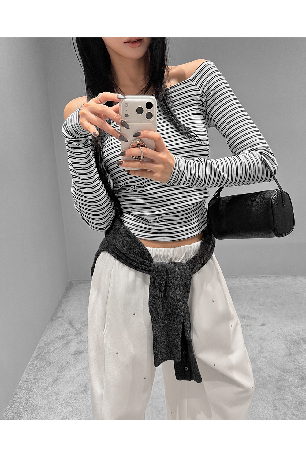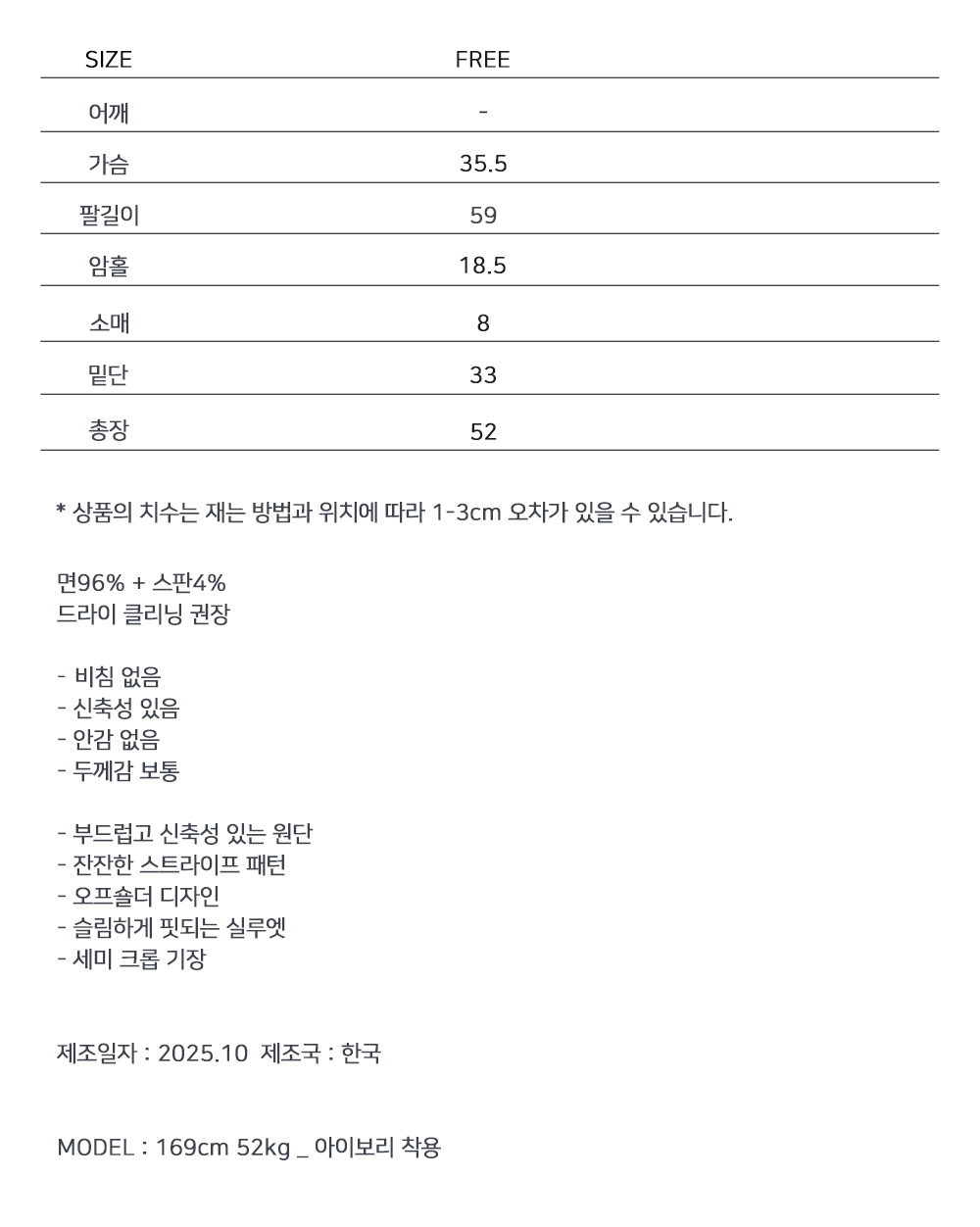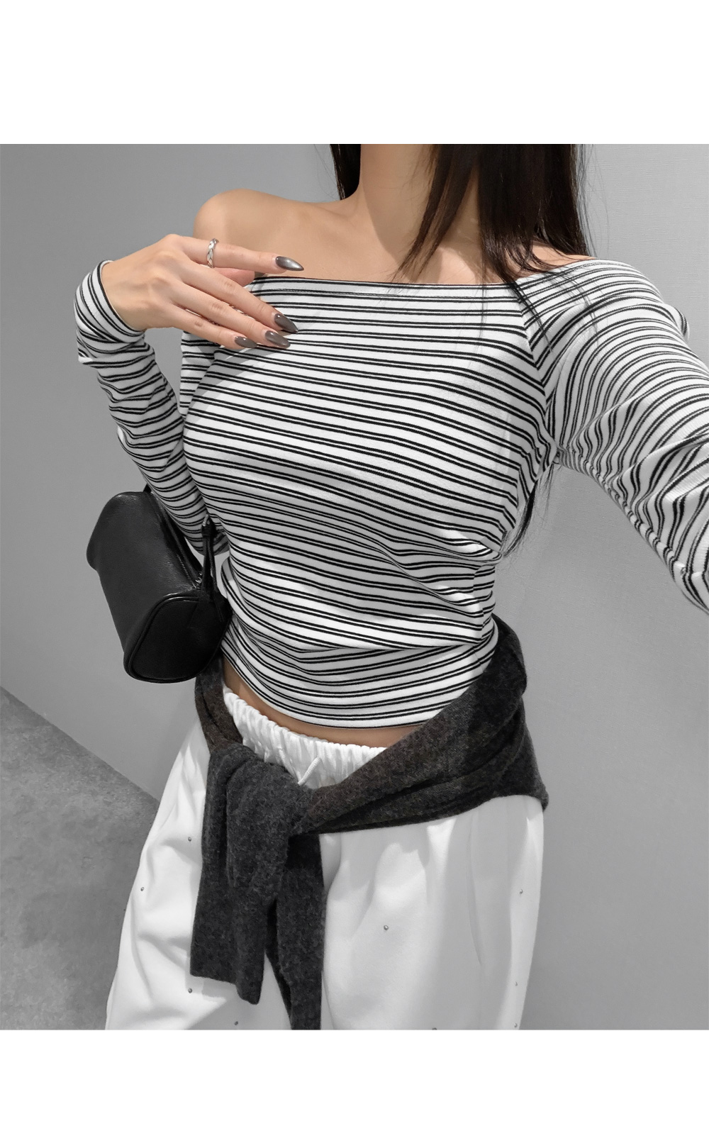 슬림하게 떨어지는 실루엣으로 페미닌한 무드를 강조한 스트라이프 오프숄더 티셔츠입니다. 쇄골 라인을 자연스럽게 드러내는 넓은 스퀘어 숄더 디자인으로 여리한 분위기를 연출하며, 신축성이 우수한 코튼 스판 원단으로 편안한 착용감을 더했습니다.