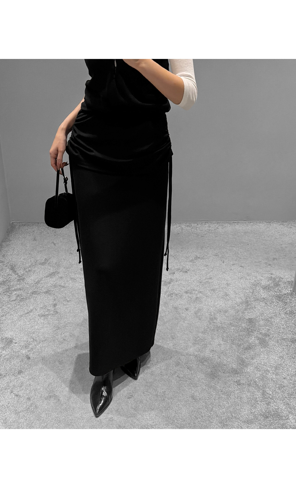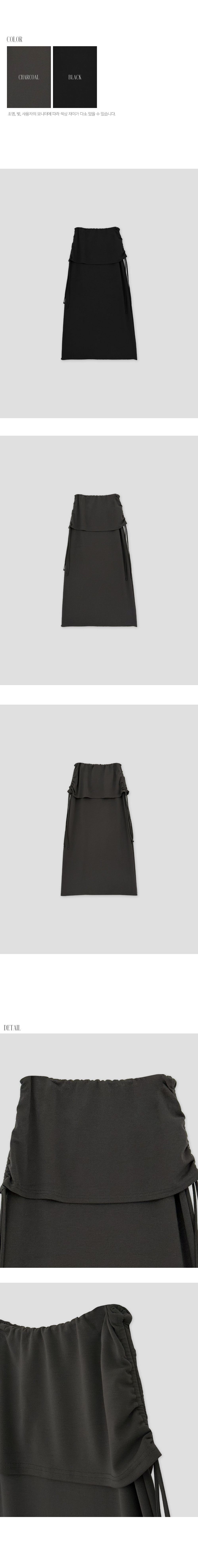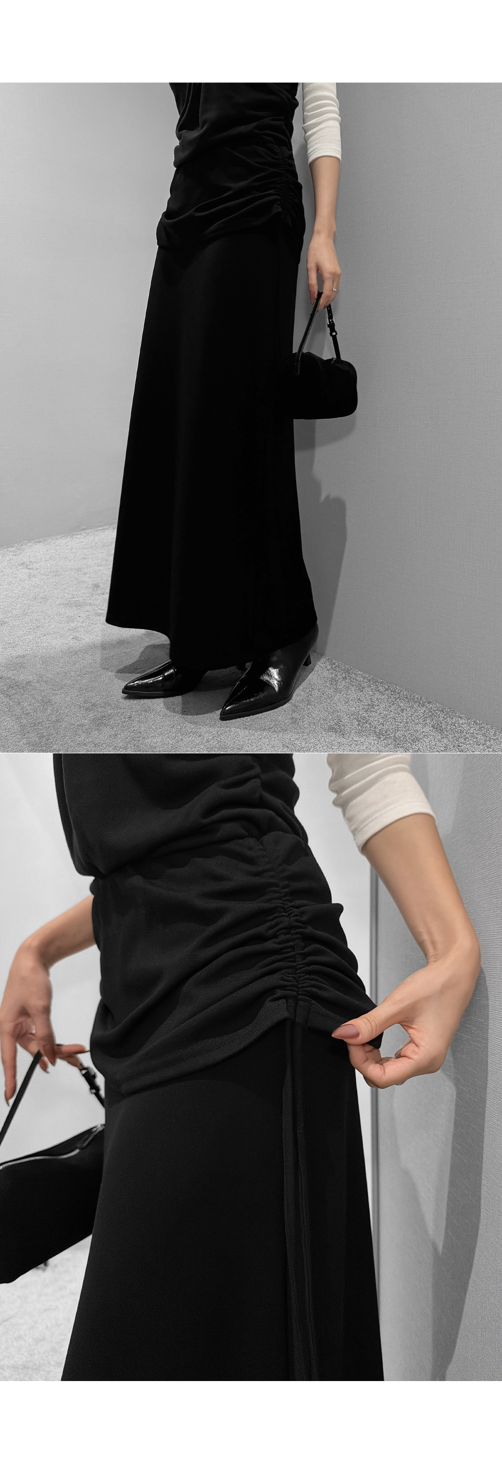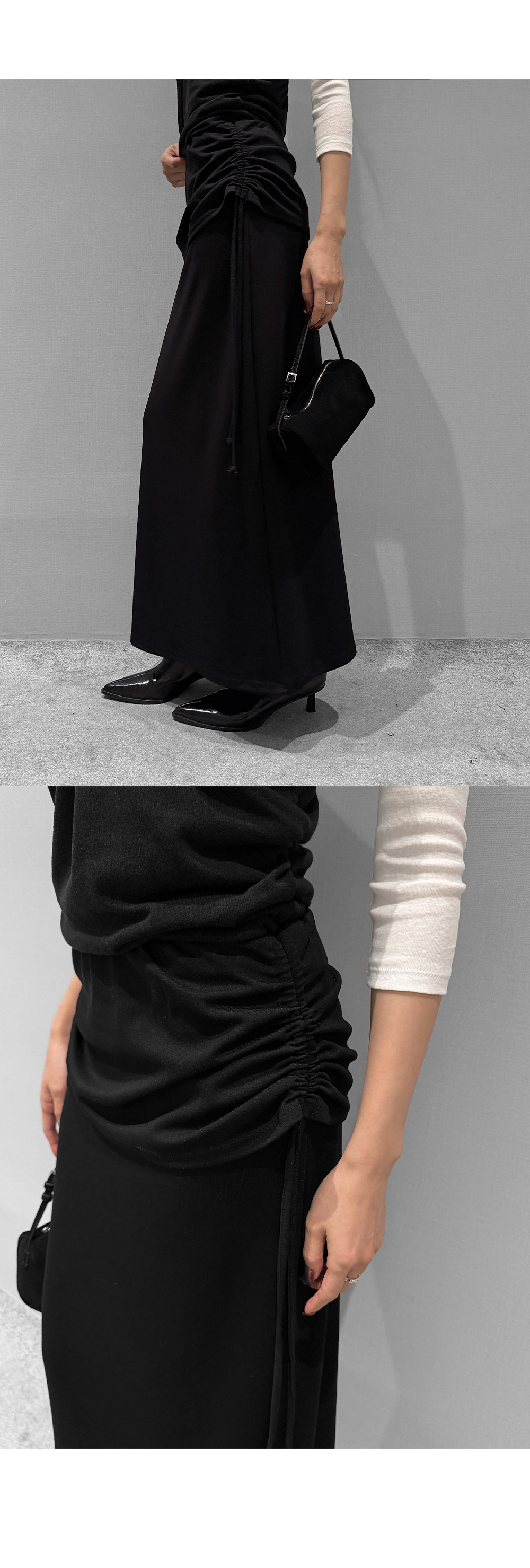 옆 라인 셔링 디테일로 실루엣에 포인트를 준 롱스커트입니다. 셔링 스트링을 조절해 자연스러운 드레이프를 연출할 수 있으며, 허리를 안정감 있게 감싸주는 디자인으로 슬림한 라인을 완성합니다.