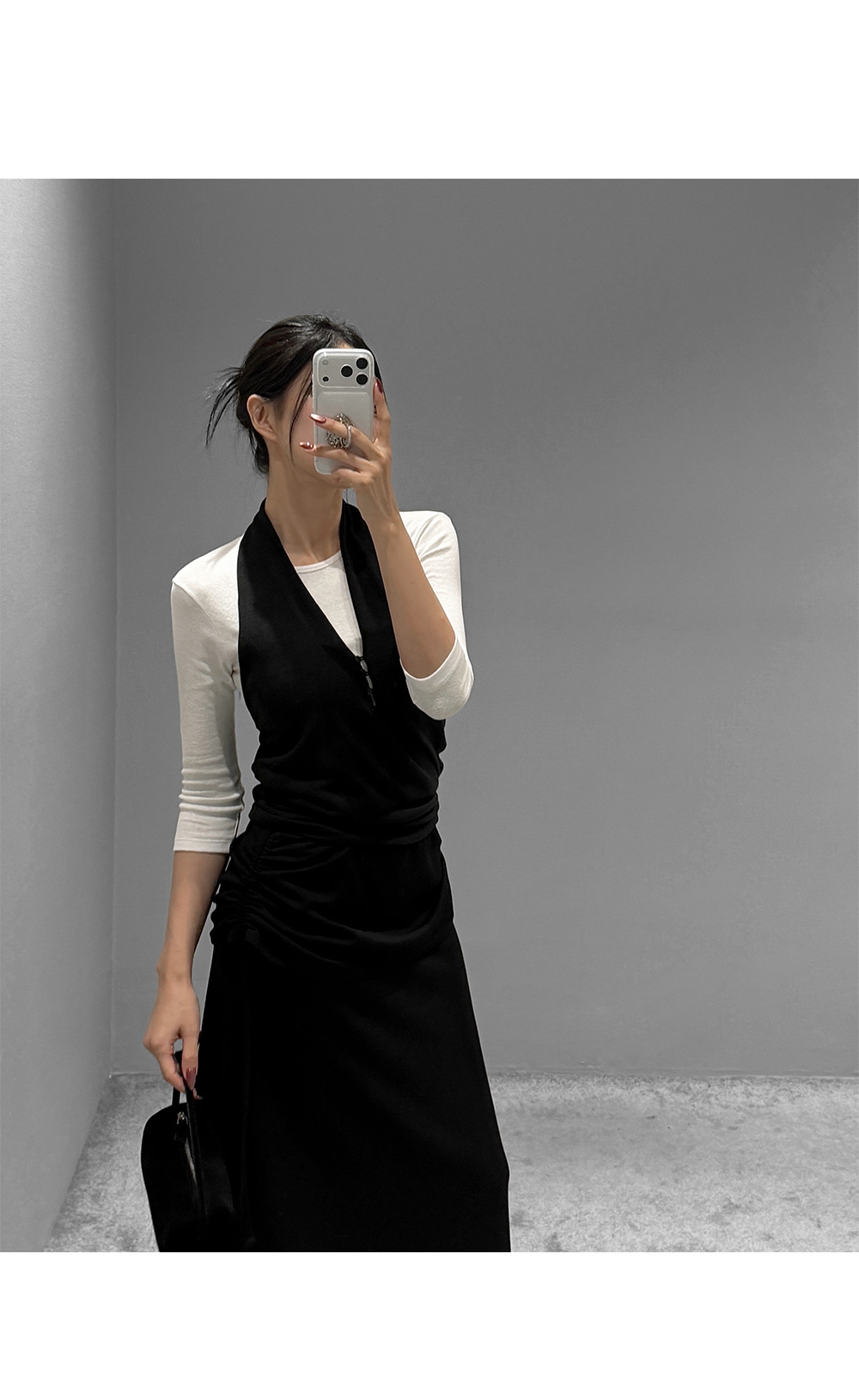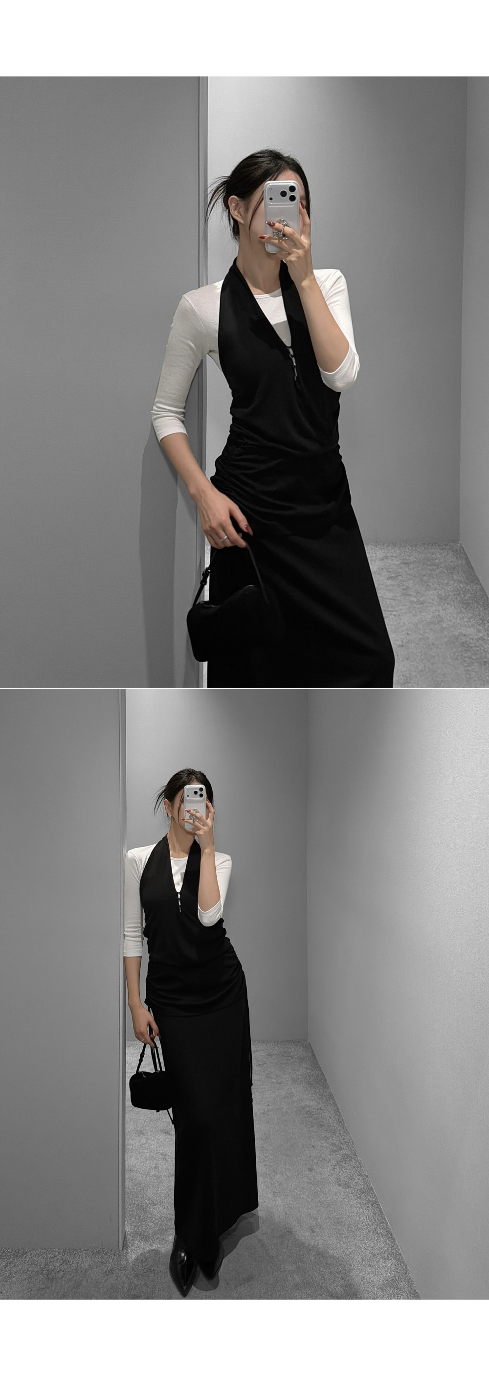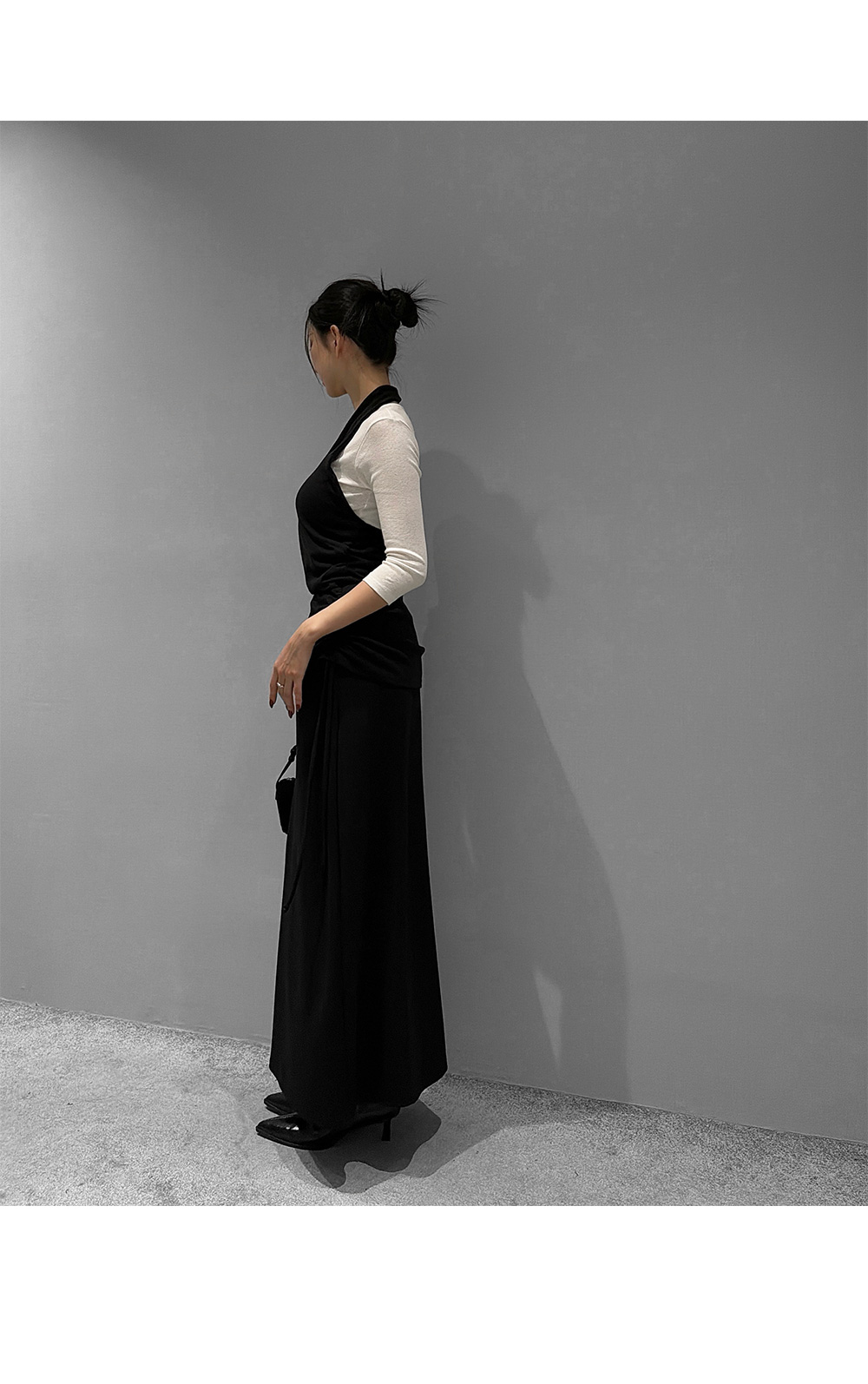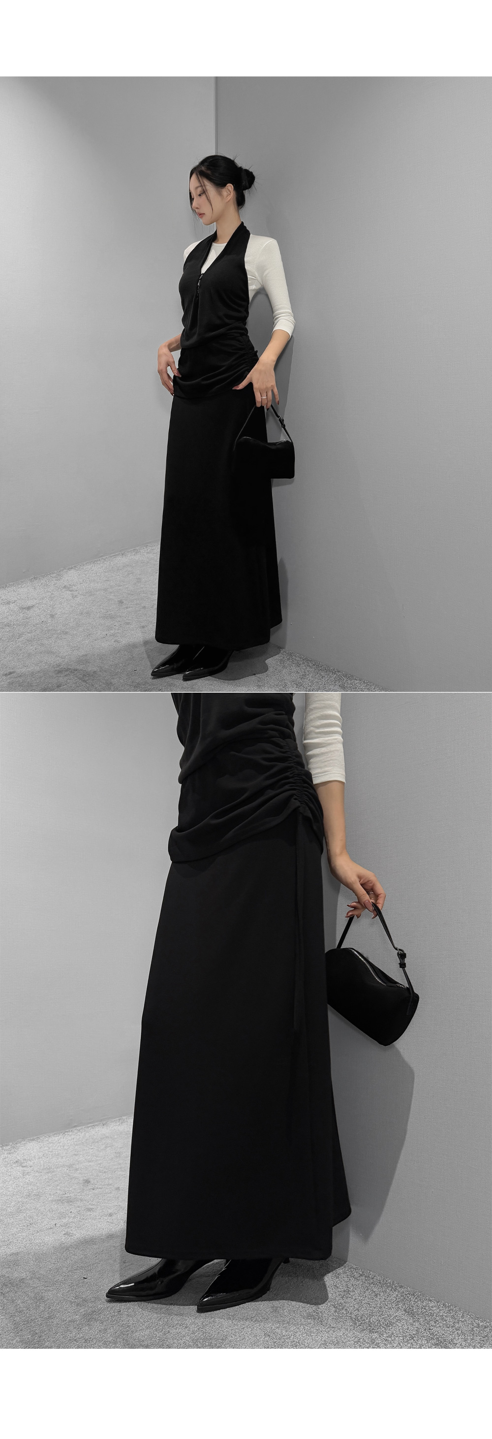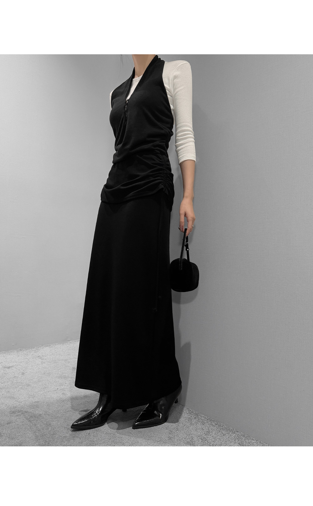 옆 라인 셔링 디테일로 실루엣에 포인트를 준 롱스커트입니다. 셔링 스트링을 조절해 자연스러운 드레이프를 연출할 수 있으며, 허리를 안정감 있게 감싸주는 디자인으로 슬림한 라인을 완성합니다.