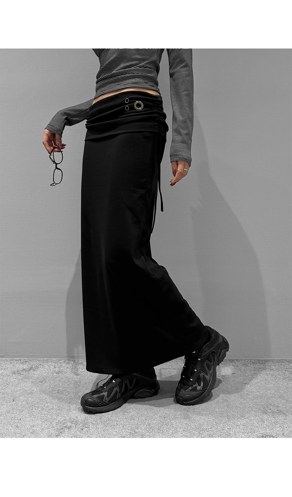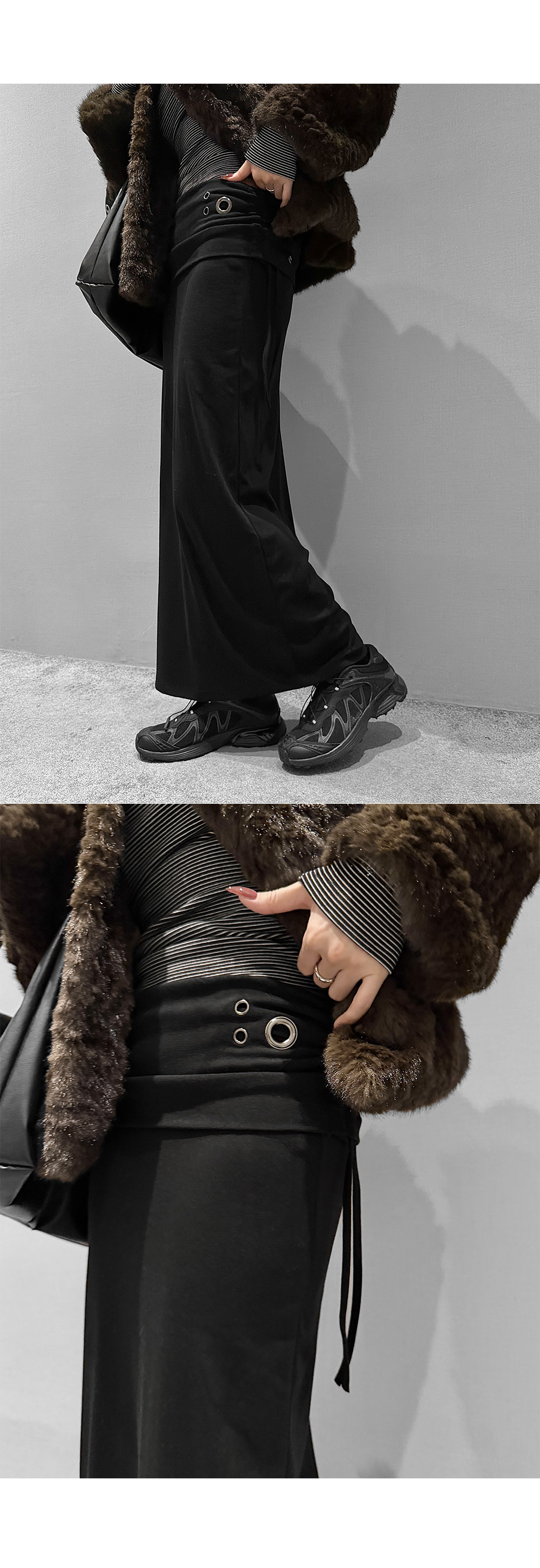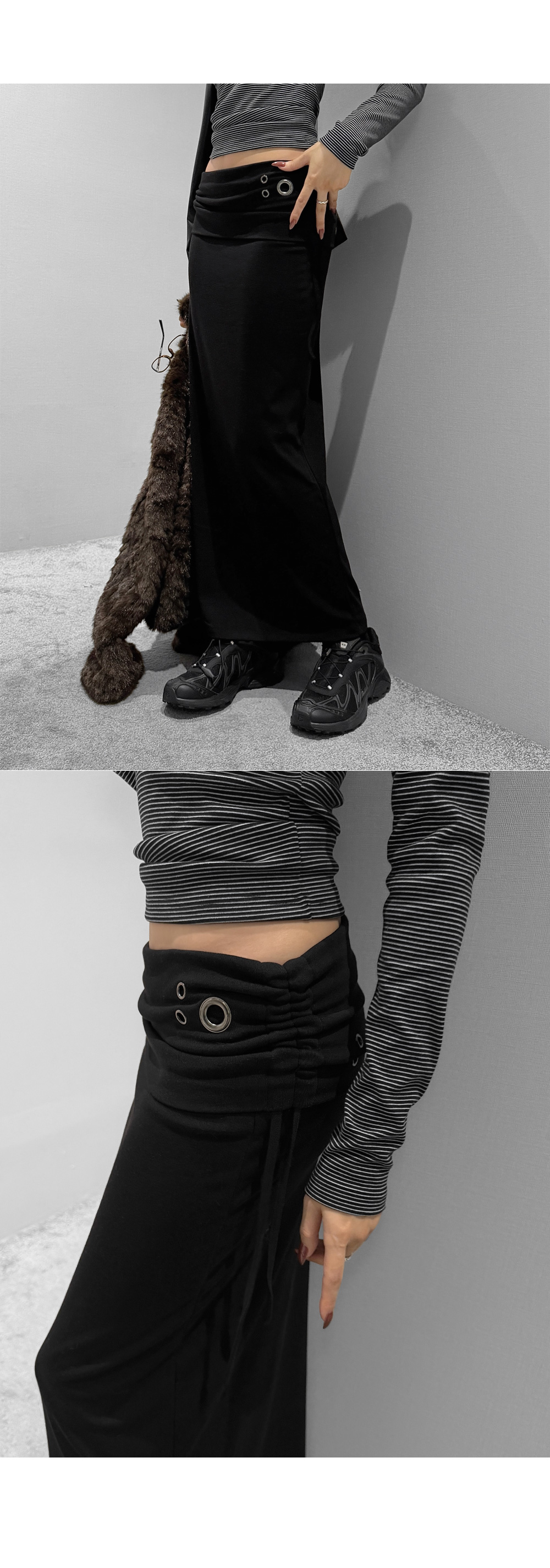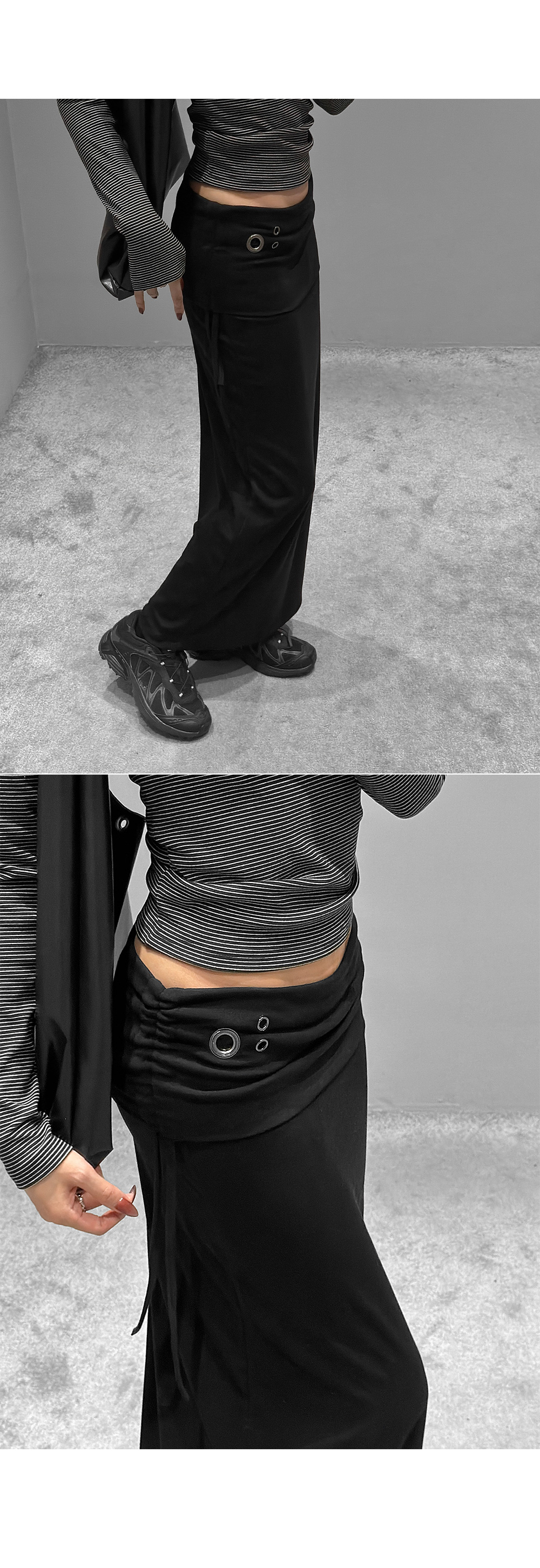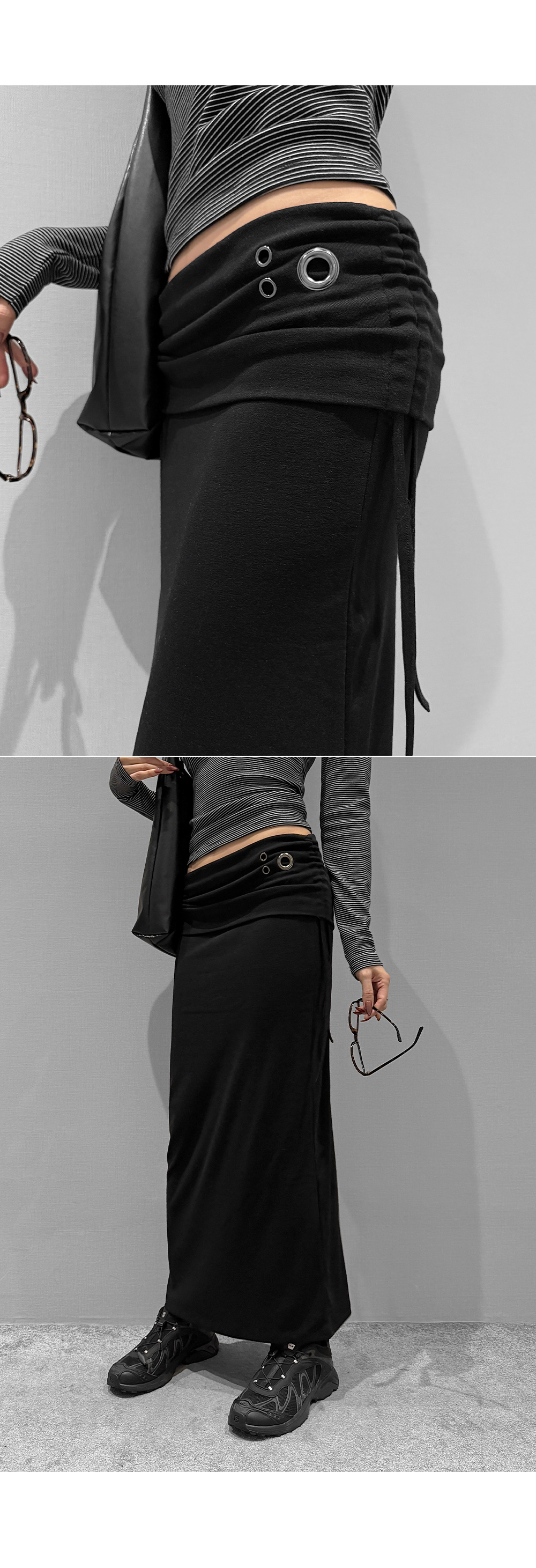 슬림하게 떨어지는 라인에 구조적인 아이렛 디테일이 더해진 롱 스커트입니다. 탄탄하면서도 유연하게 몸을 감싸주며, 사이드 스트링 포인트로 허리 라인을 조절할 수 있습니다. 미니멀한 디자인 속 은은한 디테일로 세련된 무드를 연출합니다