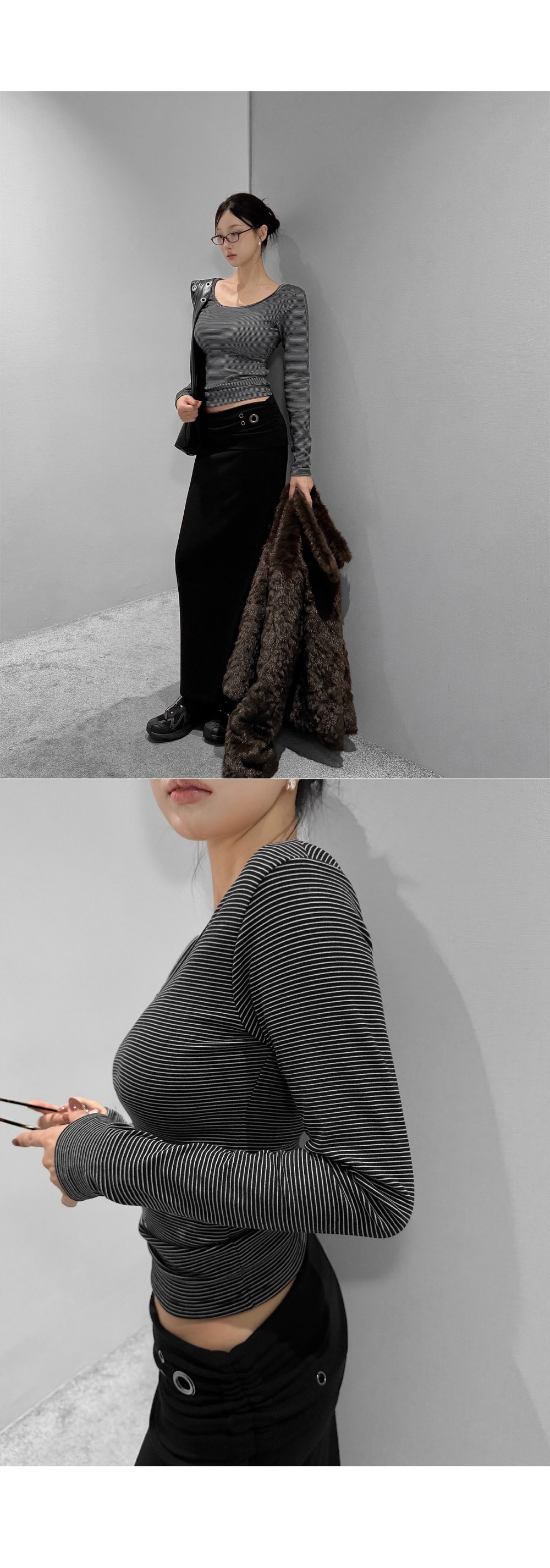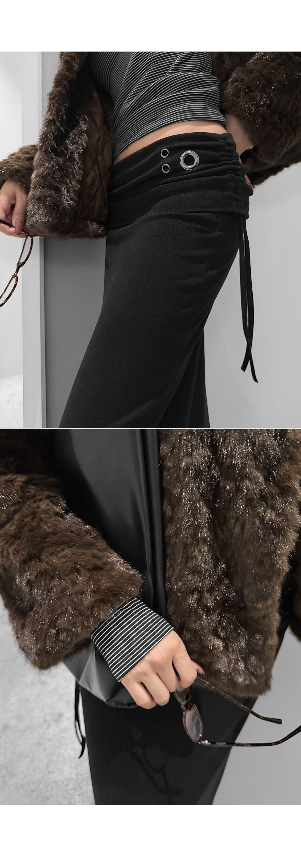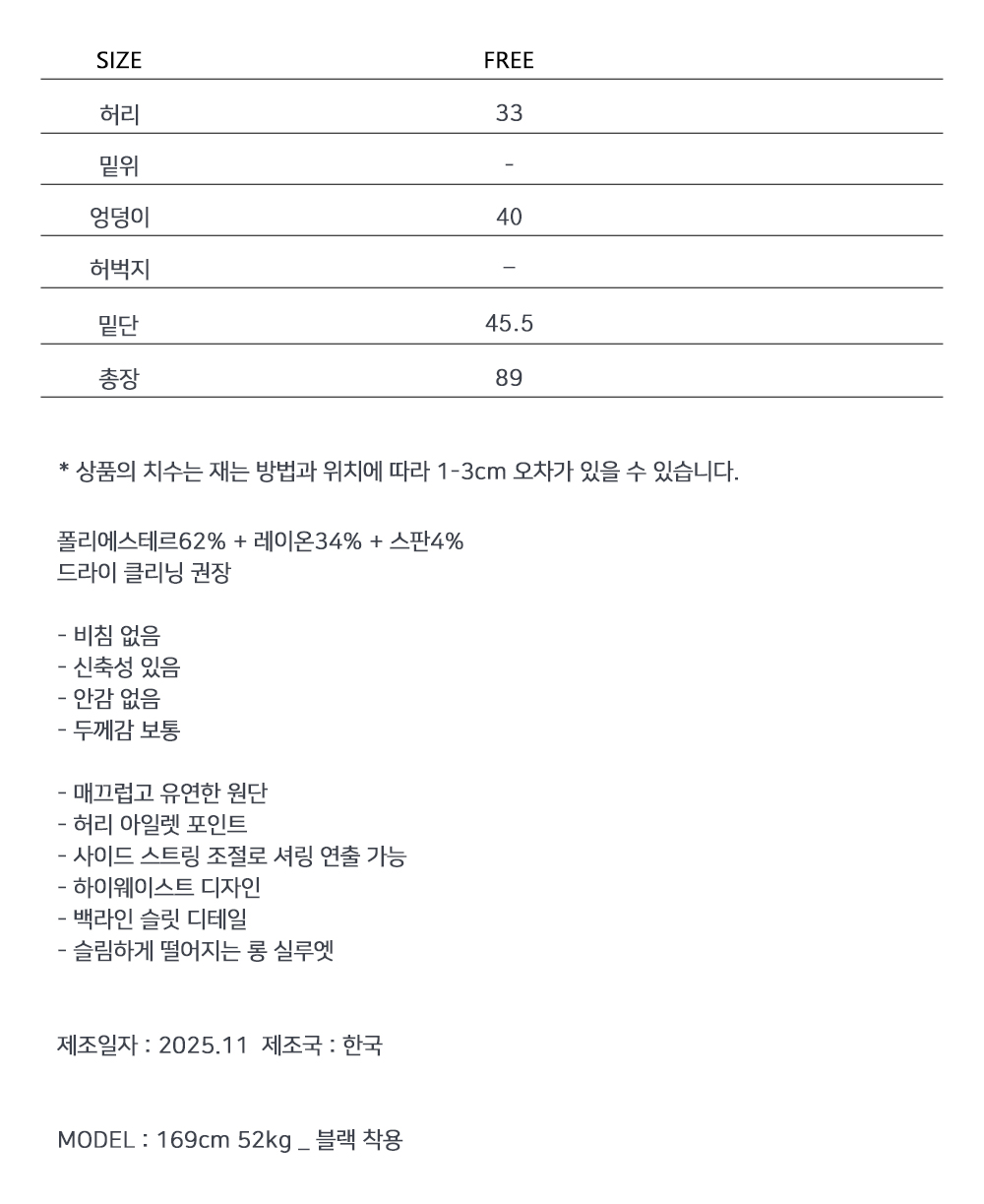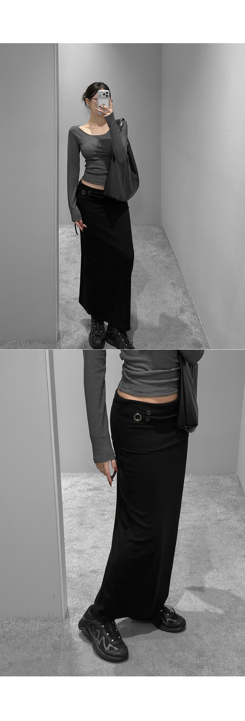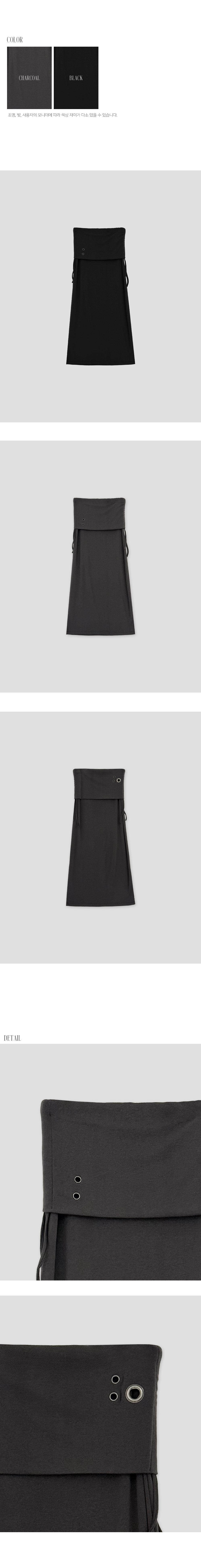 슬림하게 떨어지는 라인에 구조적인 아이렛 디테일이 더해진 롱 스커트입니다. 탄탄하면서도 유연하게 몸을 감싸주며, 사이드 스트링 포인트로 허리 라인을 조절할 수 있습니다. 미니멀한 디자인 속 은은한 디테일로 세련된 무드를 연출합니다