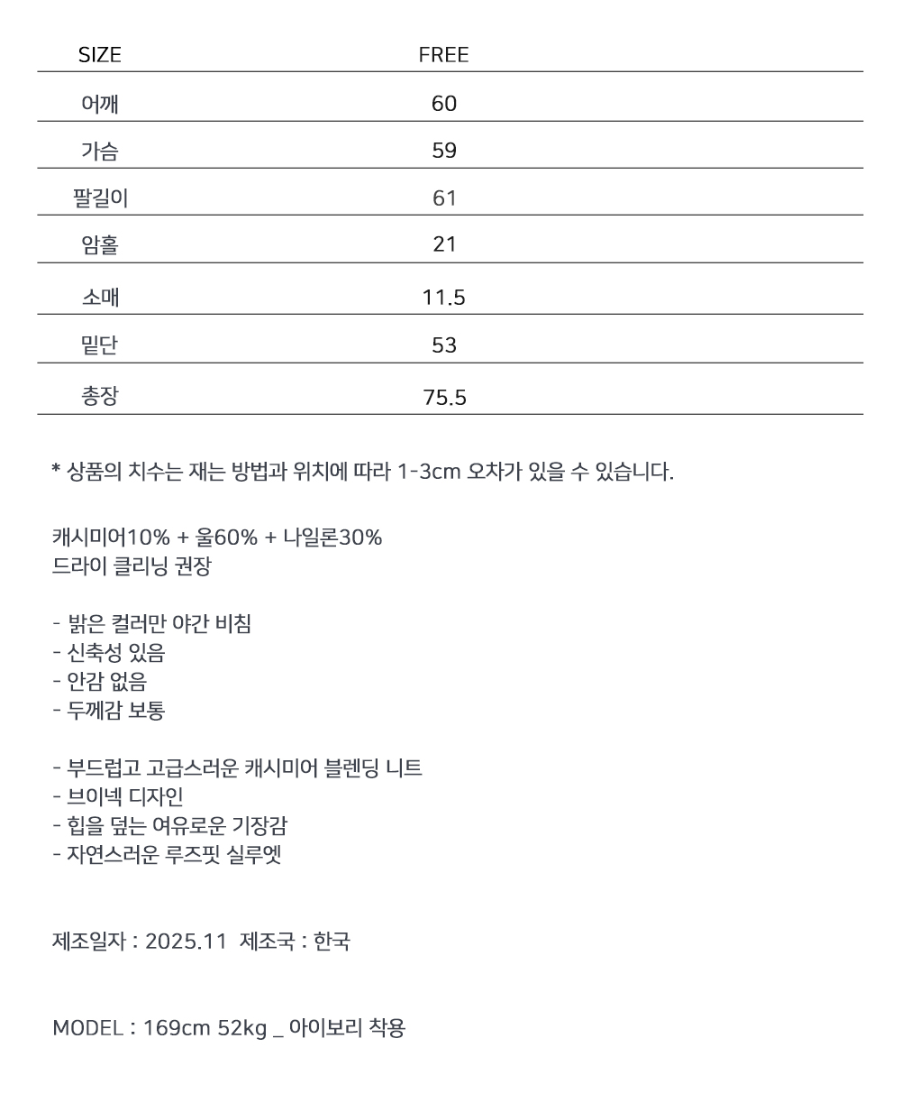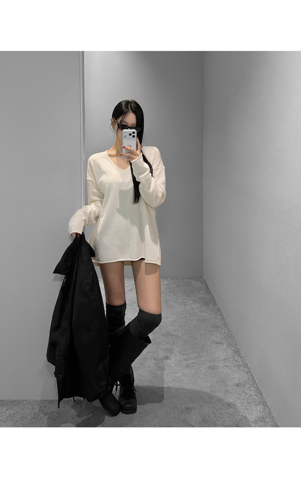 은은한 포근함이 감도는 캐시미어 블렌드 브이넥 니트입니다. 루즈한 실루엣으로 자연스럽게 흐르듯 떨어지며, 깊지 않은 브이넥 라인으로 단독 착용은 물론 레이어드로 매치하기 좋습니다. 가볍지만 따뜻한 보온성으로 간절기부터 겨울까지 활용하기 좋은 아이템입니다