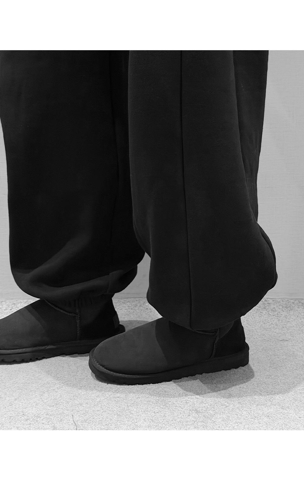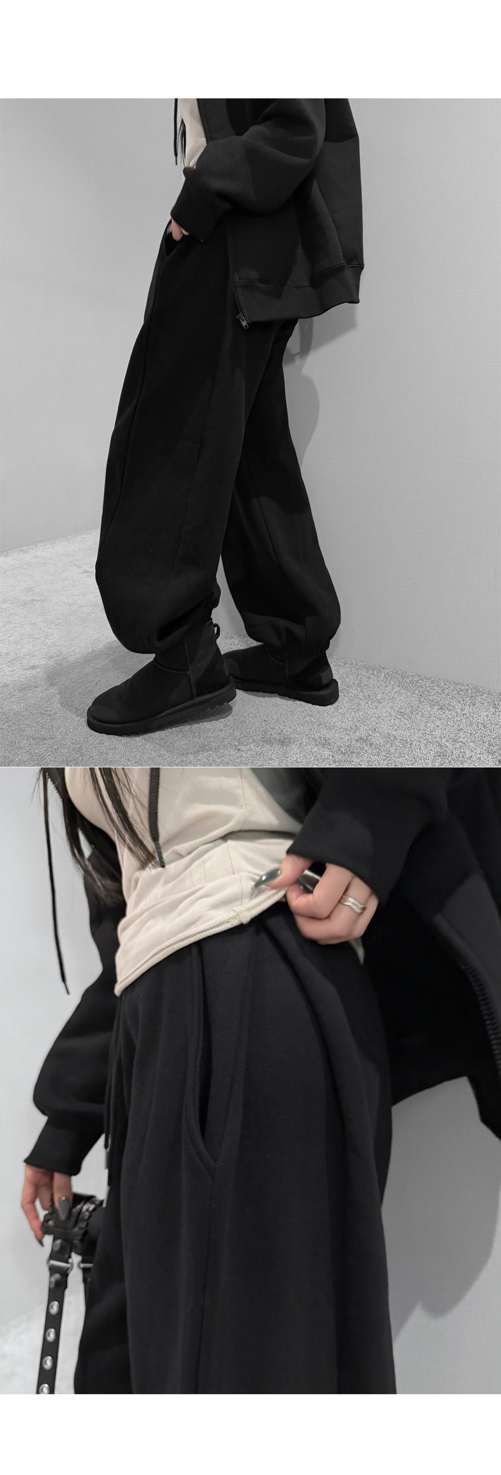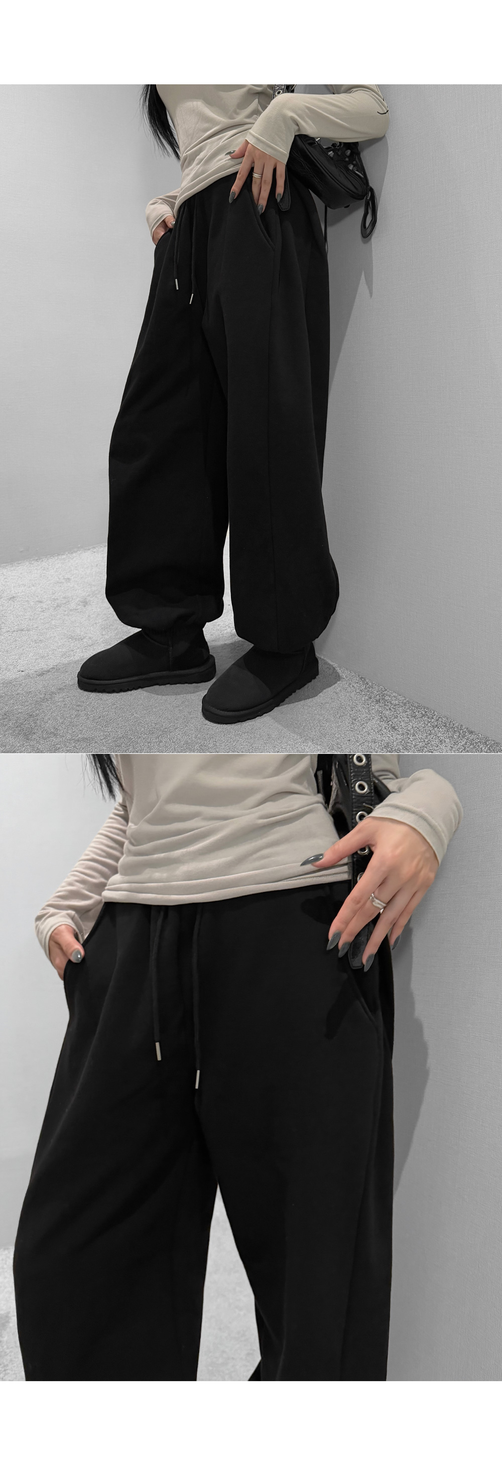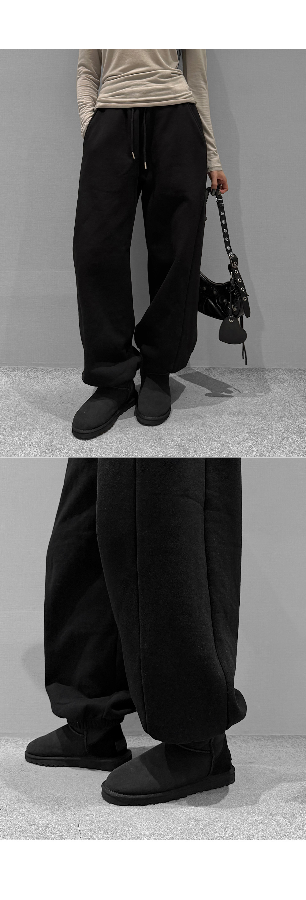 탄탄한 코튼 원단에 부드러운 기모를 더해 포근하게 입기 좋은 조거 팬츠입니다. 허리 스트링과 밑단 밴딩으로 안정적인 착용감을 주며, 여유롭게 떨어지는 와이드 핏이 세련된 실루엣을 완성합니다. 부츠와 매치하면 밸런스가 잘 맞아 함께 코디 추천드립니다.
