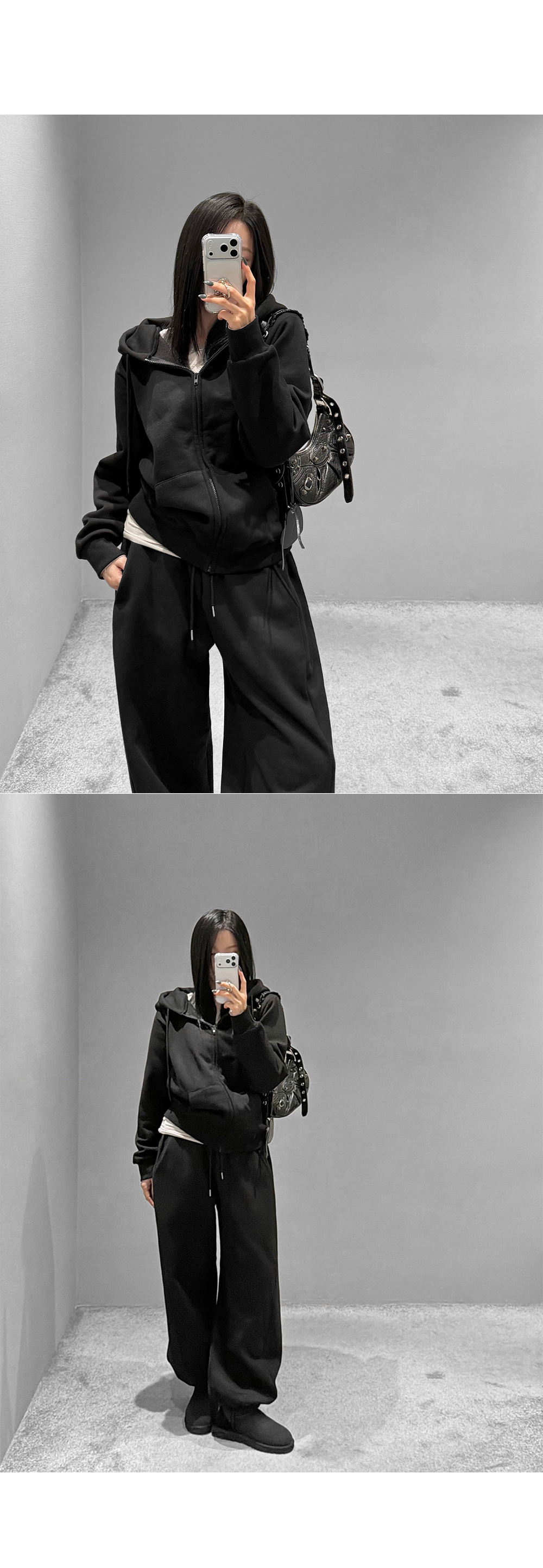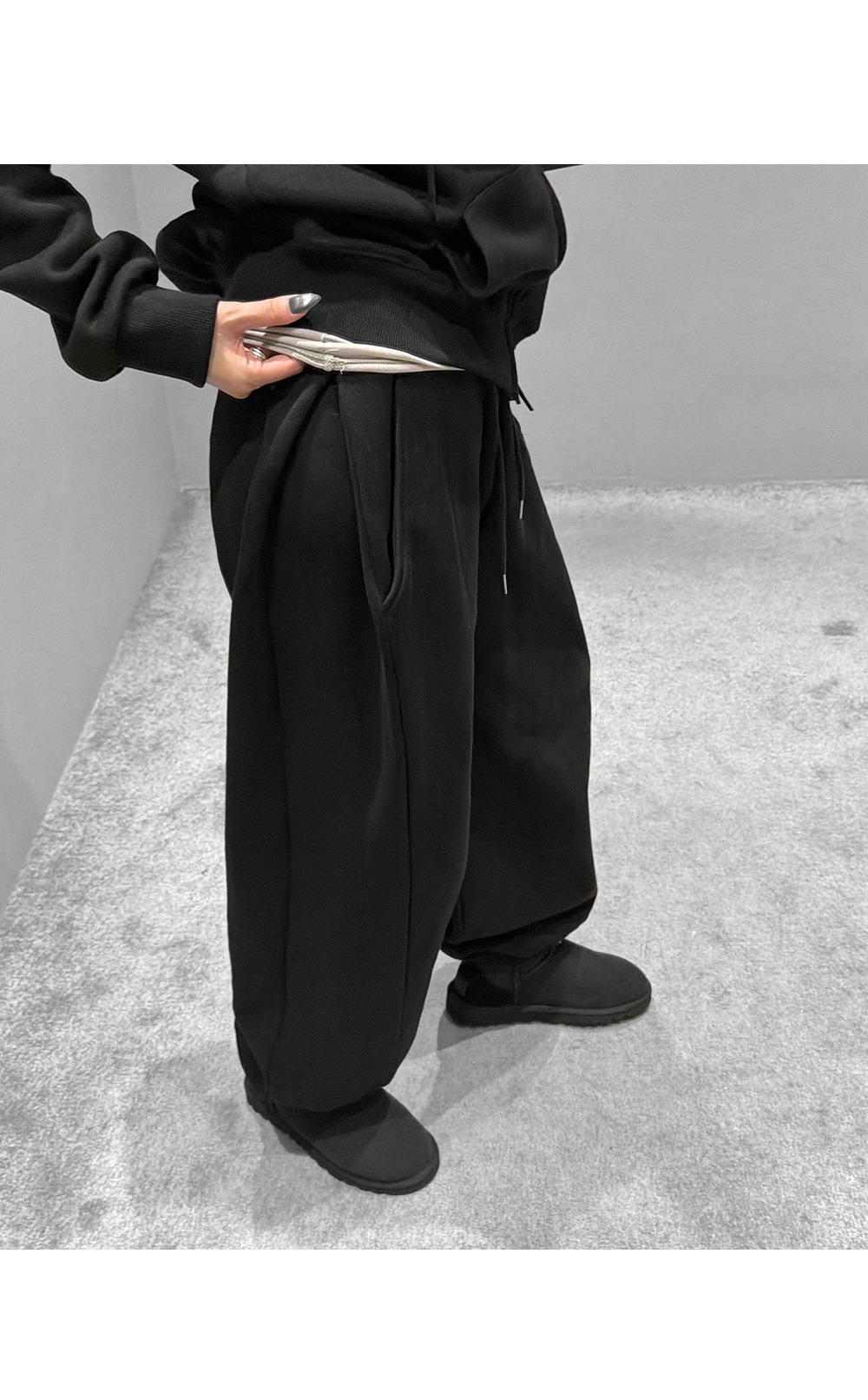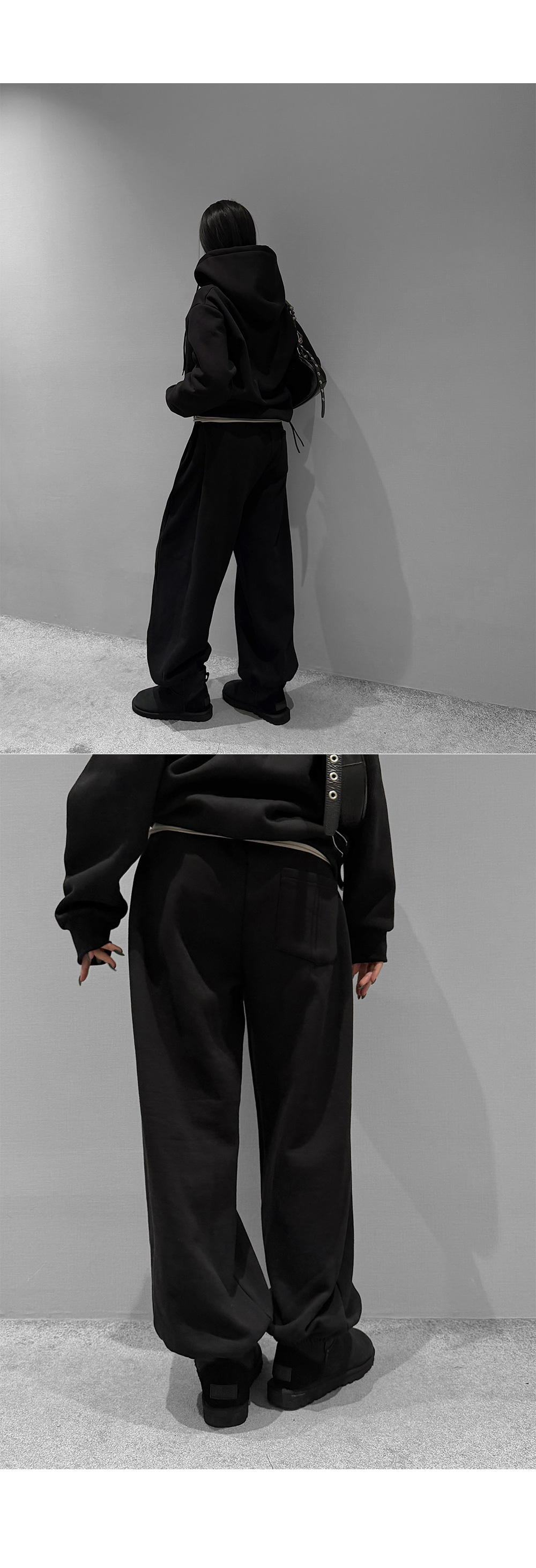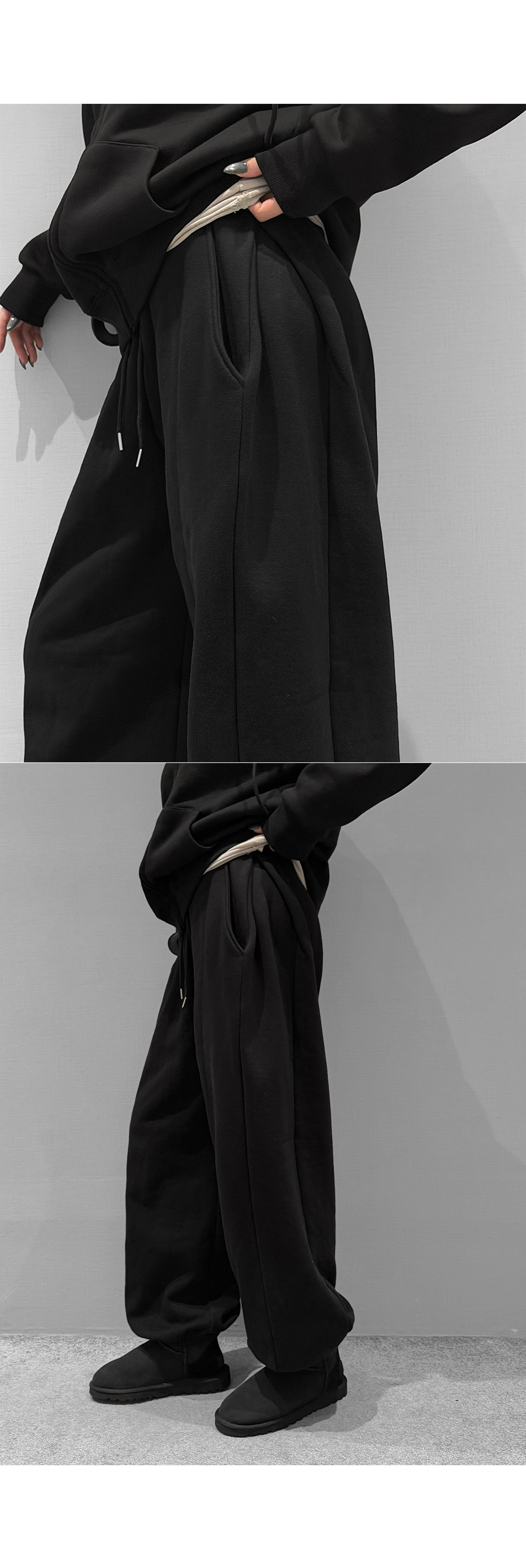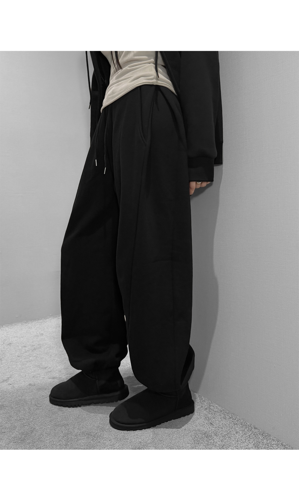 탄탄한 코튼 원단에 부드러운 기모를 더해 포근하게 입기 좋은 조거 팬츠입니다. 허리 스트링과 밑단 밴딩으로 안정적인 착용감을 주며, 여유롭게 떨어지는 와이드 핏이 세련된 실루엣을 완성합니다. 부츠와 매치하면 밸런스가 잘 맞아 함께 코디 추천드립니다.