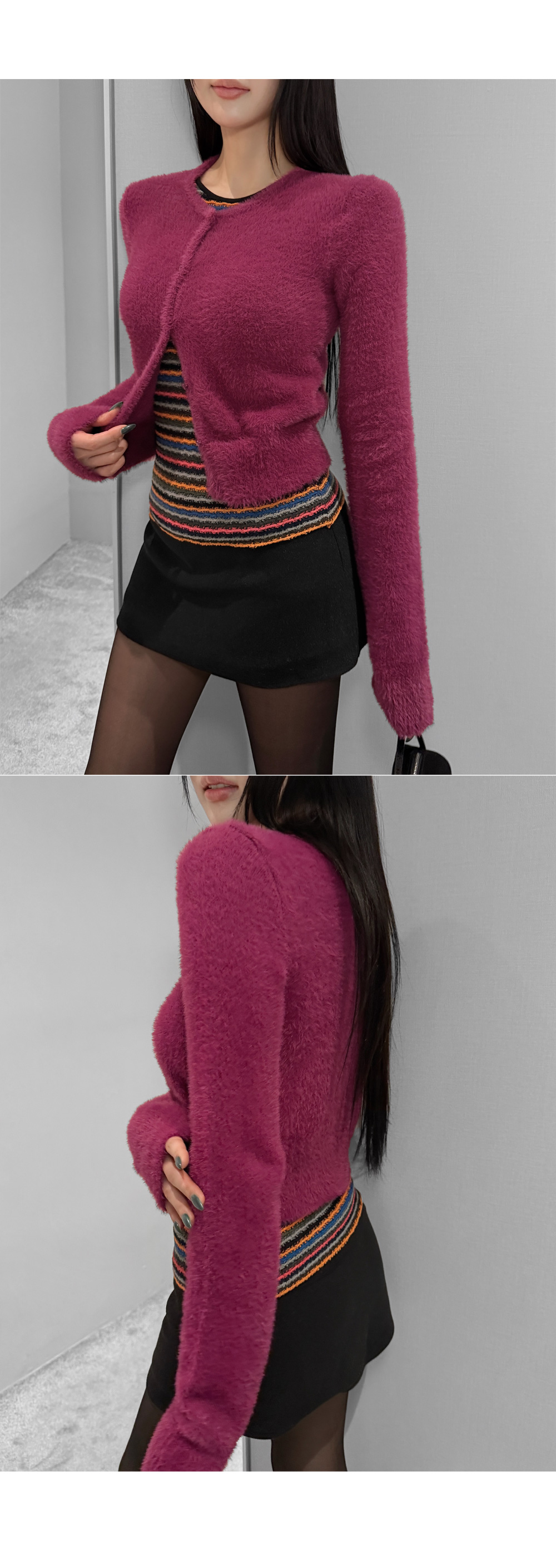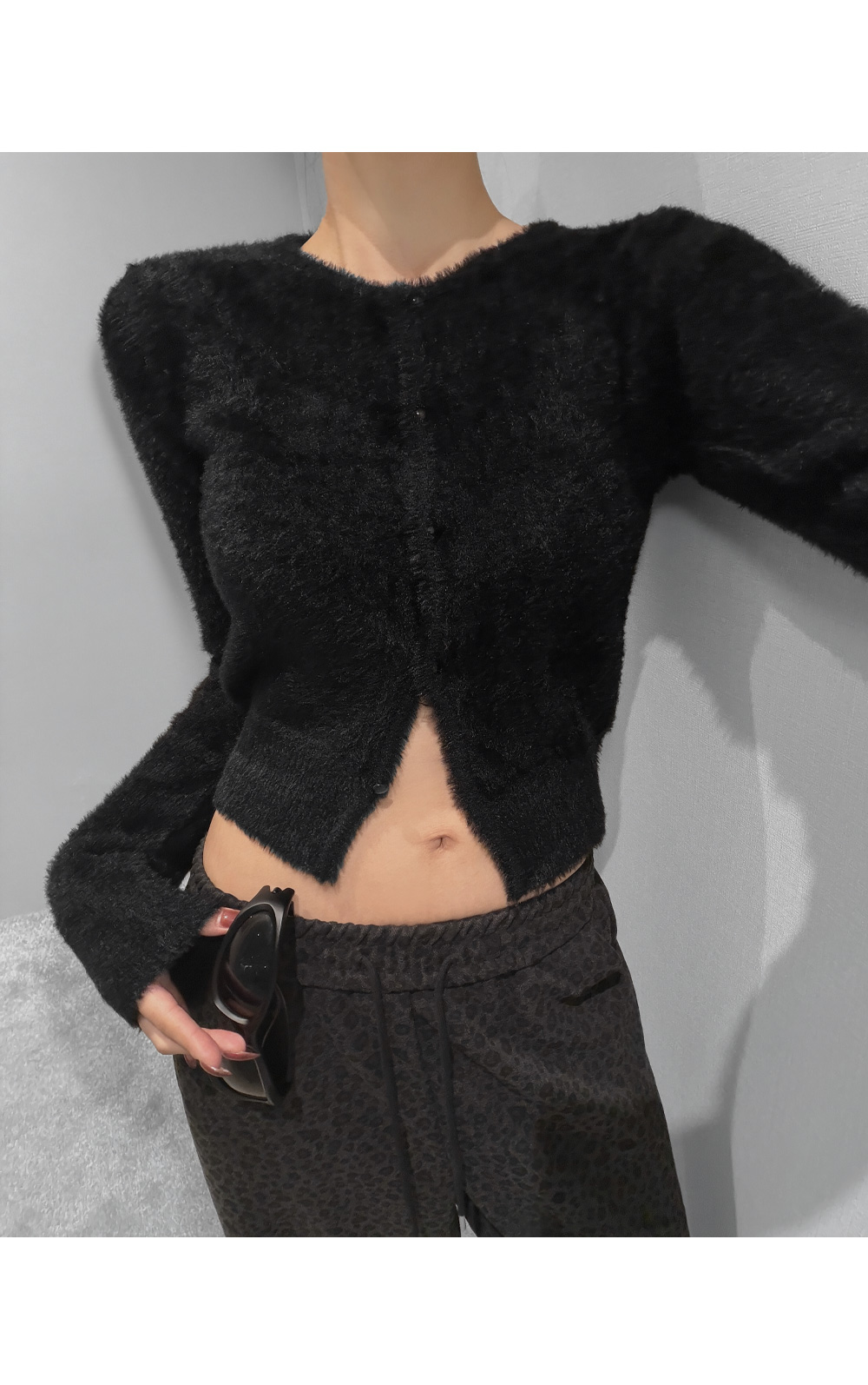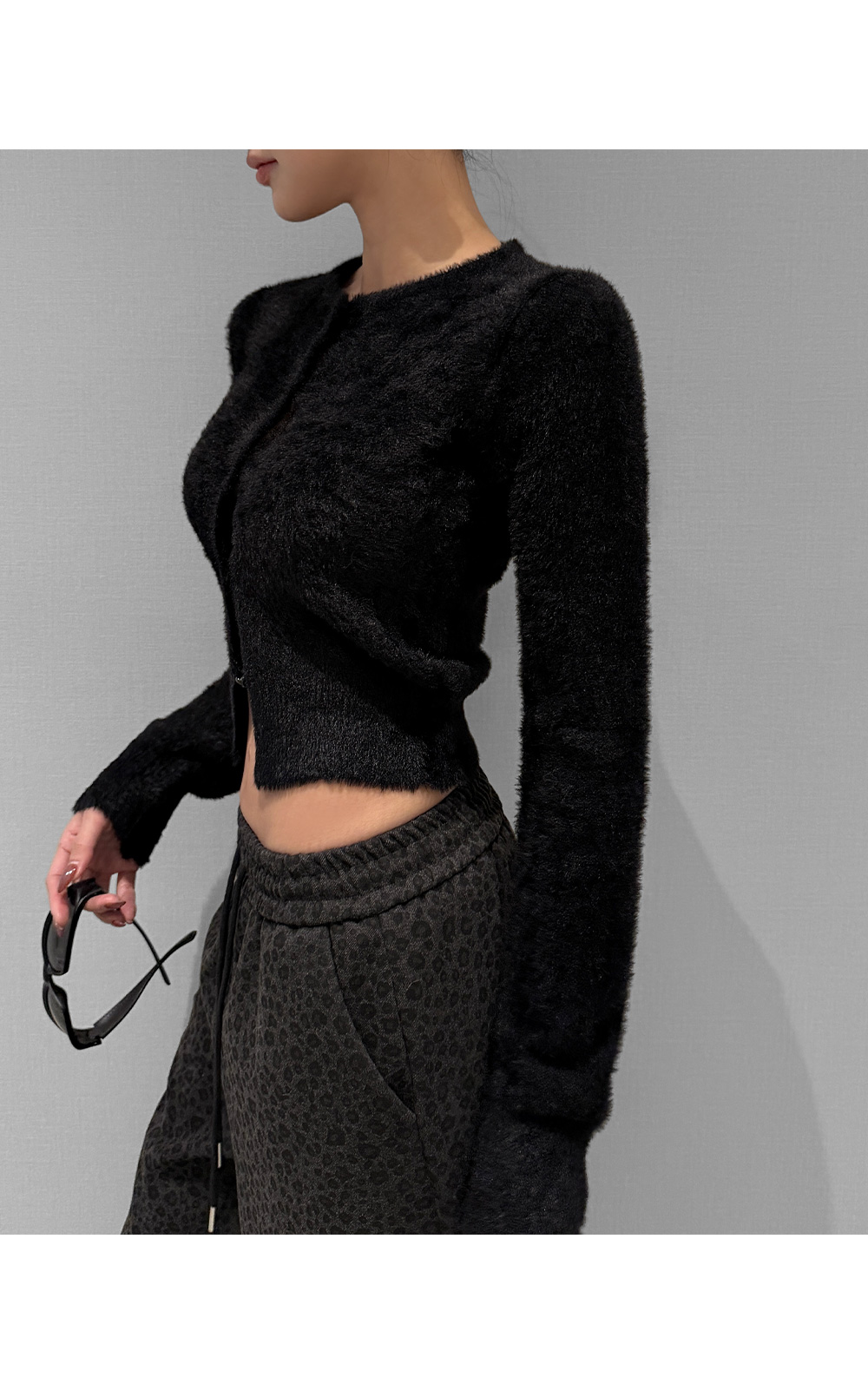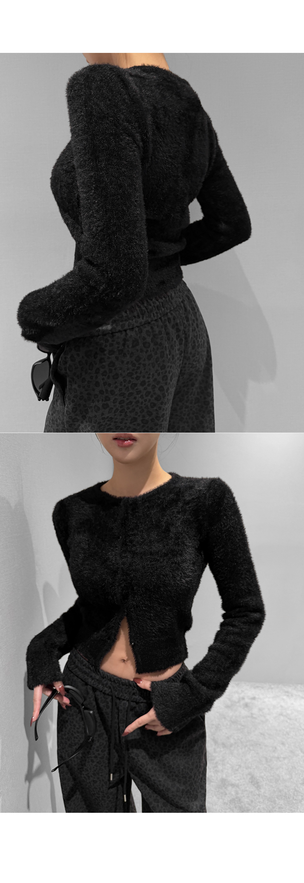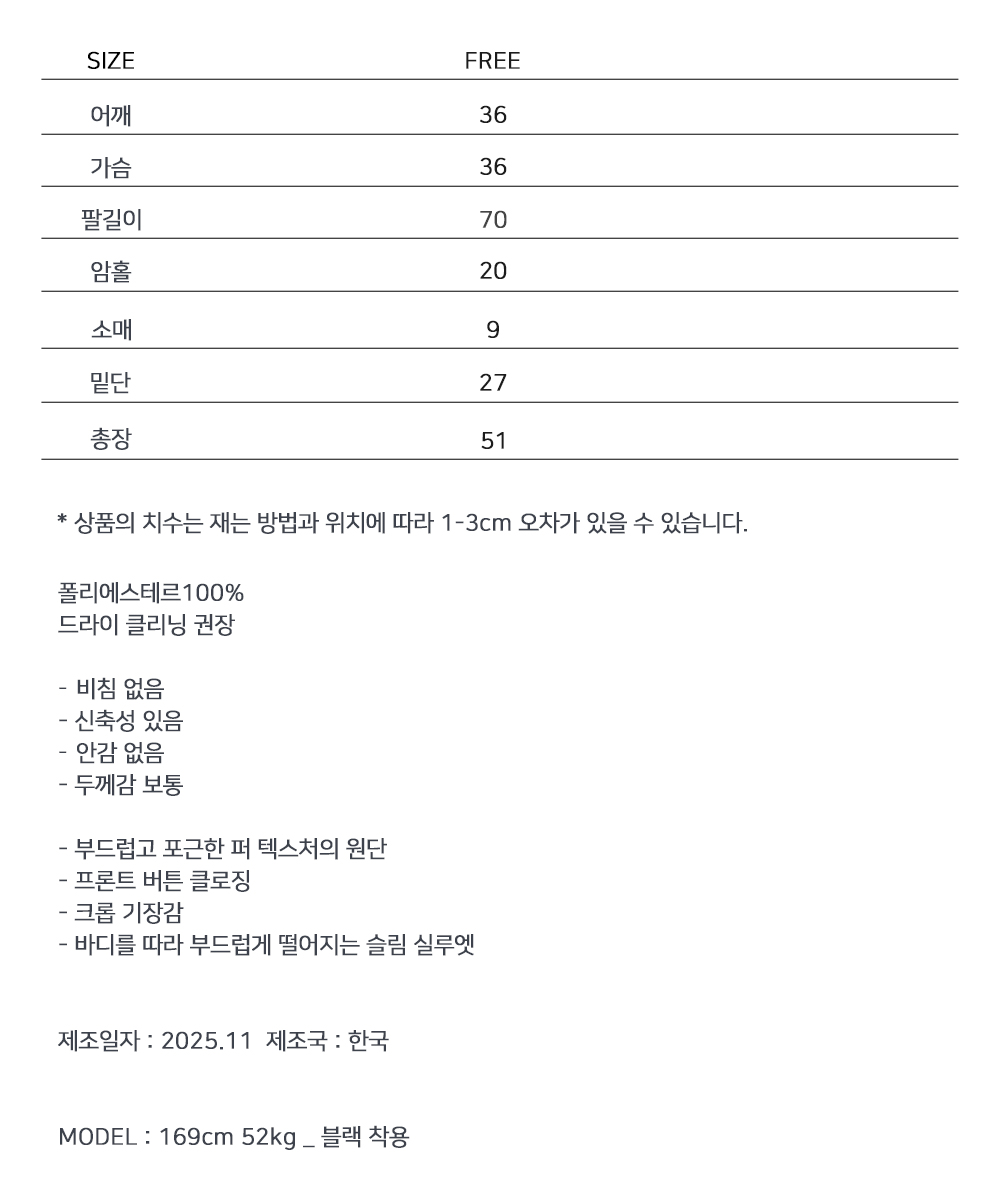 가볍게 닿아도 포근함이 느껴지는 퍼 텍스처가 매력적인 크롭 가디건입니다. 부드러운 터치가 체형을 더욱 여리하게 표현해주며, 단독으로도 존재감 있는 룩을 완성합니다. 크롭한 비율로 하이웨이스트와 매치했을 때 균형감 있는 실루엣을 연출할 수 있습니다.