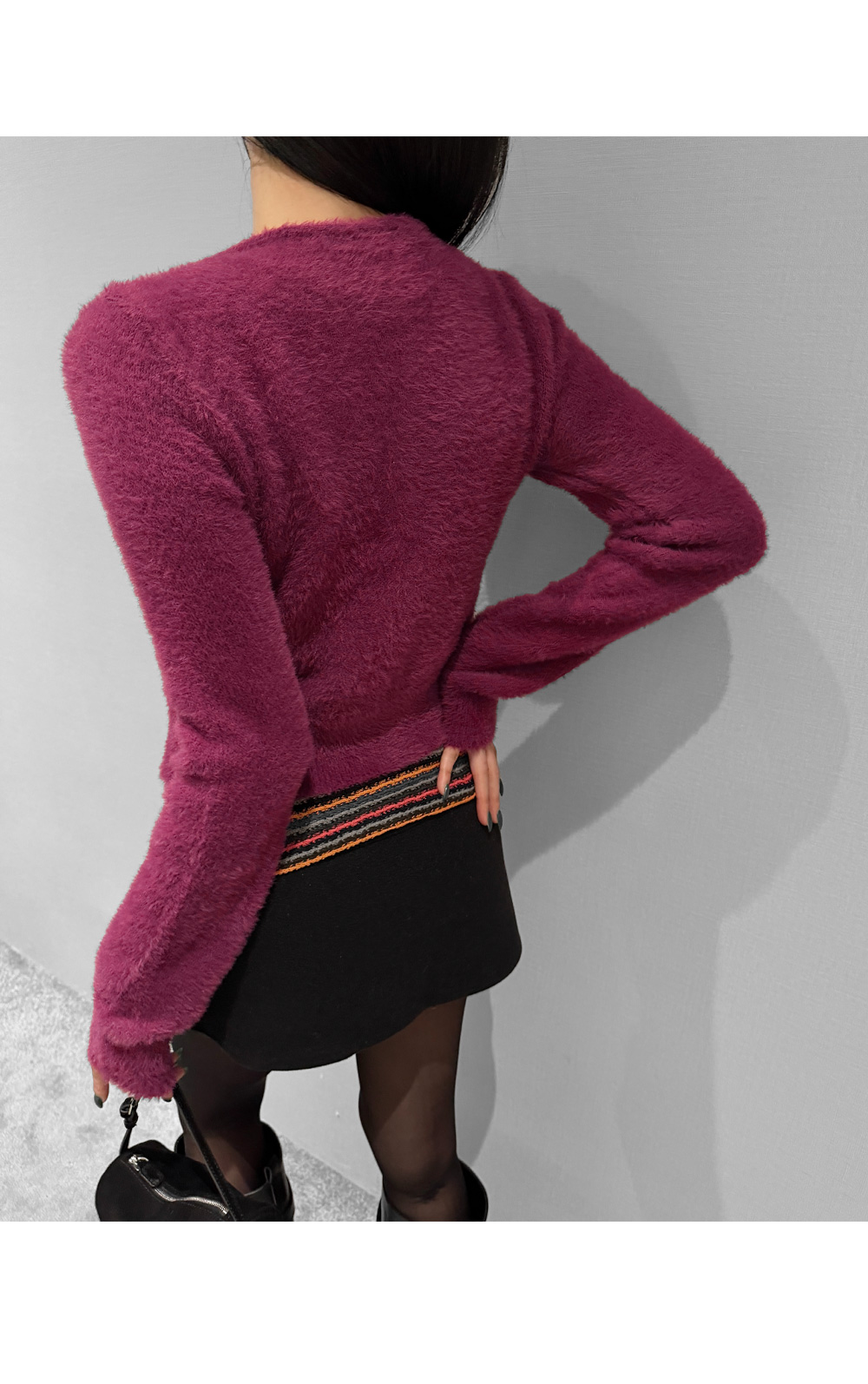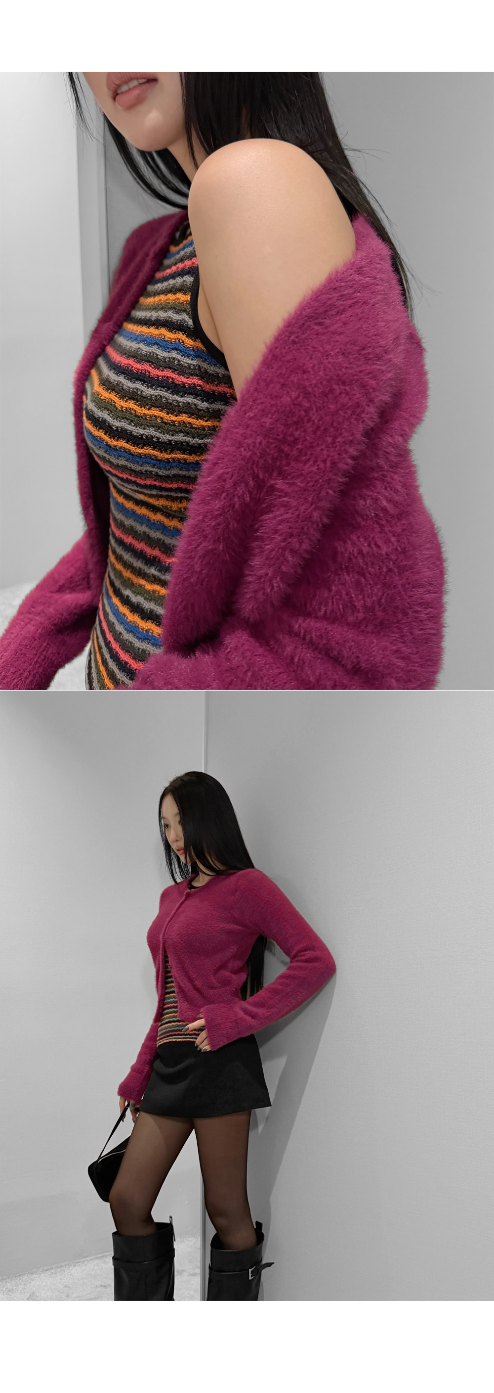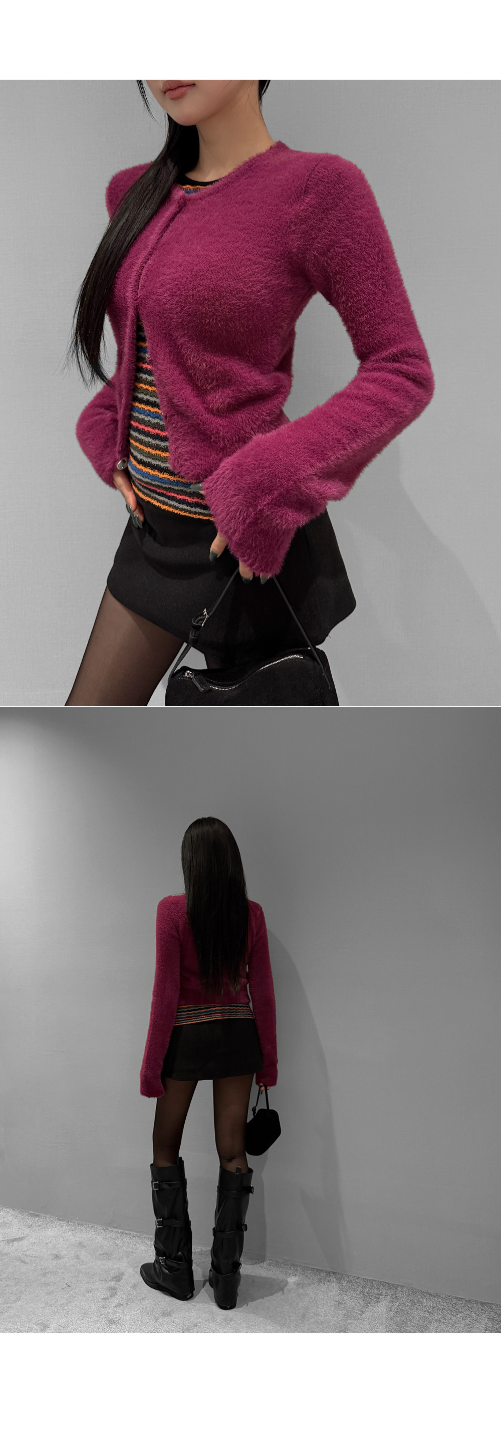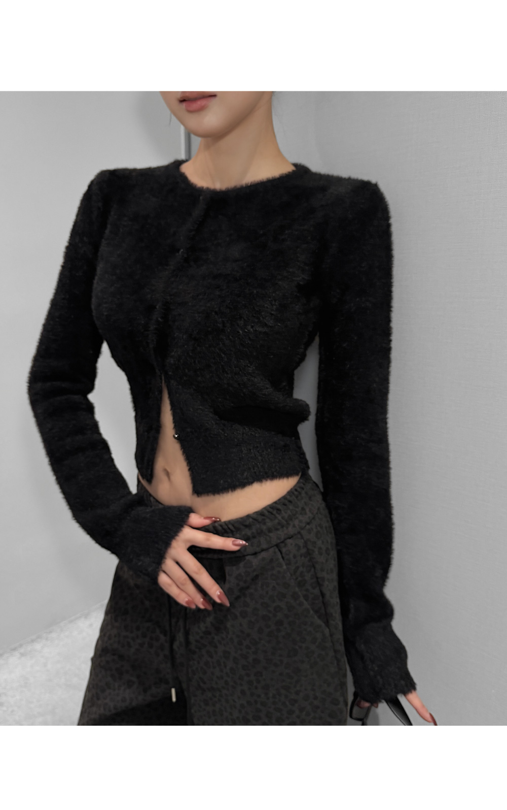 가볍게 닿아도 포근함이 느껴지는 퍼 텍스처가 매력적인 크롭 가디건입니다. 부드러운 터치가 체형을 더욱 여리하게 표현해주며, 단독으로도 존재감 있는 룩을 완성합니다. 크롭한 비율로 하이웨이스트와 매치했을 때 균형감 있는 실루엣을 연출할 수 있습니다.