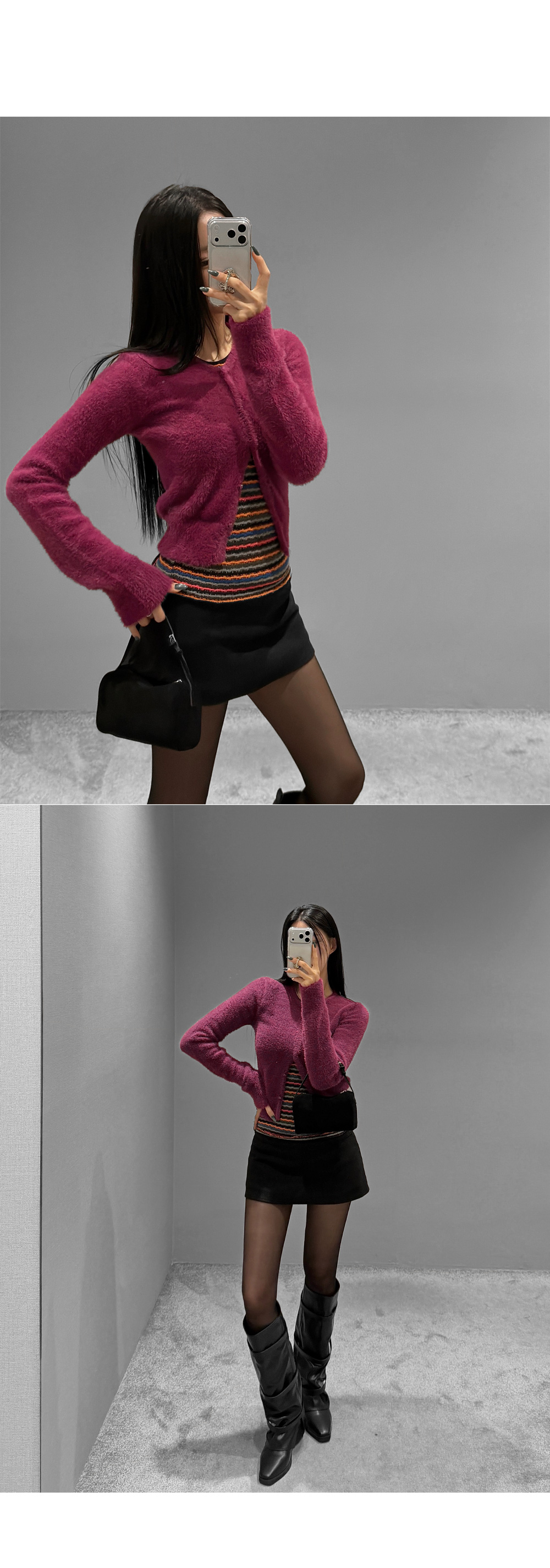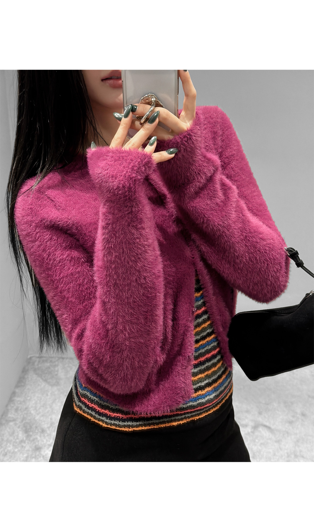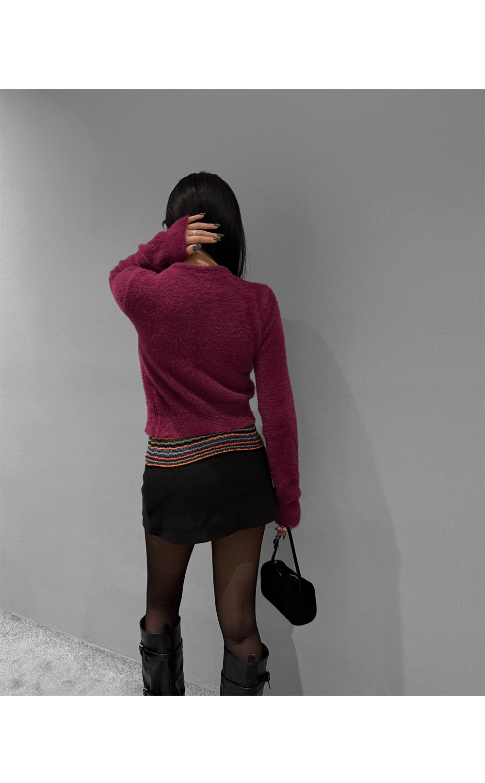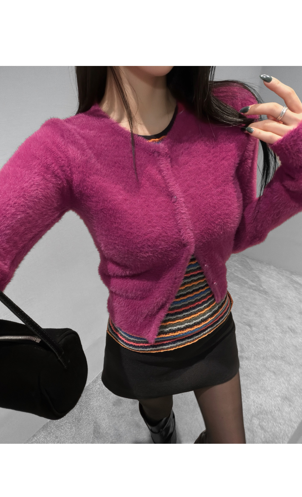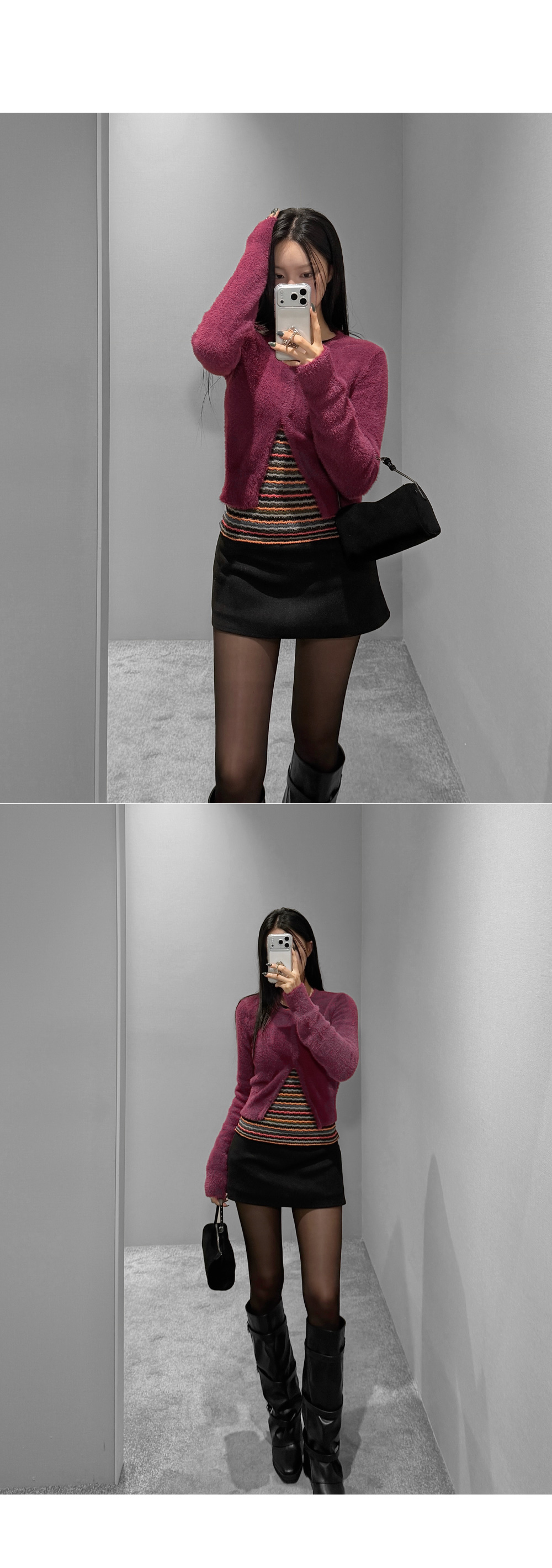 가볍게 닿아도 포근함이 느껴지는 퍼 텍스처가 매력적인 크롭 가디건입니다. 부드러운 터치가 체형을 더욱 여리하게 표현해주며, 단독으로도 존재감 있는 룩을 완성합니다. 크롭한 비율로 하이웨이스트와 매치했을 때 균형감 있는 실루엣을 연출할 수 있습니다.