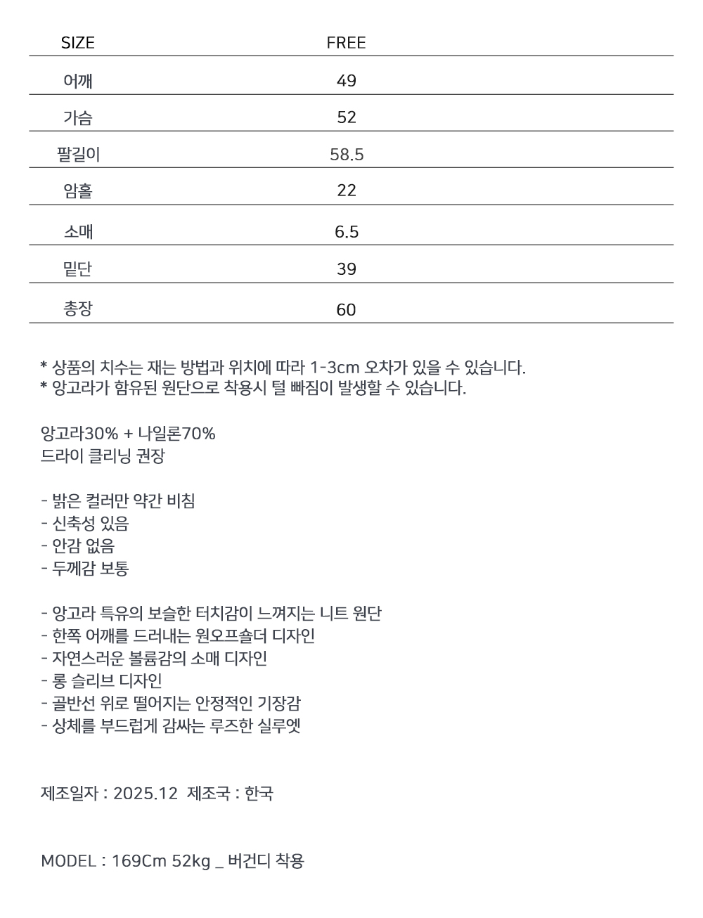 부드러운 앙고라 터치가 느껴지는 원오프숄더 니트입니다. 어깨선을 자연스럽게 드러내는 원오프숄더 디자인으로 포인트를 주거나, 취향에 따라 일반 오프숄더로도 연출 가능해 다양한 무드를 즐길 수 있습니다.