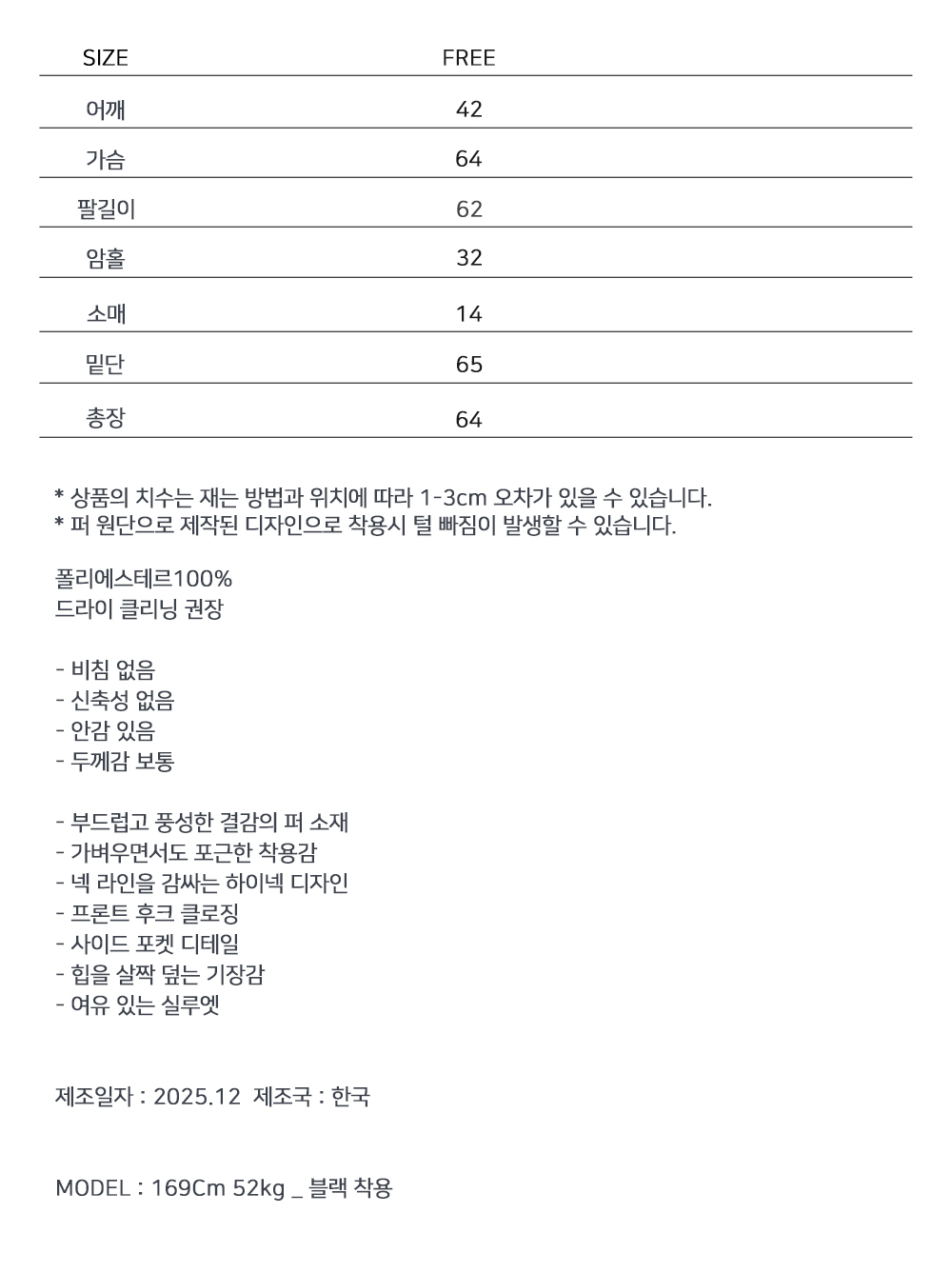 결감이 살아 있는 퍼 텍스처로 스타일에 포인트를 더해주는 자켓입니다. 가볍게 걸쳐도 충분한 존재감을 연출하며, 이너 매치에 따라 캐주얼부터 시크한 무드까지 폭넓게 활용할 수 있는 데일리 아우터입니다.