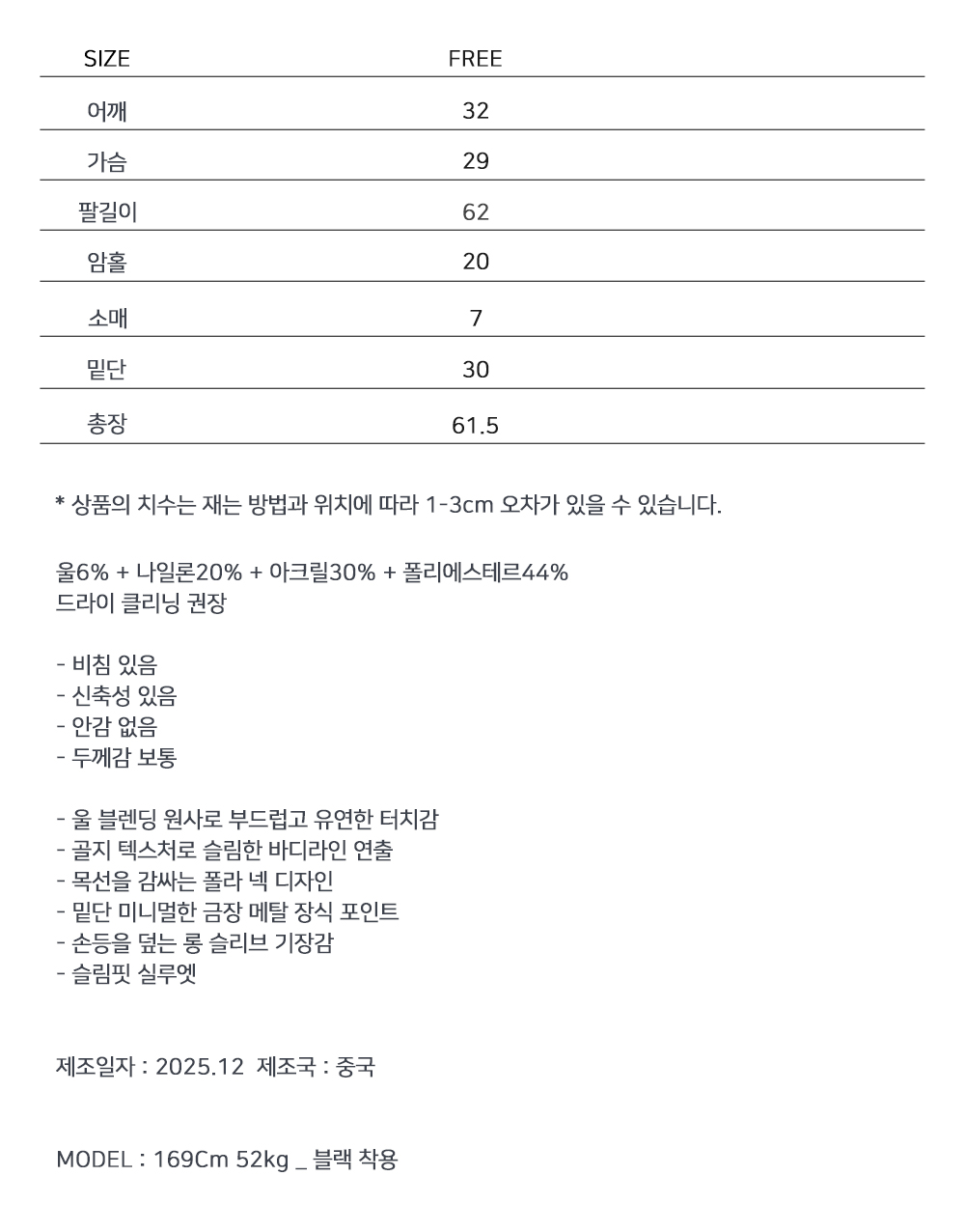 바디 라인을 따라 자연스럽게 밀착되는 실루엣이 돋보이는 폴라 니트입니다. 잔잔한 골 조직과 부드러운 터치감으로 단독 착용은 물론 레이어드 시에도 부담 없이 어우러지며, 미니멀한 스타일링에 안정적인 중심이 되어주는 베이직 아이템입니다.