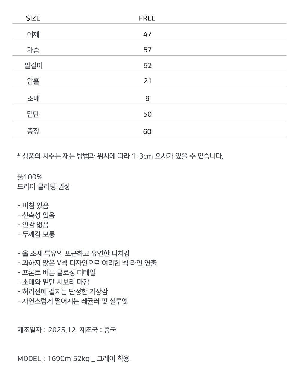 부드럽게 감기는 울 텍스처가 돋보이는 가디건입니다. 깊지 않은 V넥 라인과 단정한 실루엣으로 단독은 물론 이너 위에 가볍게 레이어드하기 좋으며, 데일리부터 포멀한 스타일링까지 자연스럽게 어우러집니다.