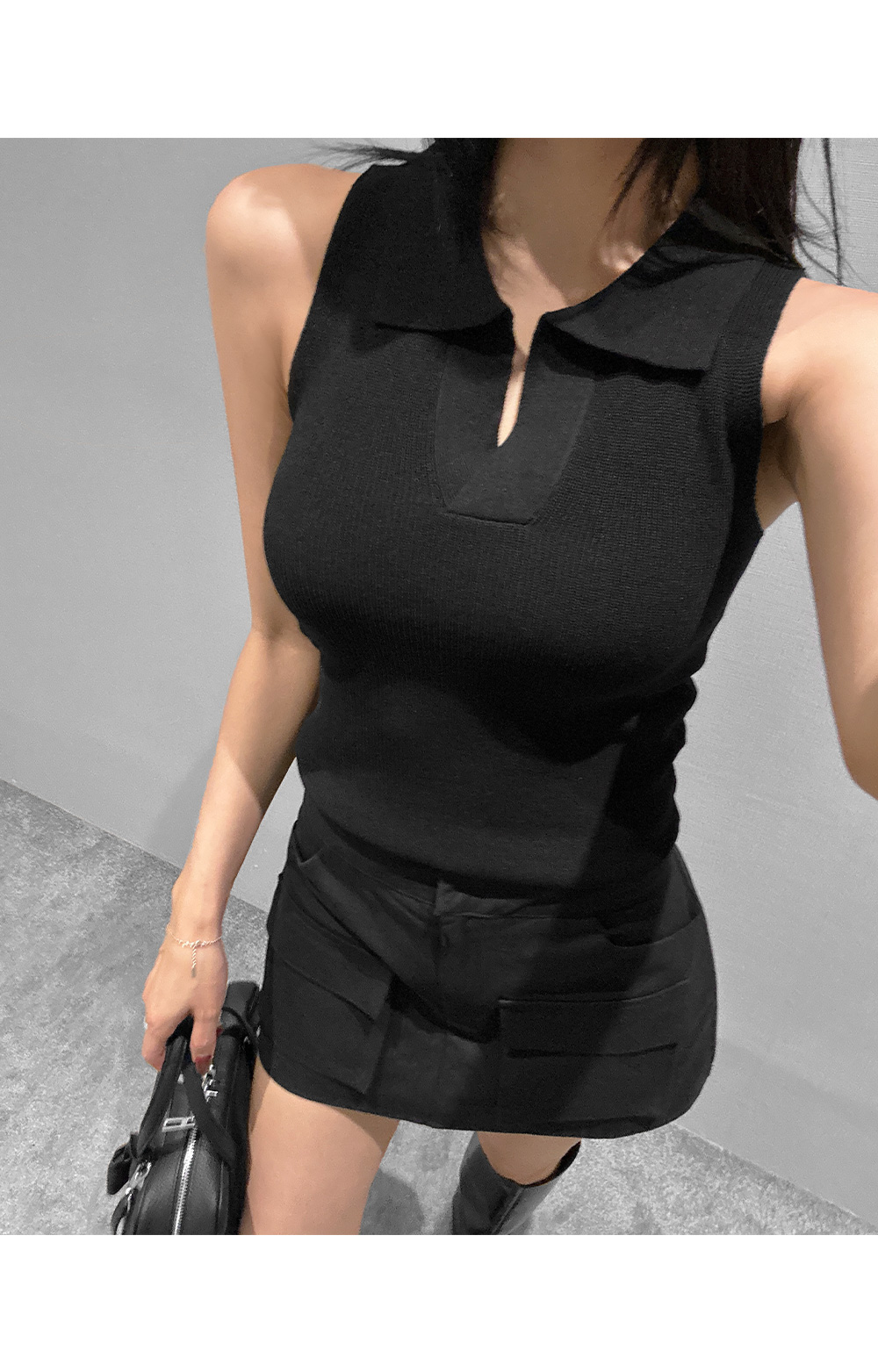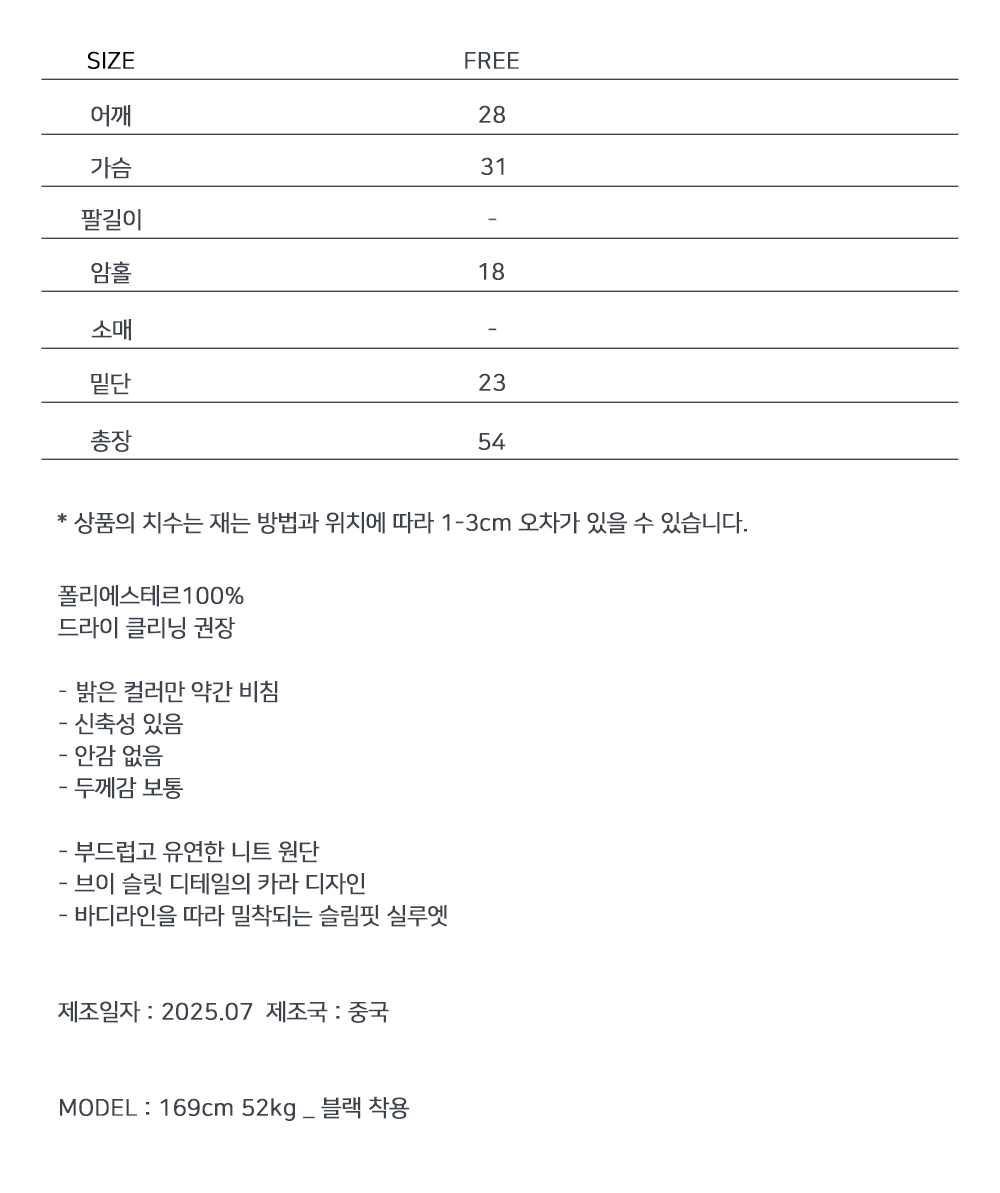 카라 디테일로 단정한 무드를 더한 슬리브리스 니트입니다. 바디에 가볍게 밀착되는 슬림핏 실루엣으로, 단독은 물론 자켓이나 셔츠 이너로도 활용도 높게 착용됩니다.