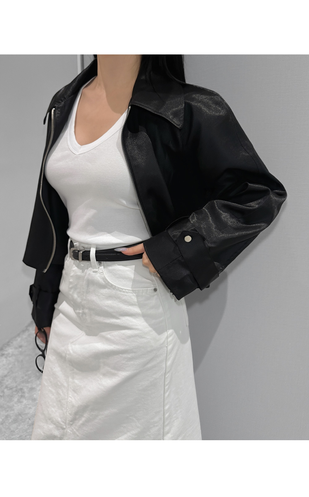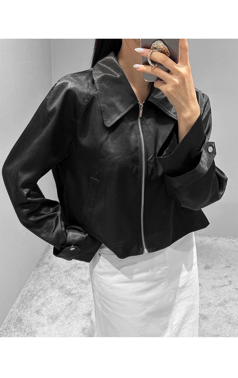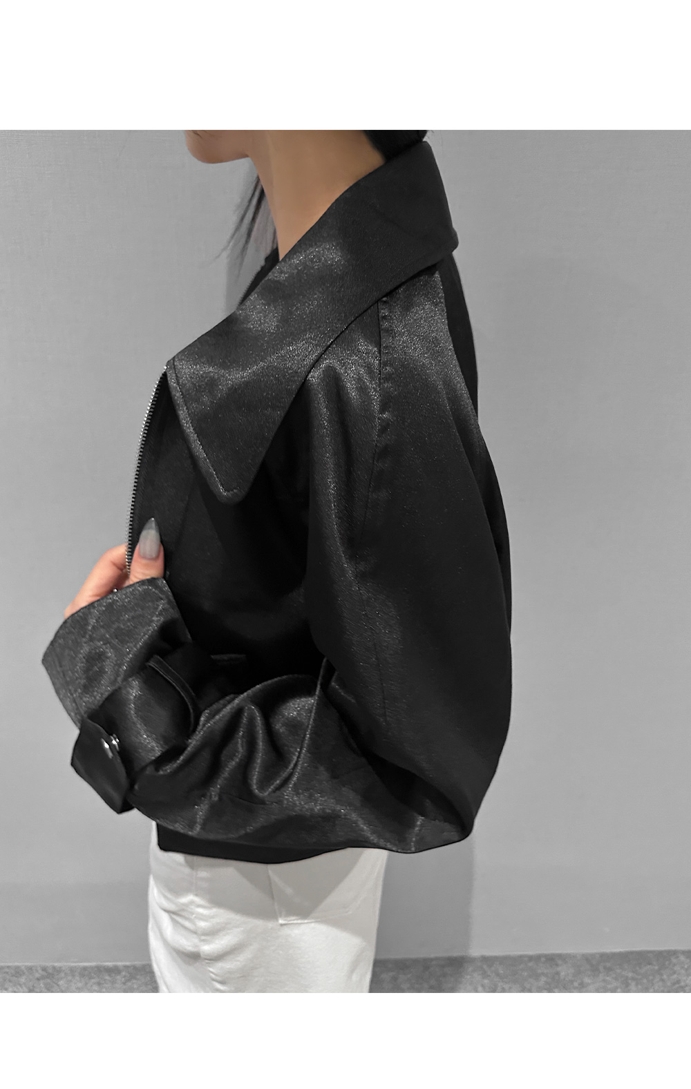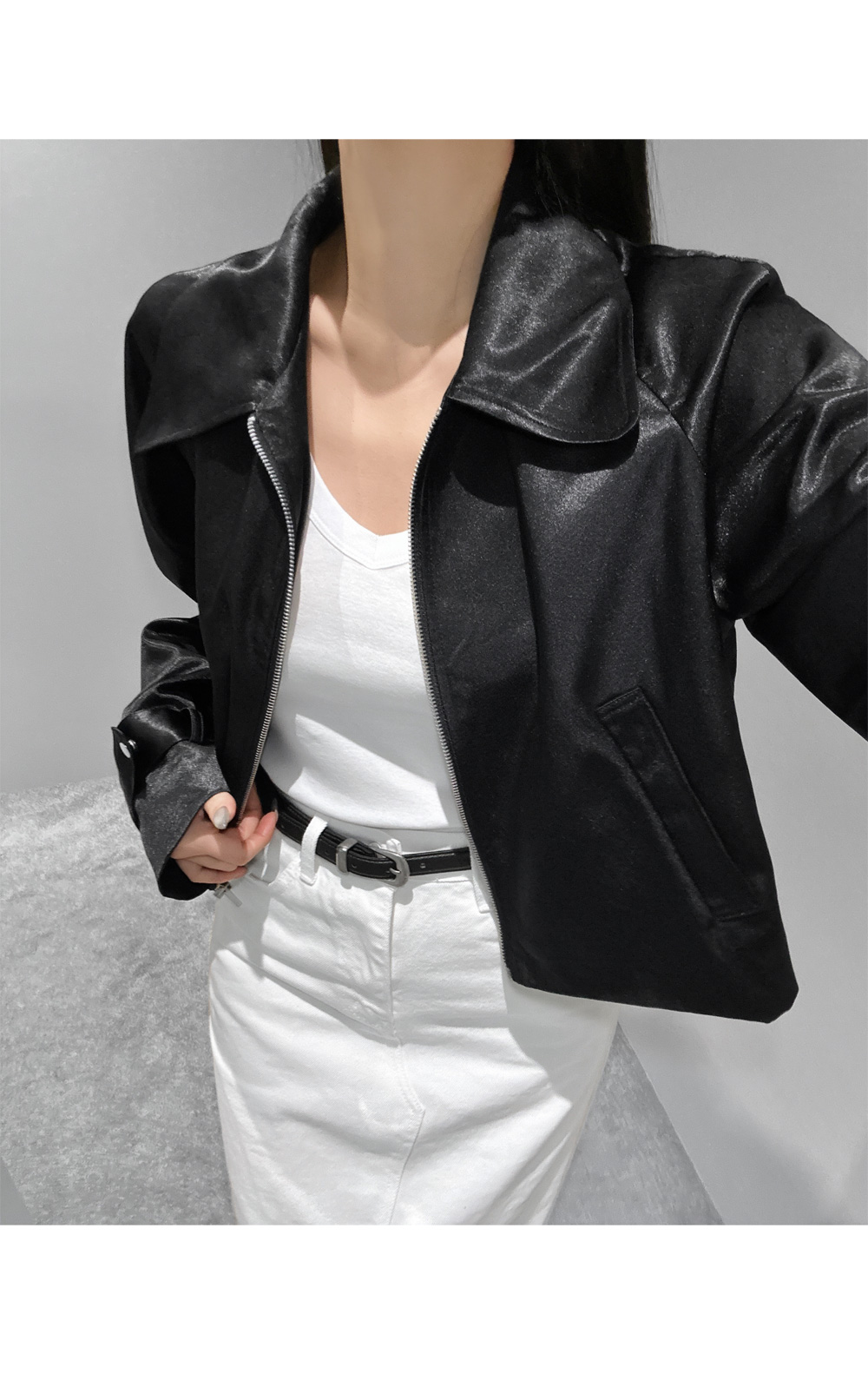 은은한 광택이 감도는 새틴 소재로 완성된 크롭 자켓입니다. 간결한 집업 클로징과 구조적인 카라 라인이 세련된 무드를 주며, 미니멀한 기장으로 다양한 하의와 조화롭게 매치할 수 있어 스타일링 활용도가 높은 아이템입니다.