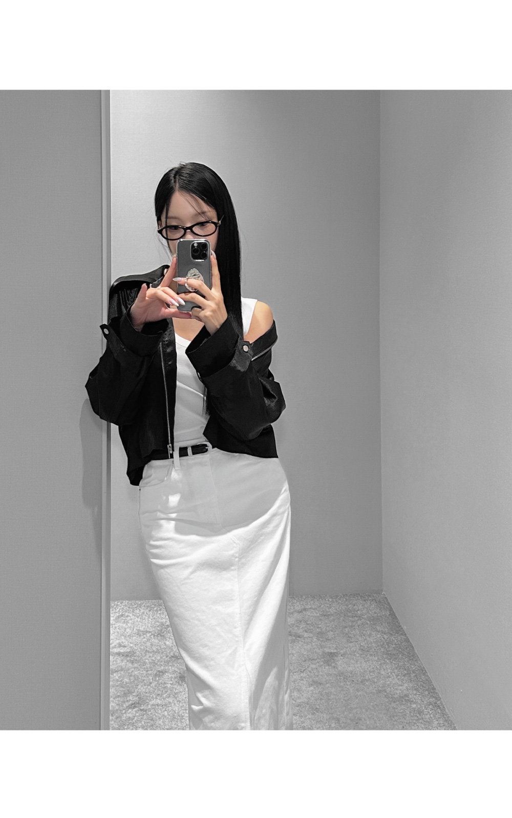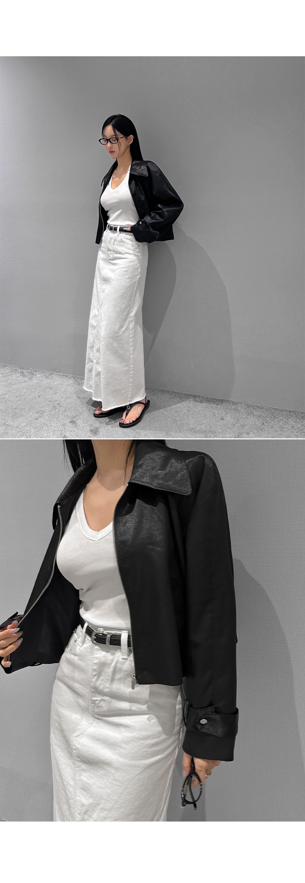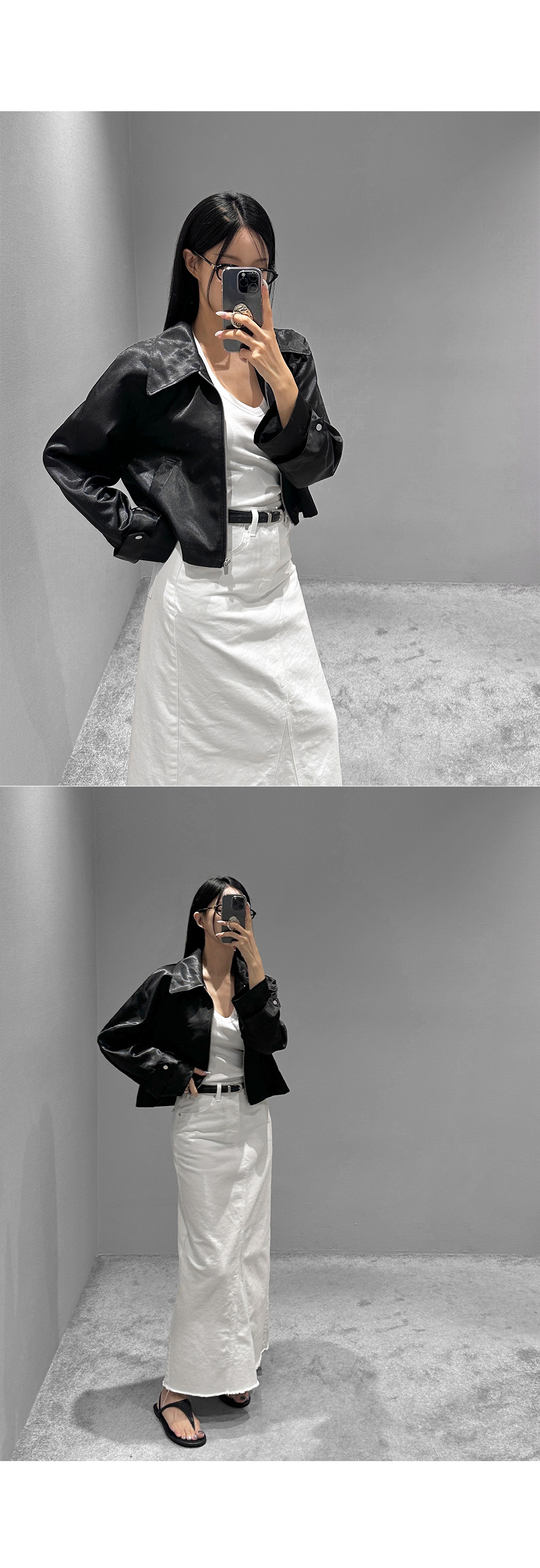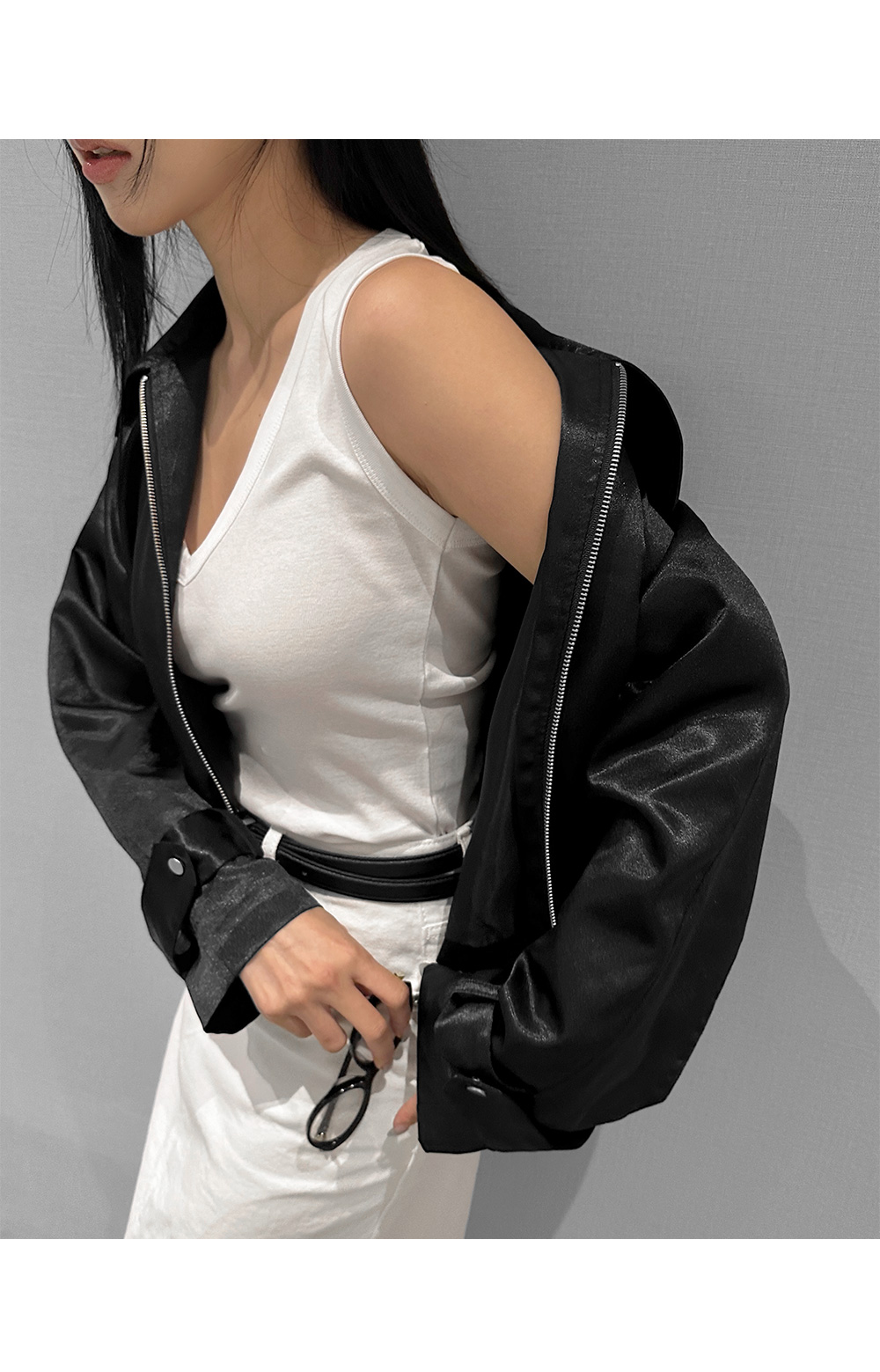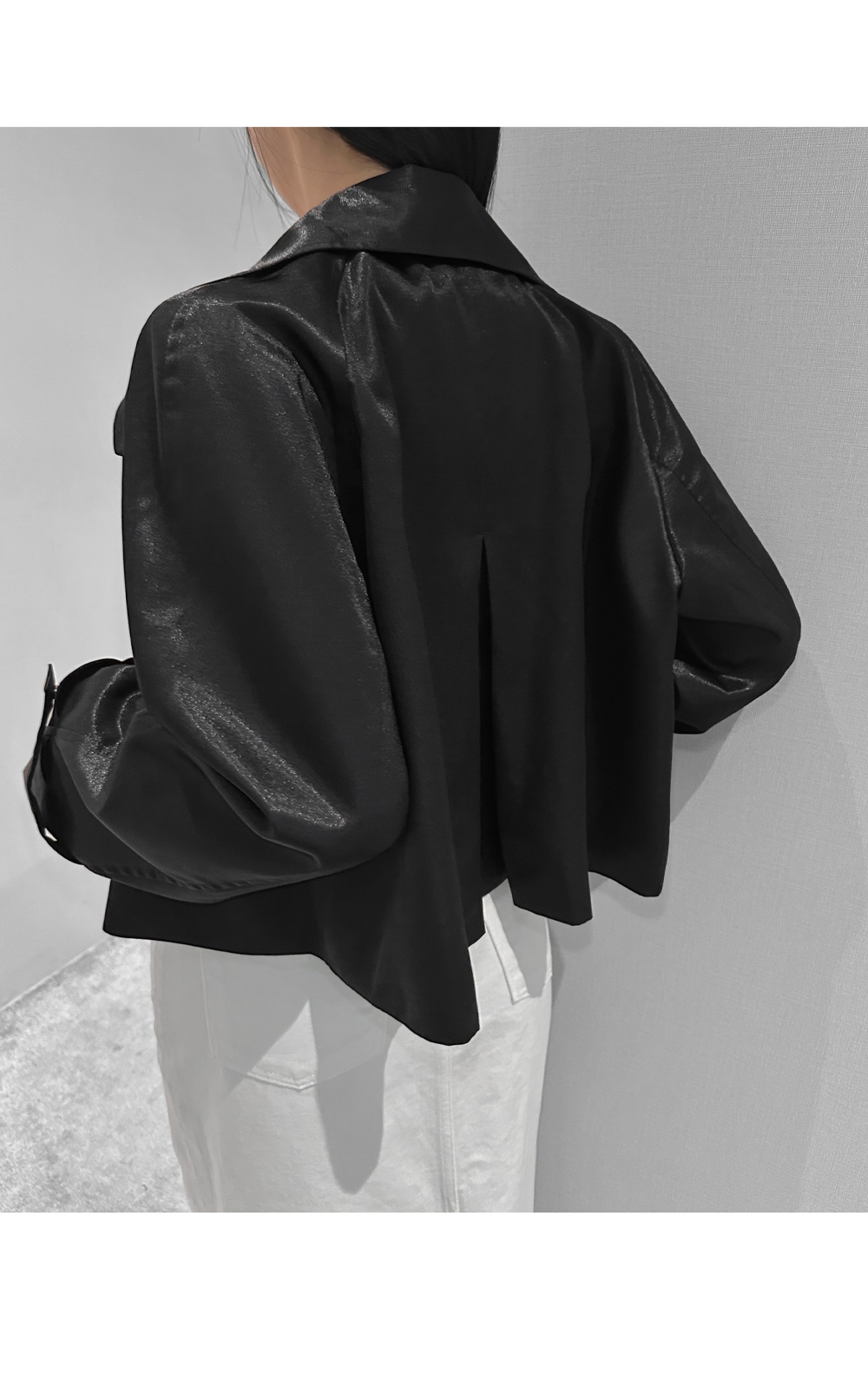 은은한 광택이 감도는 새틴 소재로 완성된 크롭 자켓입니다. 간결한 집업 클로징과 구조적인 카라 라인이 세련된 무드를 주며, 미니멀한 기장으로 다양한 하의와 조화롭게 매치할 수 있어 스타일링 활용도가 높은 아이템입니다.