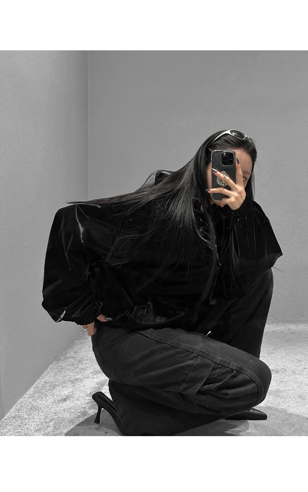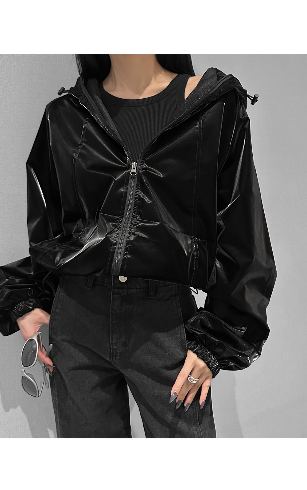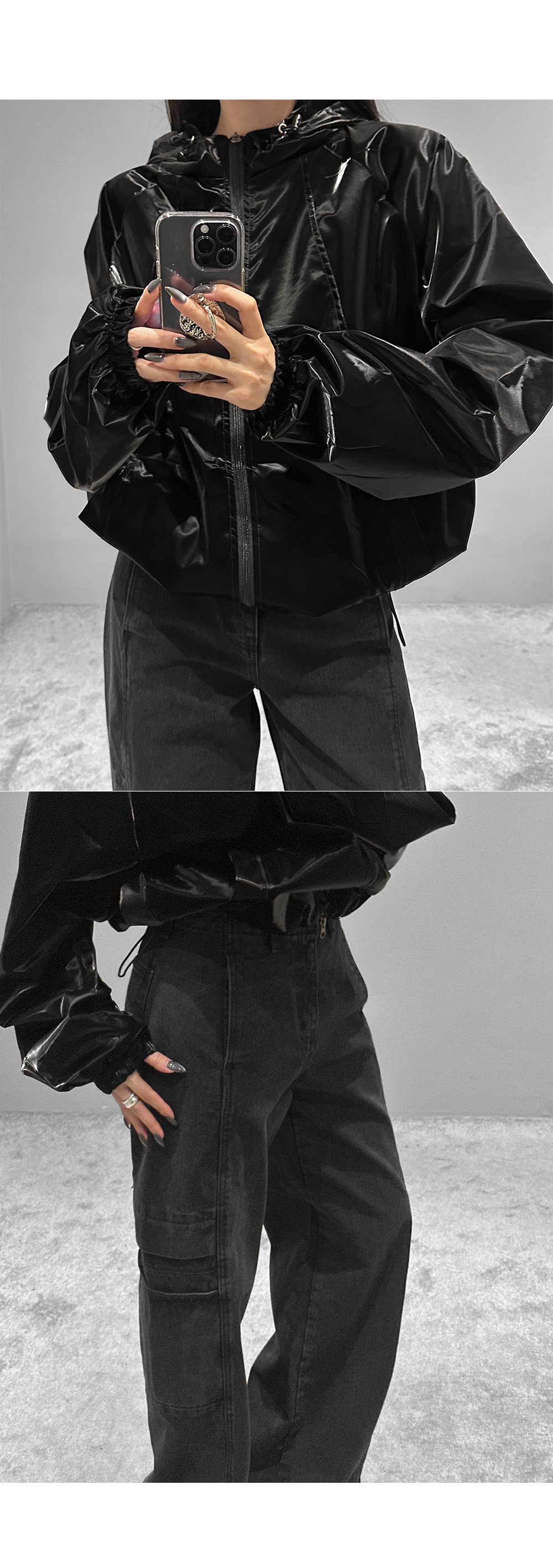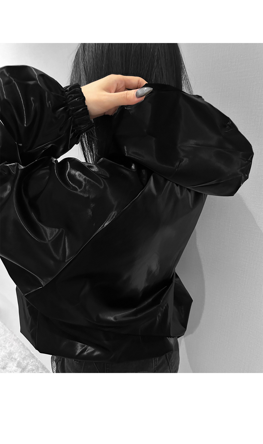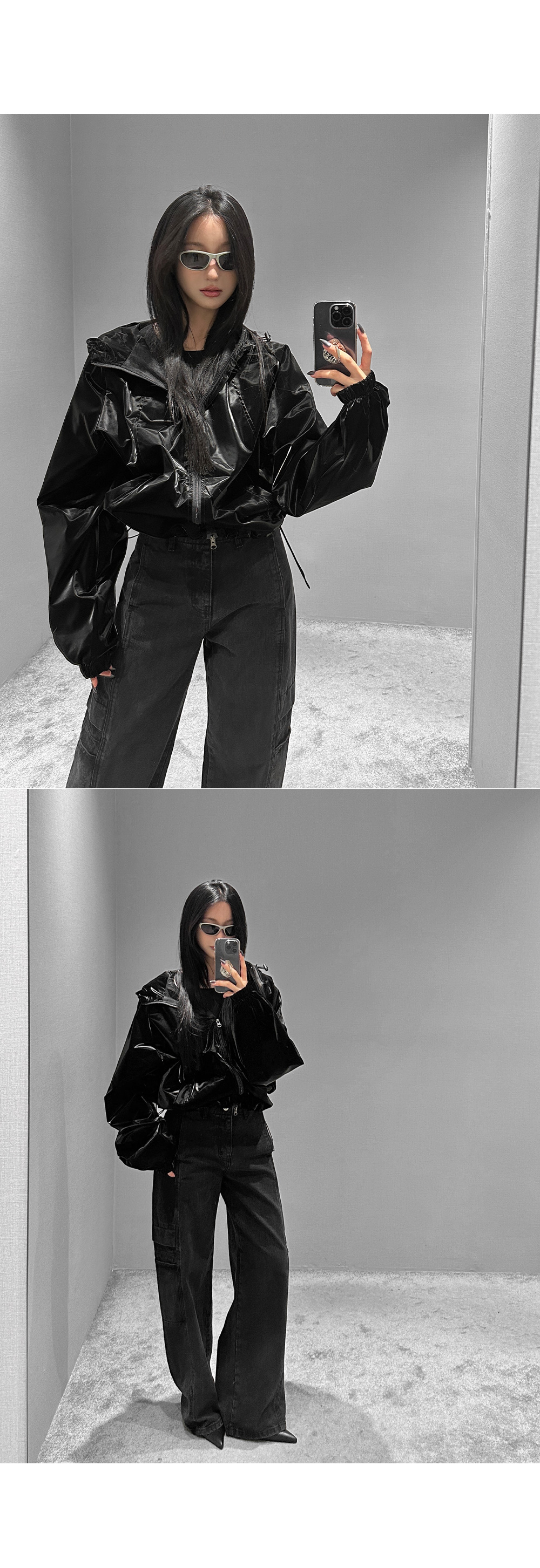 글로시 오버핏 크롭 점퍼