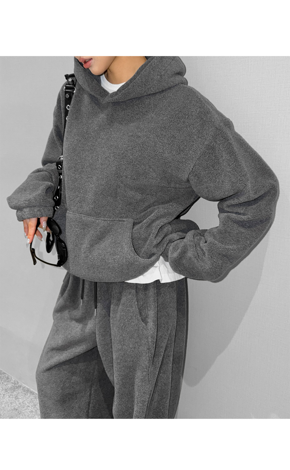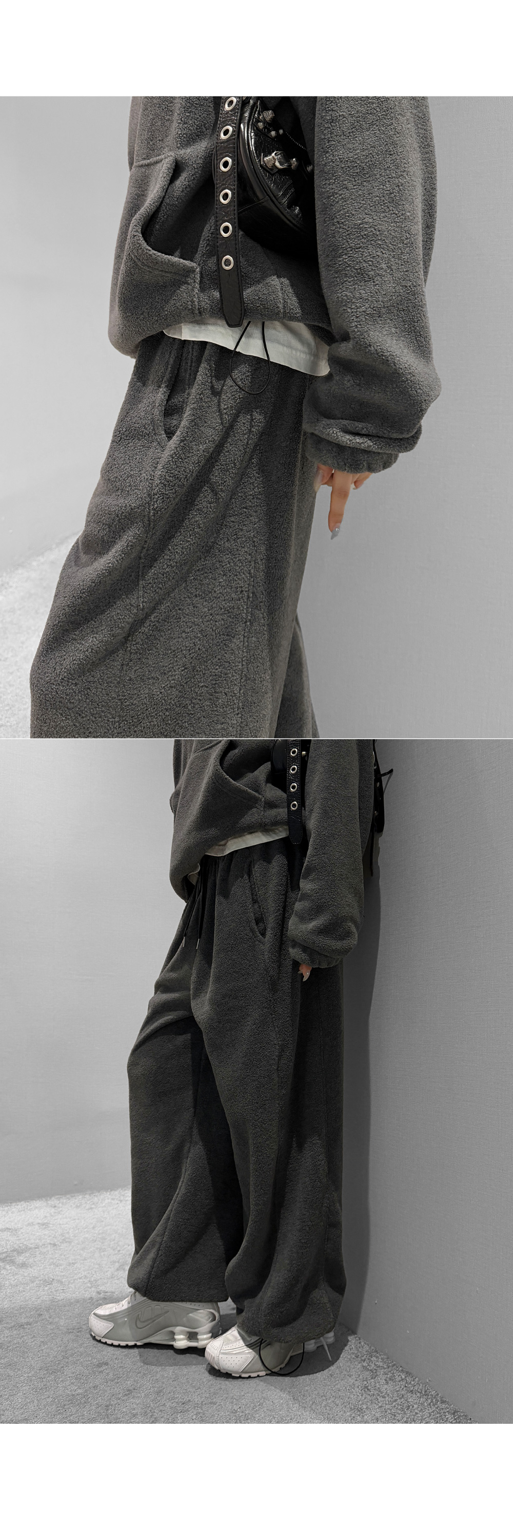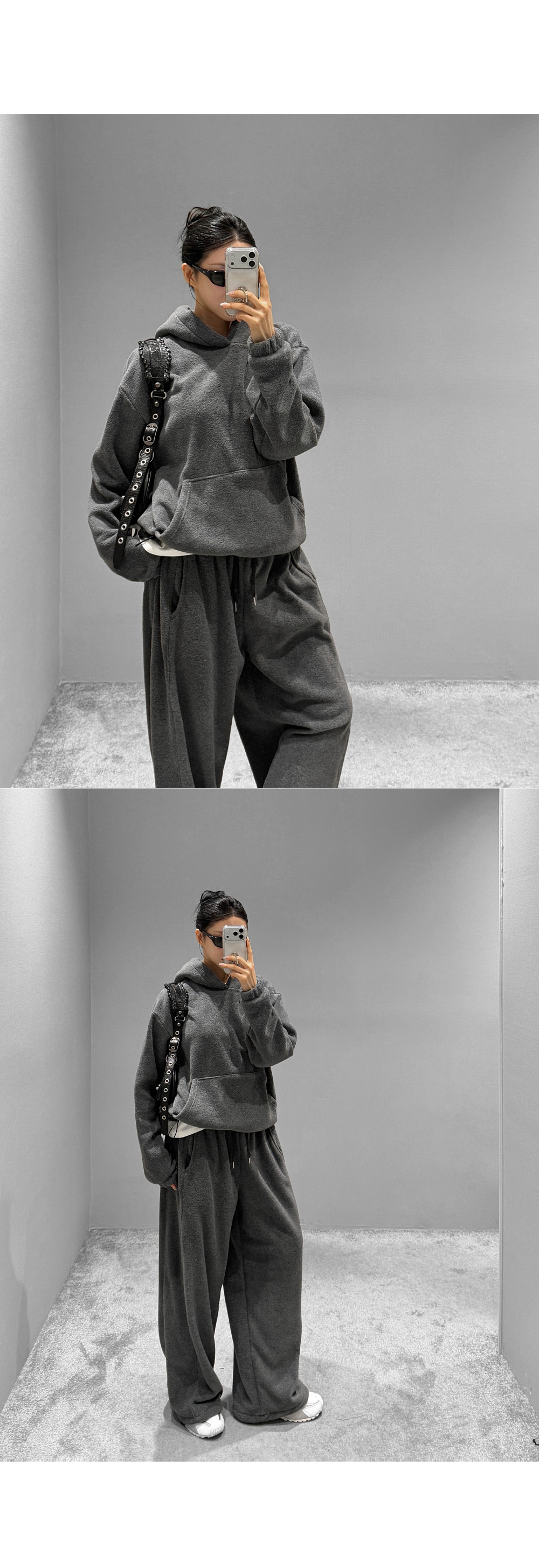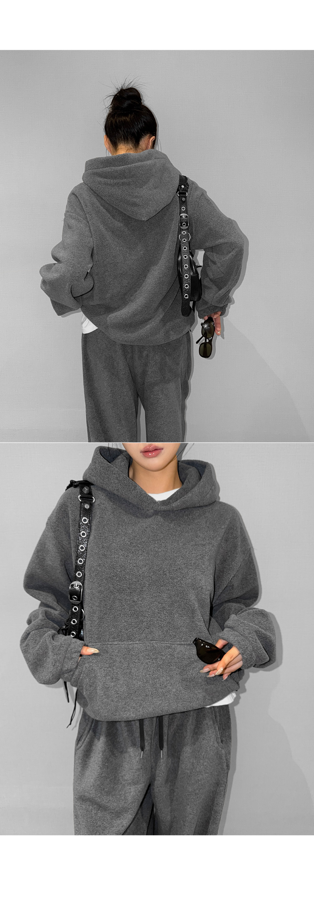 포근한 후리스 텍스처로 완성한 후드 팬츠 셋업입니다. 상·하의 모두 여유 있는 실루엣으로 편안한 착용감을 제공하며, 단독과 셋업 모두 활용하기 좋아 데일리 웨어로 손이 자주 가는 에센셜 아이템입니다.