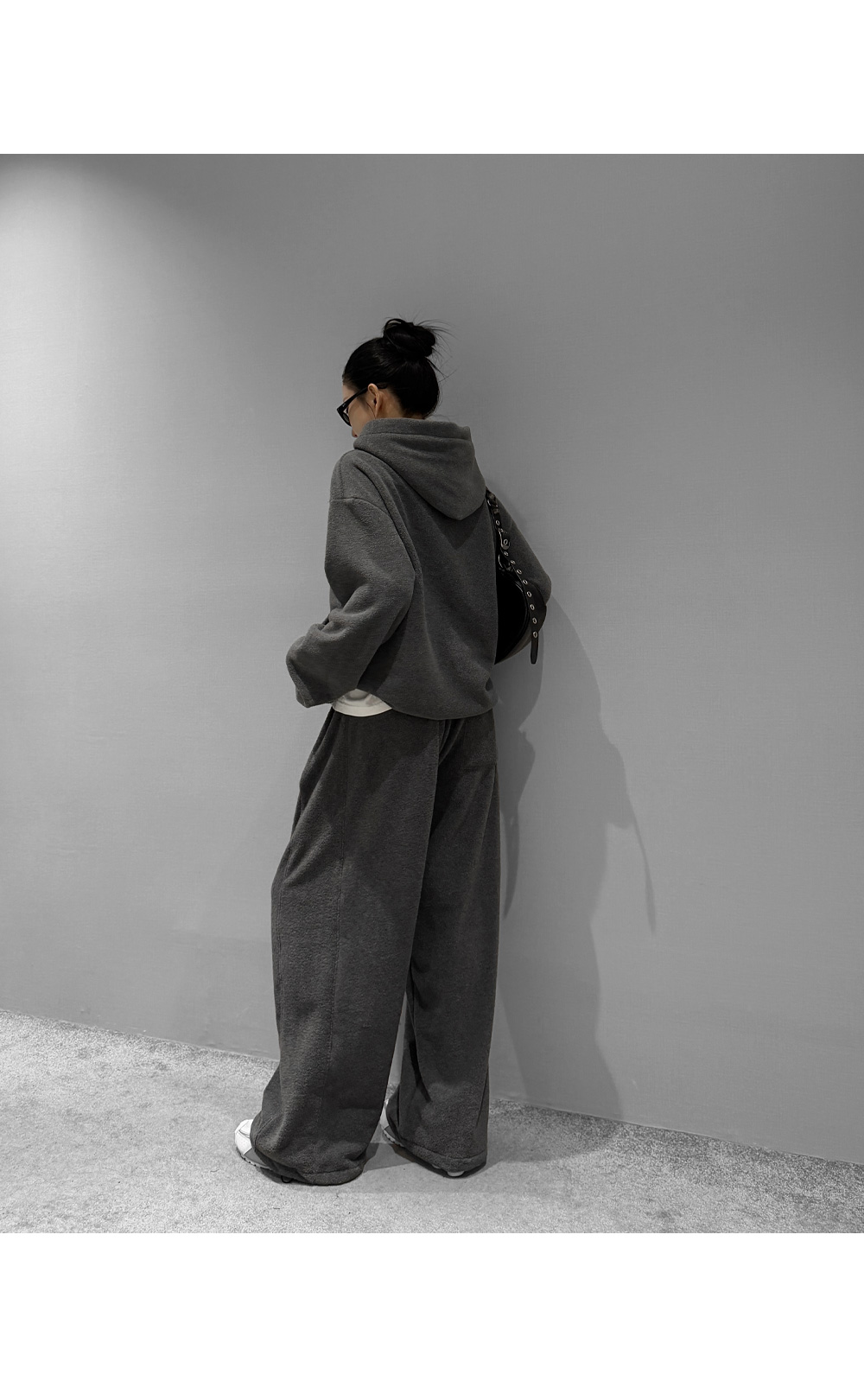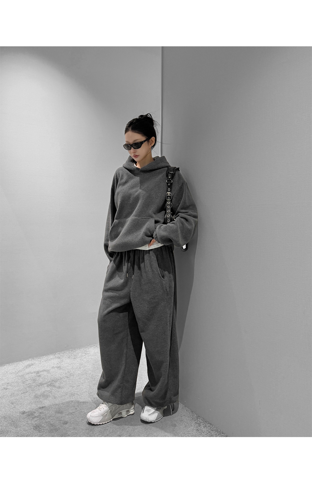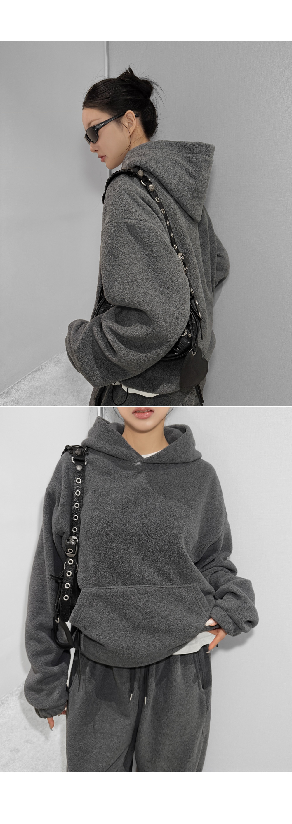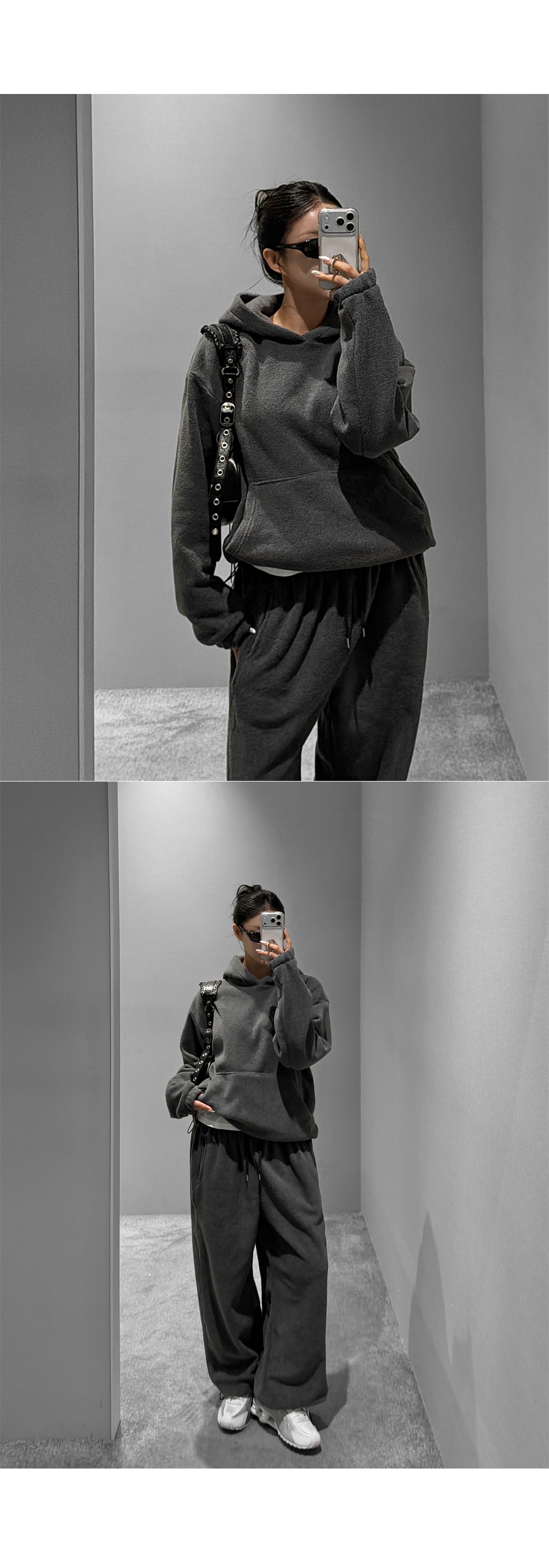 포근한 후리스 텍스처로 완성한 후드 팬츠 셋업입니다. 상·하의 모두 여유 있는 실루엣으로 편안한 착용감을 제공하며, 단독과 셋업 모두 활용하기 좋아 데일리 웨어로 손이 자주 가는 에센셜 아이템입니다.