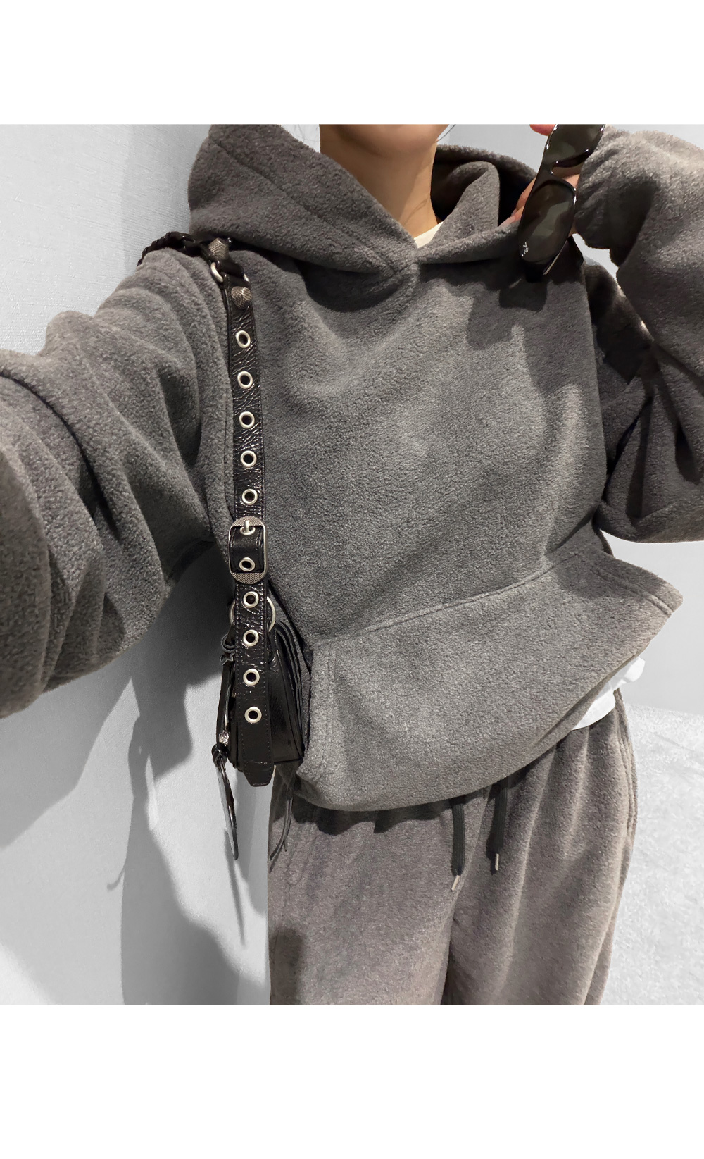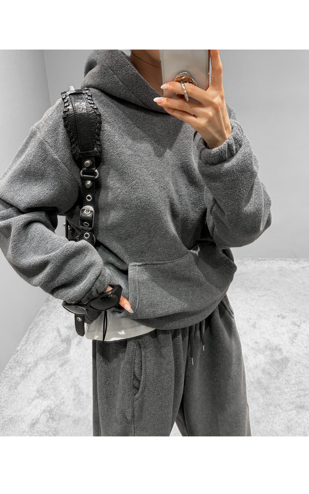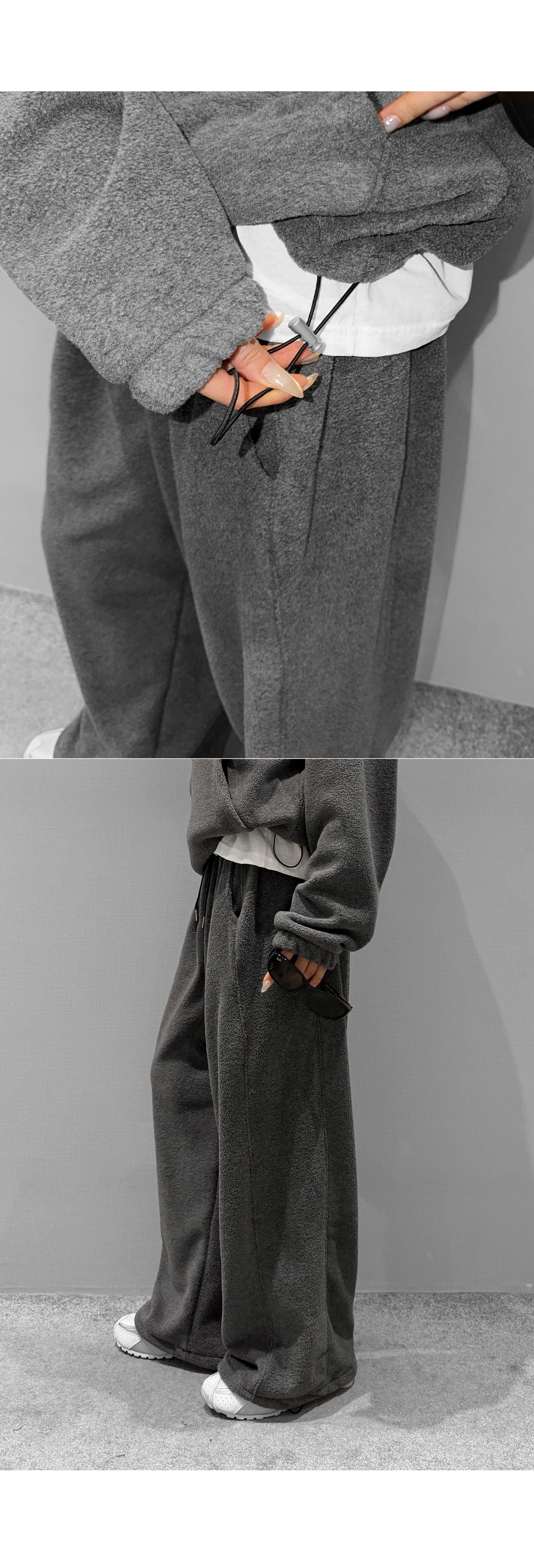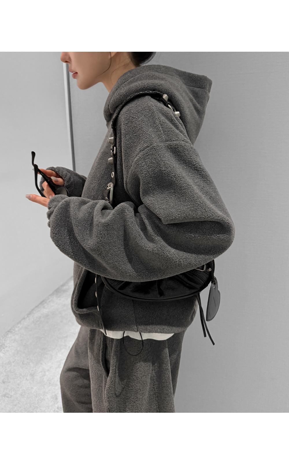 포근한 후리스 텍스처로 완성한 후드 팬츠 셋업입니다. 상·하의 모두 여유 있는 실루엣으로 편안한 착용감을 제공하며, 단독과 셋업 모두 활용하기 좋아 데일리 웨어로 손이 자주 가는 에센셜 아이템입니다.
