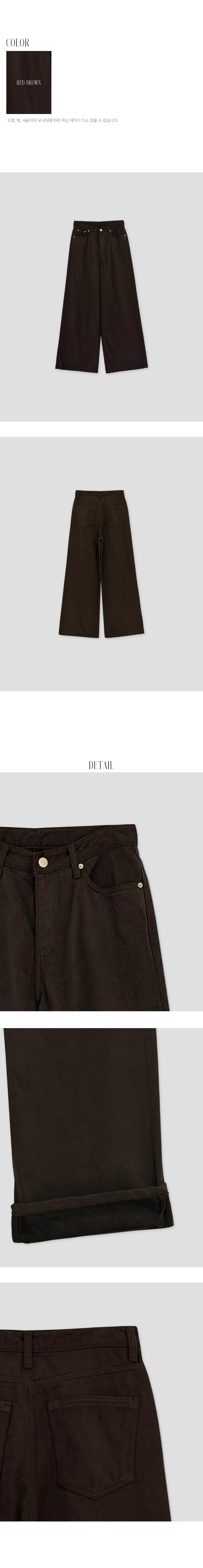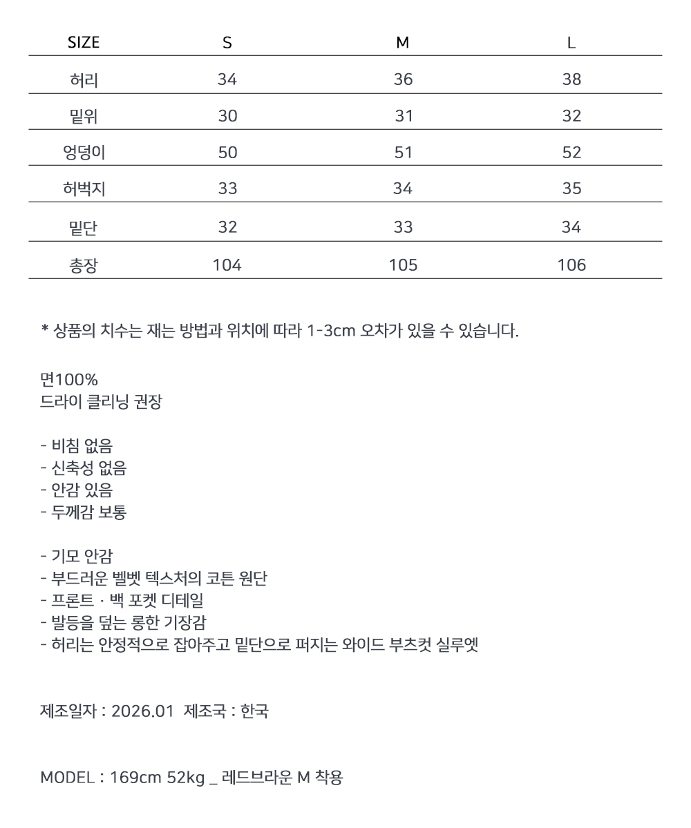 짙은 레드브라운 컬러가 돋보이는 벨벳 와이드 부츠컷 팬츠입니다. 기모 안감이 더해진 코튼 소재로 포근한 착용감을 전하며, 허리부터 힙은 안정적으로 잡아주고 밑단으로 자연스럽게 퍼지는 실루엣으로 겨울 시즌에도 세련된 스타일링을 완성해줍니다.