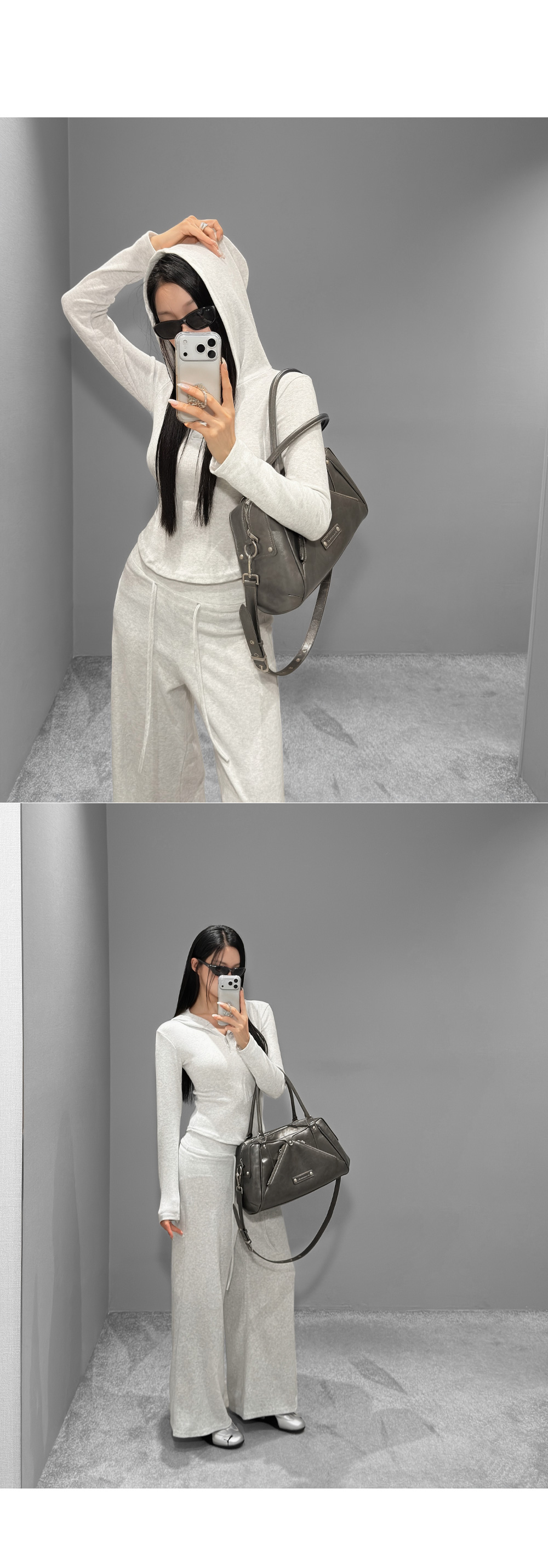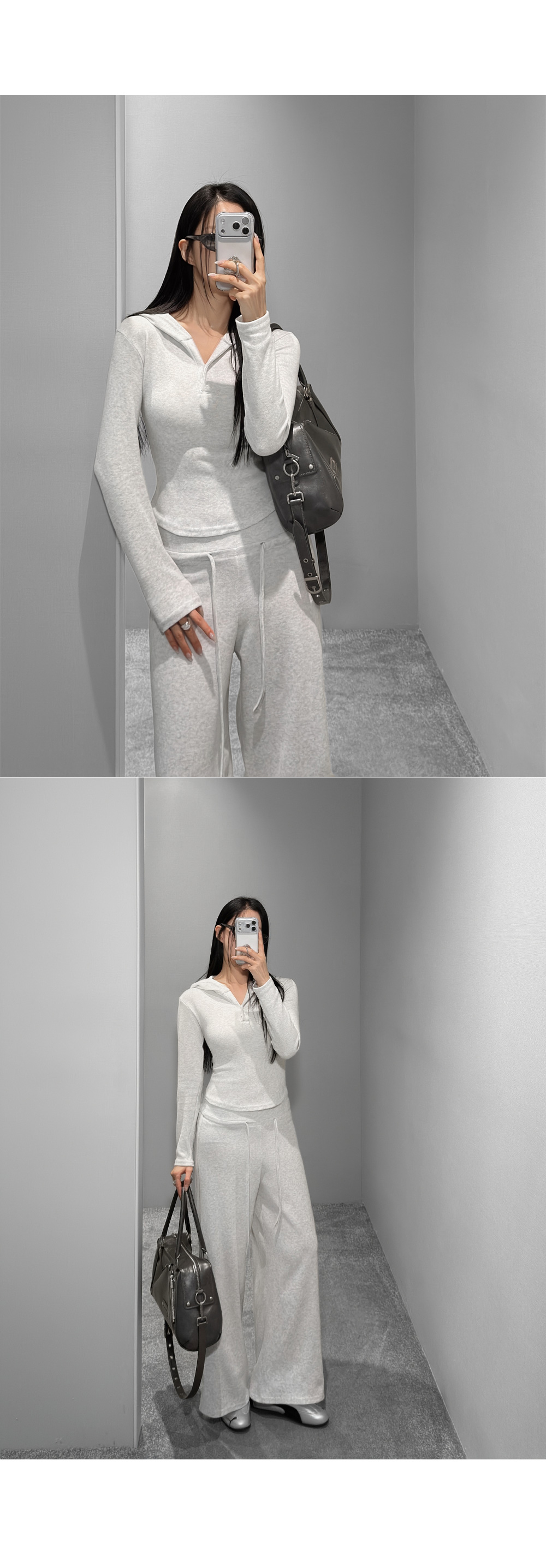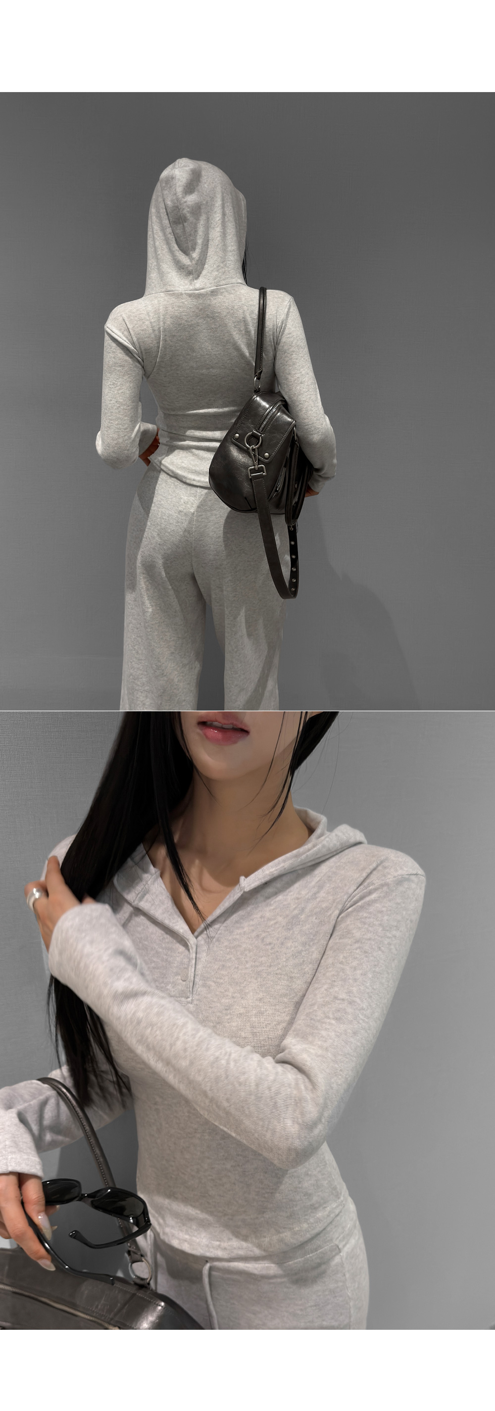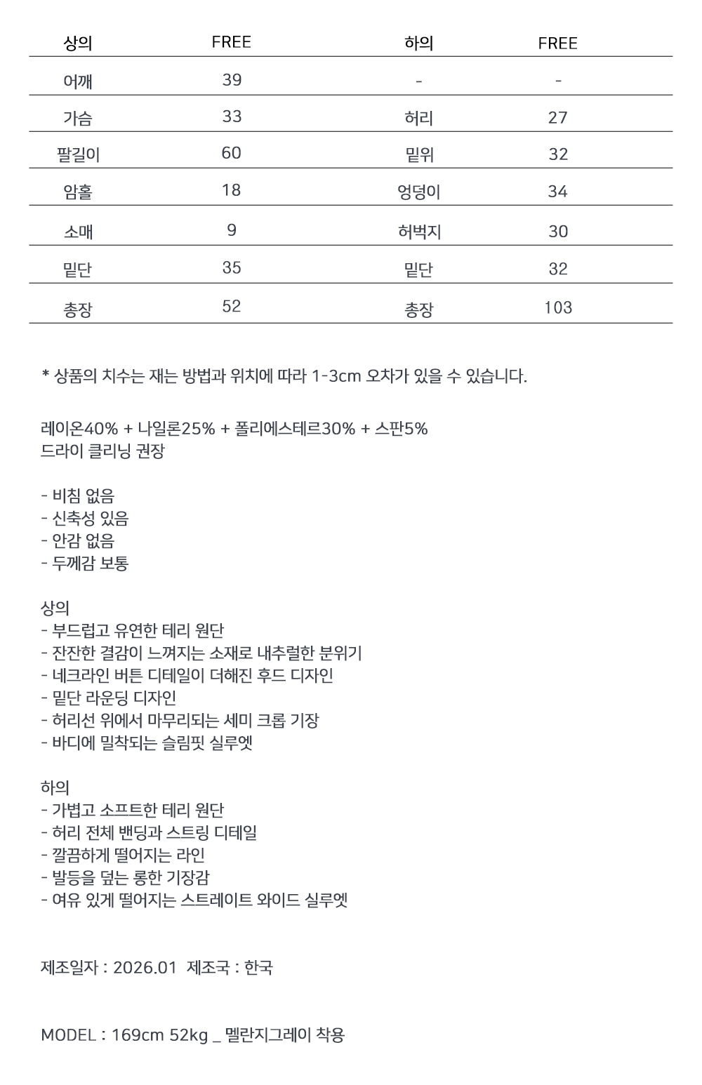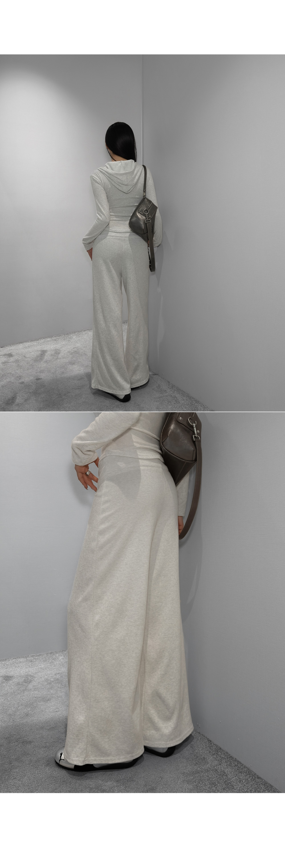 부드러운 테리 텍스처에 슬림한 실루엣을 더한 셋업 아이템입니다. 상체 라인을 정돈해주는 후드 탑과 자연스럽게 떨어지는 팬츠 조합으로 편안하면서도 깔끔한 무드를 완성하며, 단독과 셋업 모두 활용도가 높습니다.