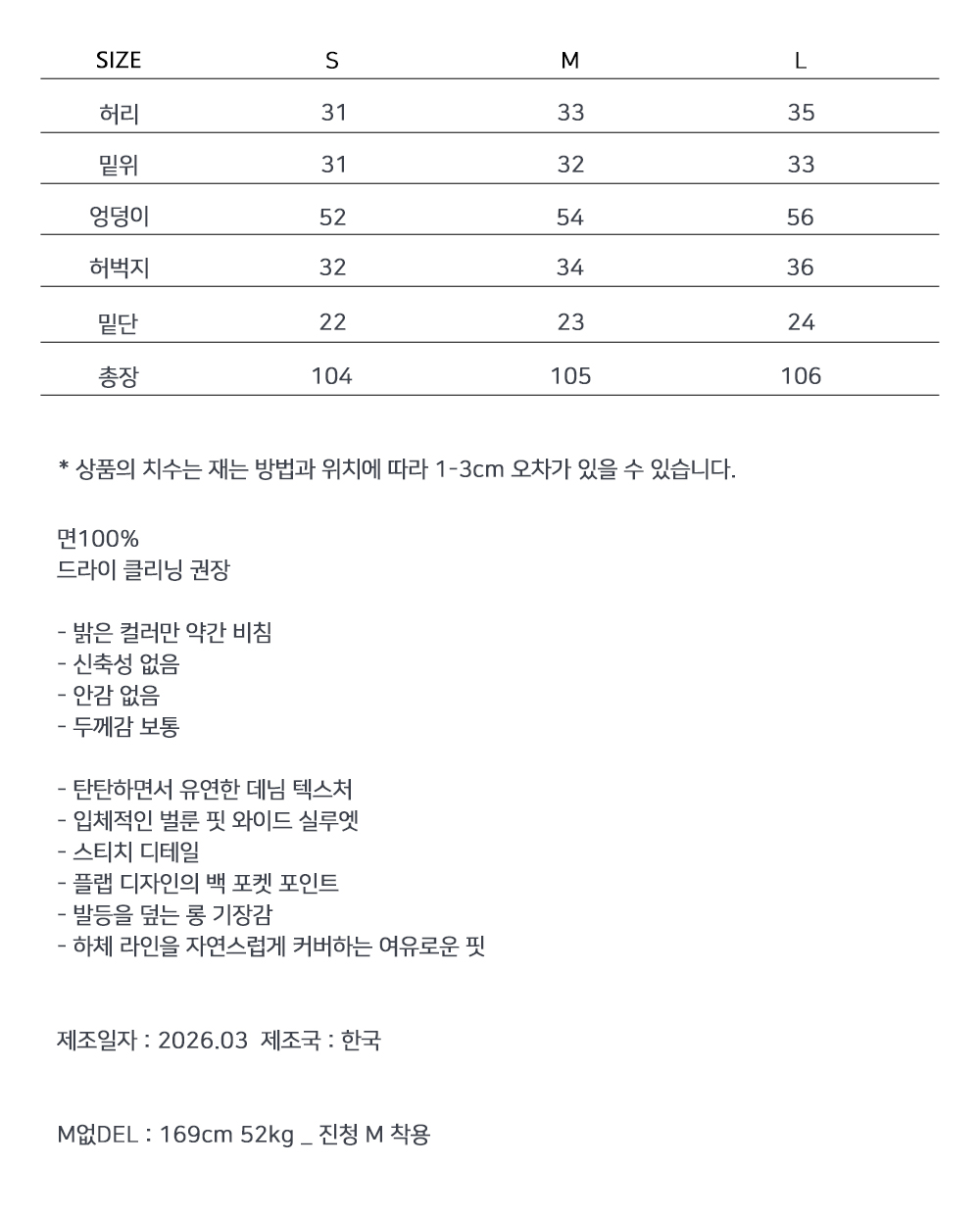 볼륨감 있게 떨어지는 벌룬 실루엣이 돋보이는 와이드 팬츠입니다. 여유 있는 핏과 안정적인 기장감으로 자연스럽게 체형을 커버하며, 플랩 디테일의 뒷포켓이 은은한 포인트가 되어 데일리 스타일에 완성도를 더해주는 아이템입니다.